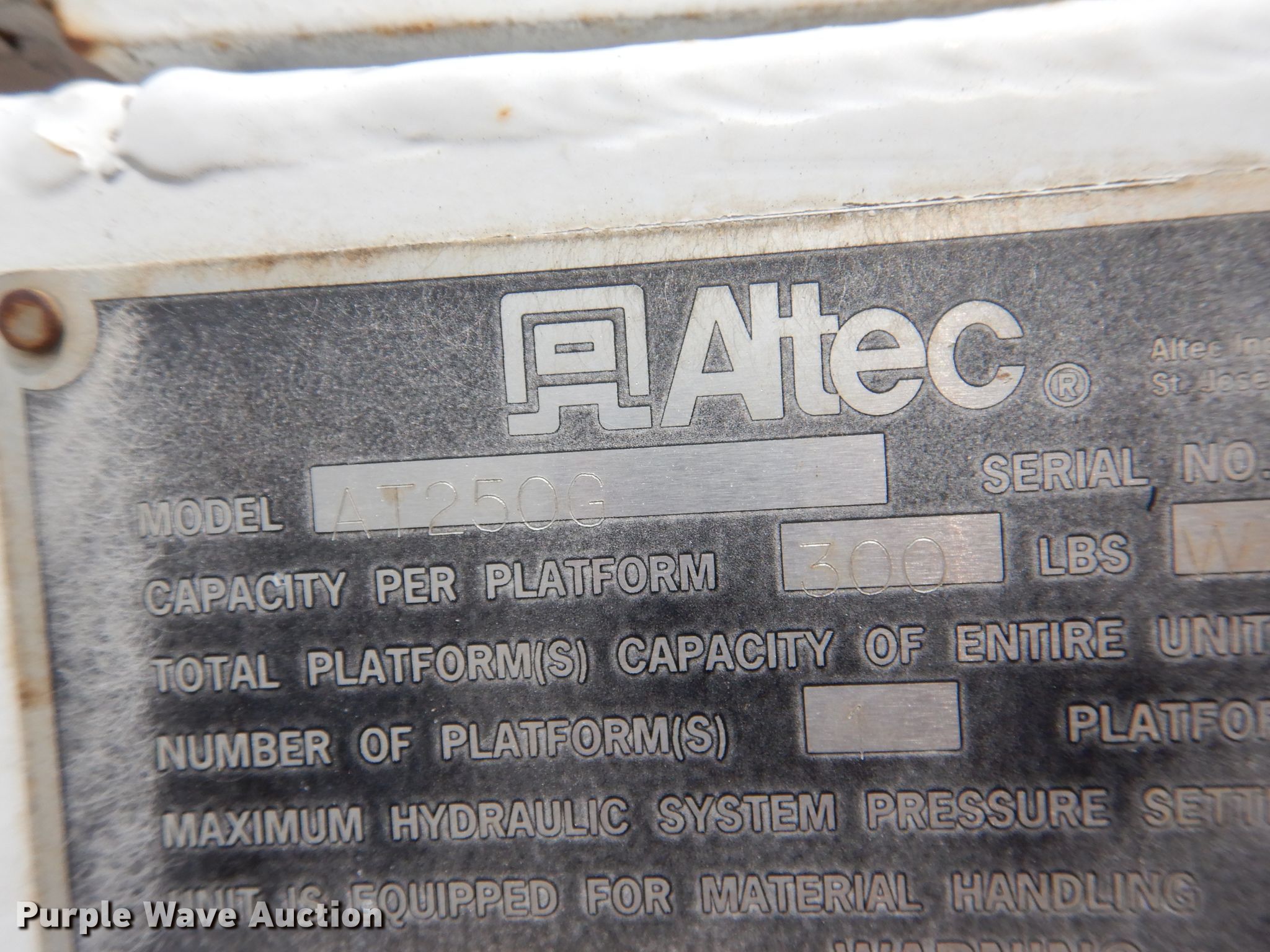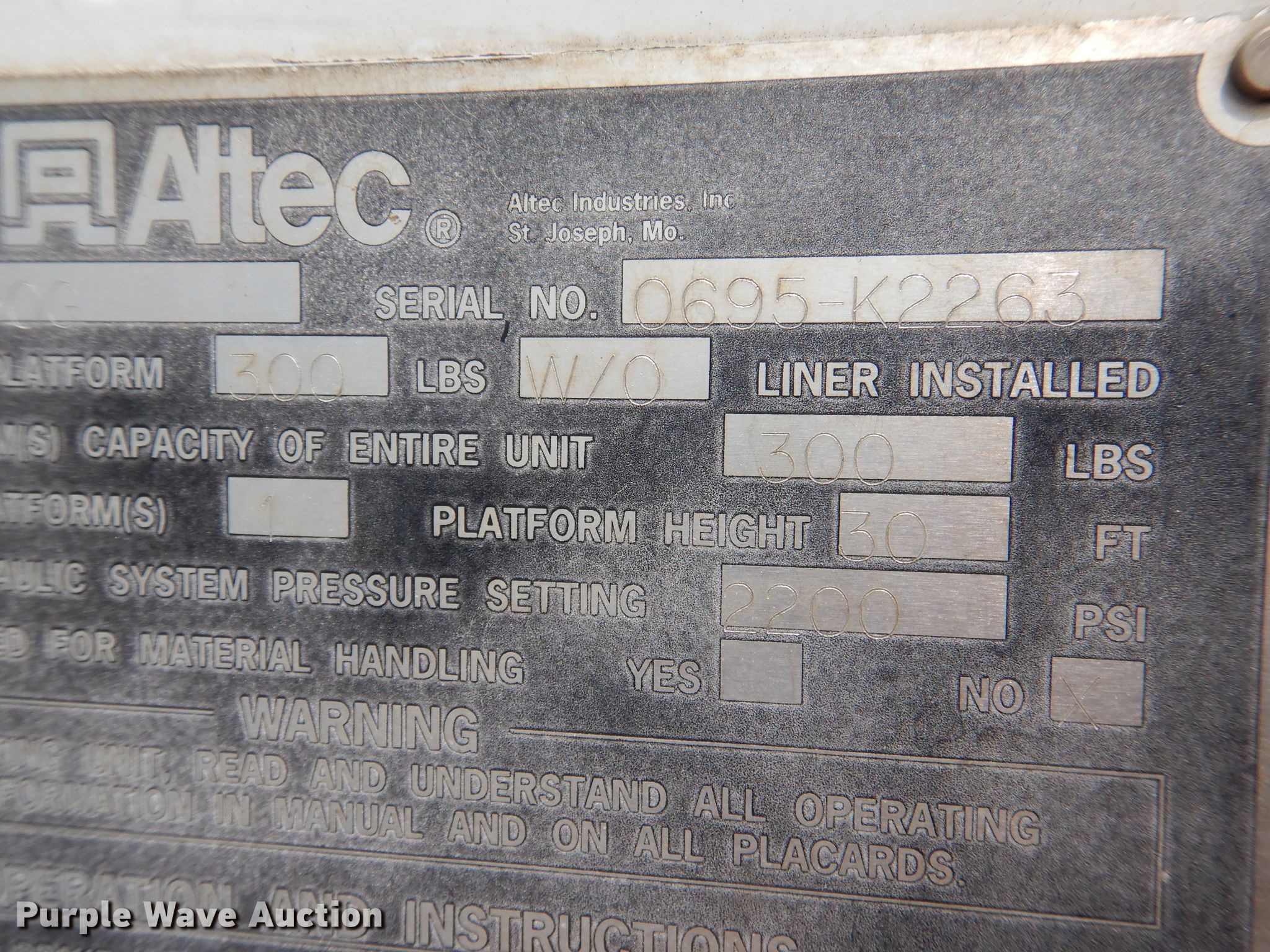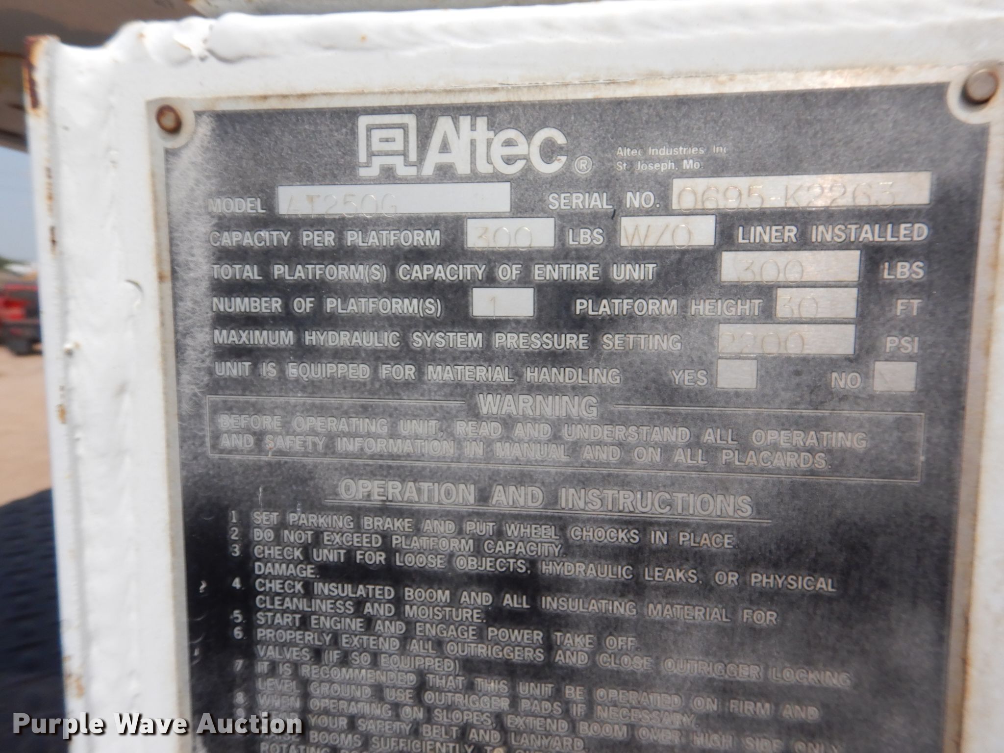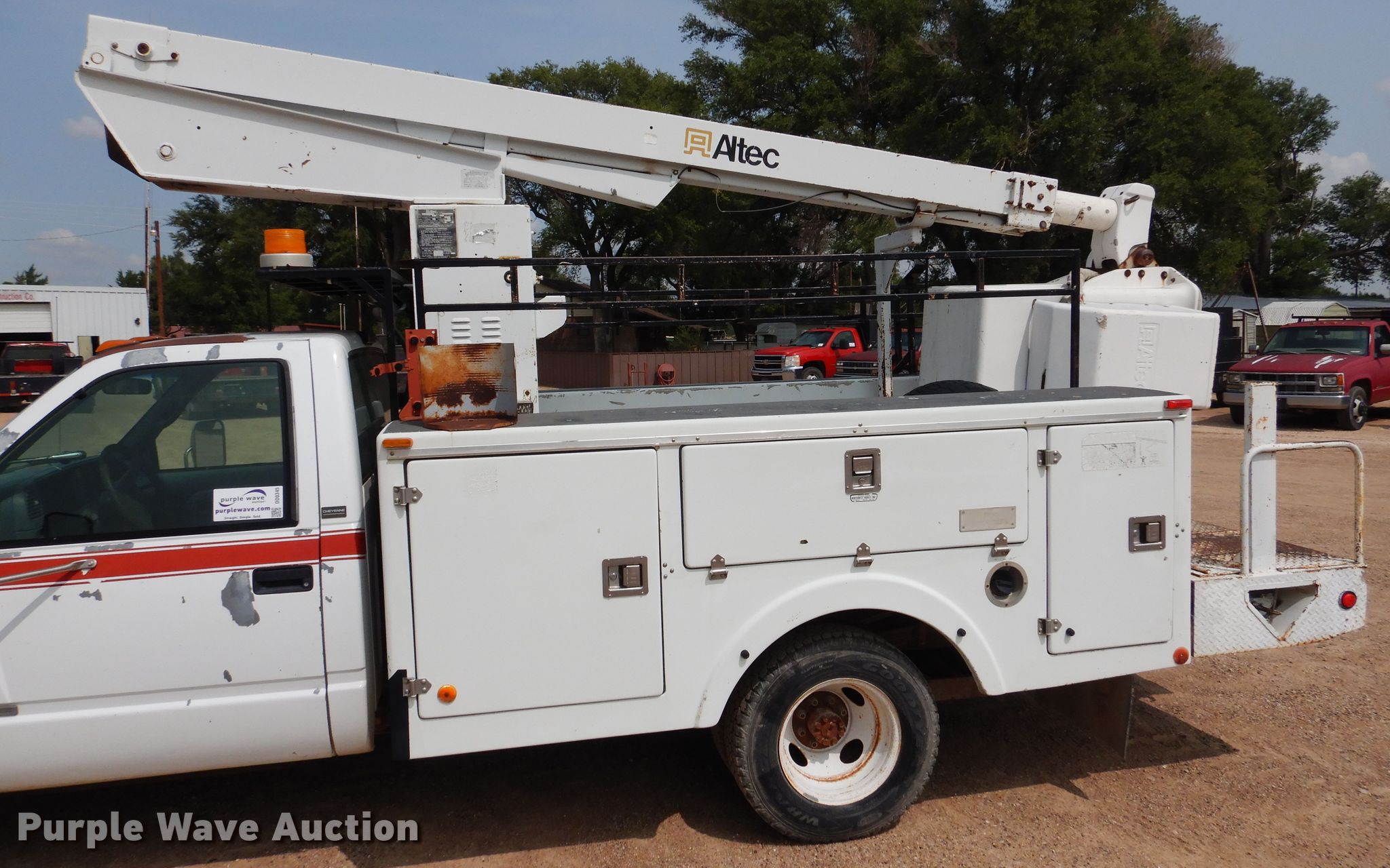 1995 Chevrolet C3500 bucket truck. 208,948 miles on odometer. Engine Displacement: 7.4L OHV 16V, Cylinders: 8, Fuel type: Gas. Transmission Manual, Speed: 5. Chassis Four wheel drive, Axles: Single, Suspension: Spring, Brakes: Hydraulic, PTO. Interior AC, Heat. Operational Utility bed Altec, Serial: 37-64987, Length: 12', Boom Altec AT250G, Serial: 0695-K2263, Boom length: 13', Maximum lift capacity: 400 lbs, Maximum lift height: 30', Boom type: Insulated, Telescopic, Man basket, Boom controls Ground, Platform/ basket.. Tires Size: 225/75R16. Notes Windshield chipped or cracked. Oklahoma title. Title distribution may be delayed up to 14 days from verification of funds. 1GBJK34N6SE222560. Panhandle Construction Services, Inc. - Open inspecton Oct. 28. 3021 County Road T. Guymon, OK 73942