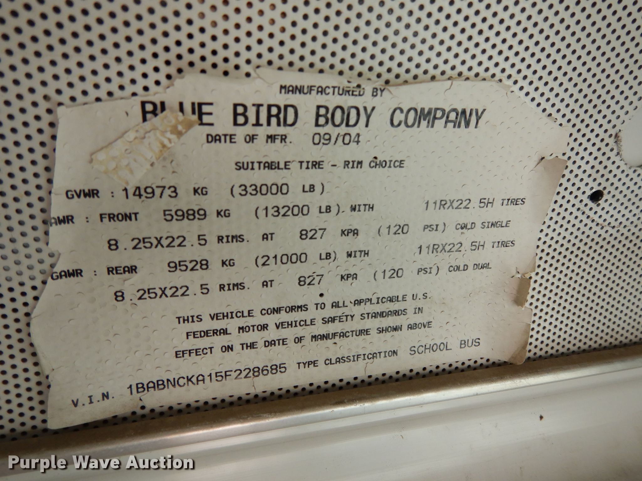 2005 Blue Bird school bus. Unknown miles on odometer, Unit #: 51177. Engine Caterpillar C7 Acert, Displacement: 7.2L, Cylinders: 6, Fuel type: Diesel. Transmission Automatic. Chassis Axles: Single, Suspension: Spring, Brakes: Air, GVWR: 33,000 lbs, Wheelbase: 234". Interior Heat, Passengers: 84, Seats Child safety seats: 4. Tires Size: 11R22.5. Notes Non-operational odometer. Kansas title. Mileage has not been verified. Exempt will be written in the odometer disclosure on the title. 1BABNCKA15F228685. USD 385 Andover Public Schools. Andover, KS 67002