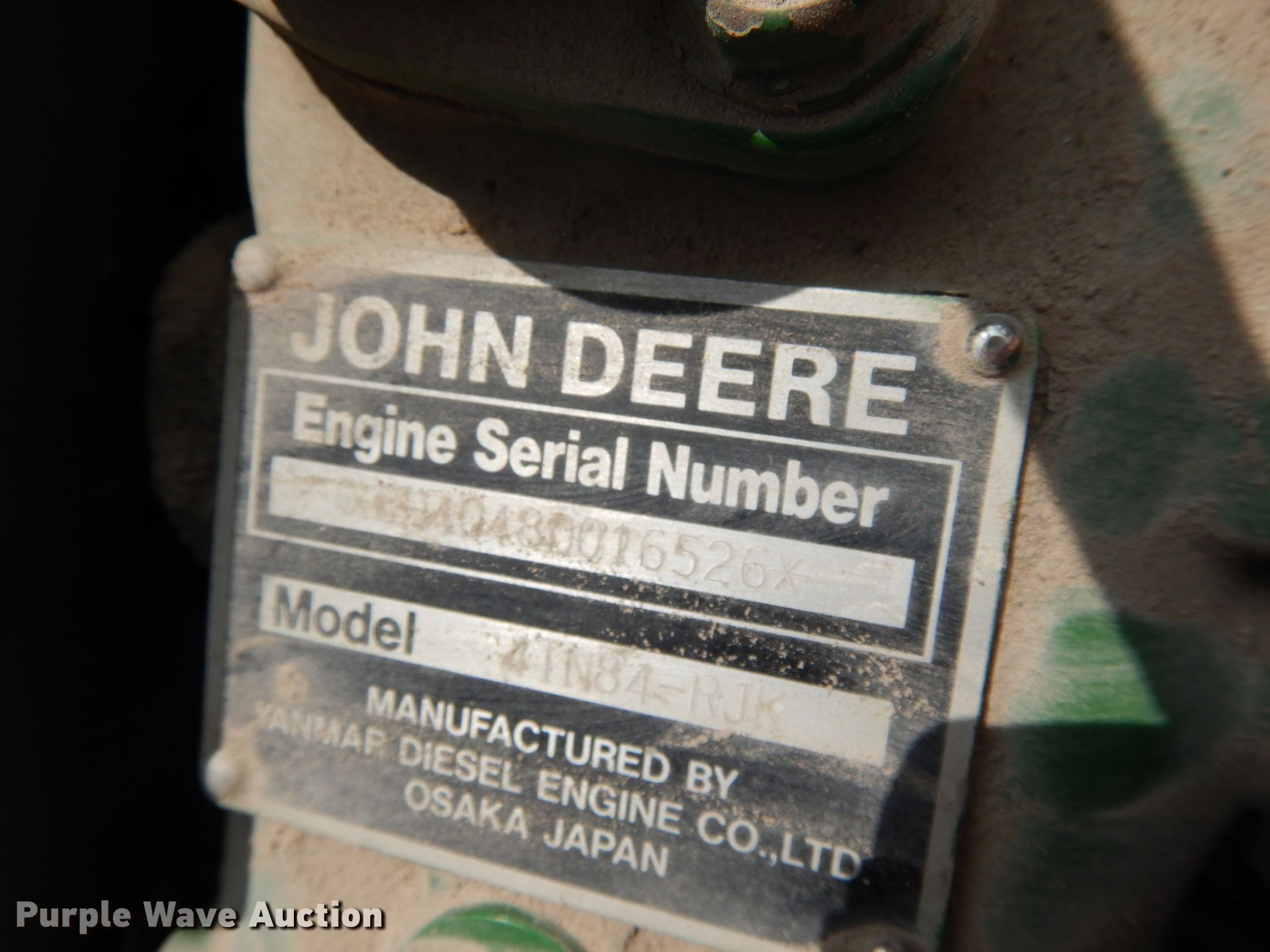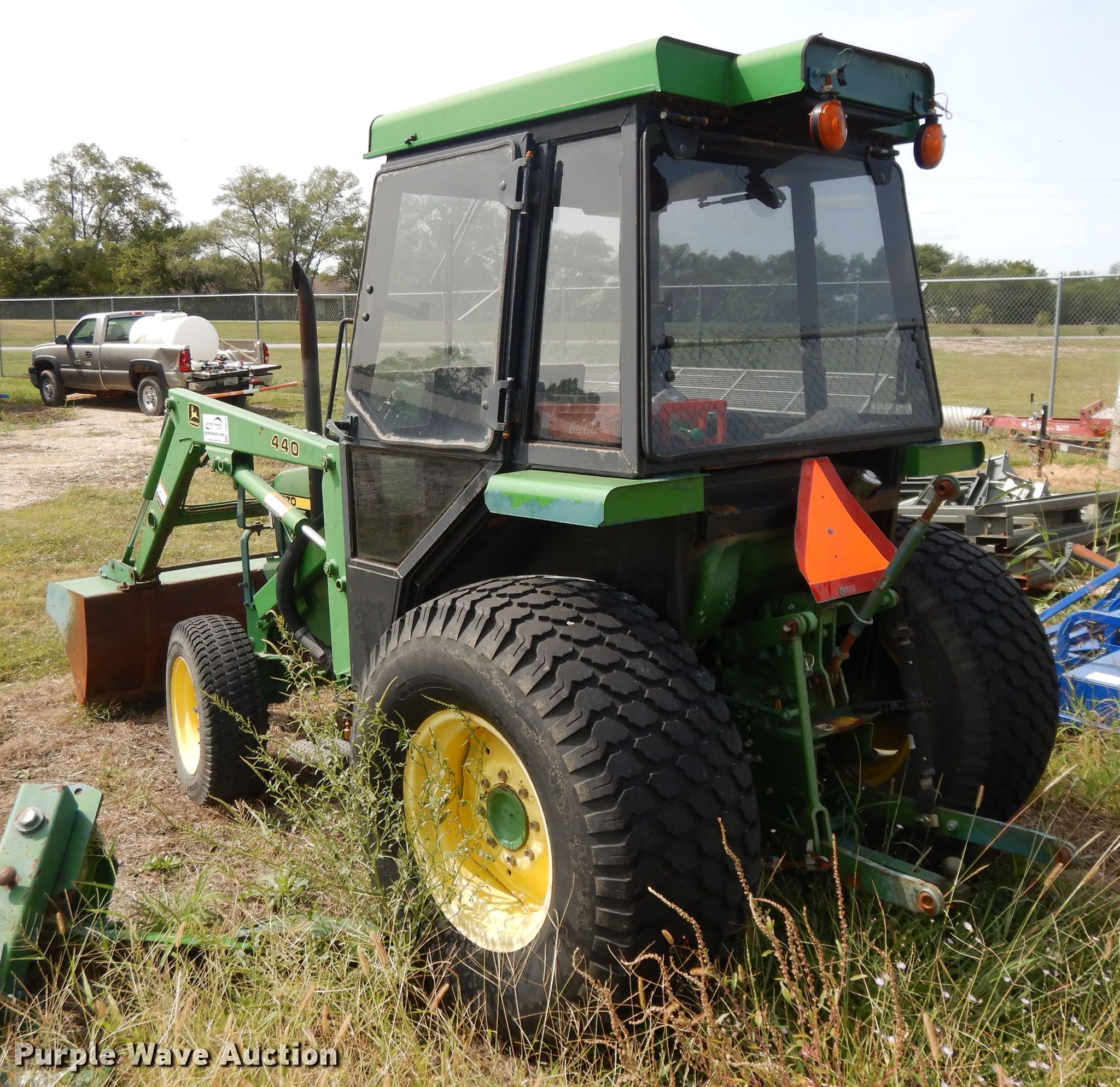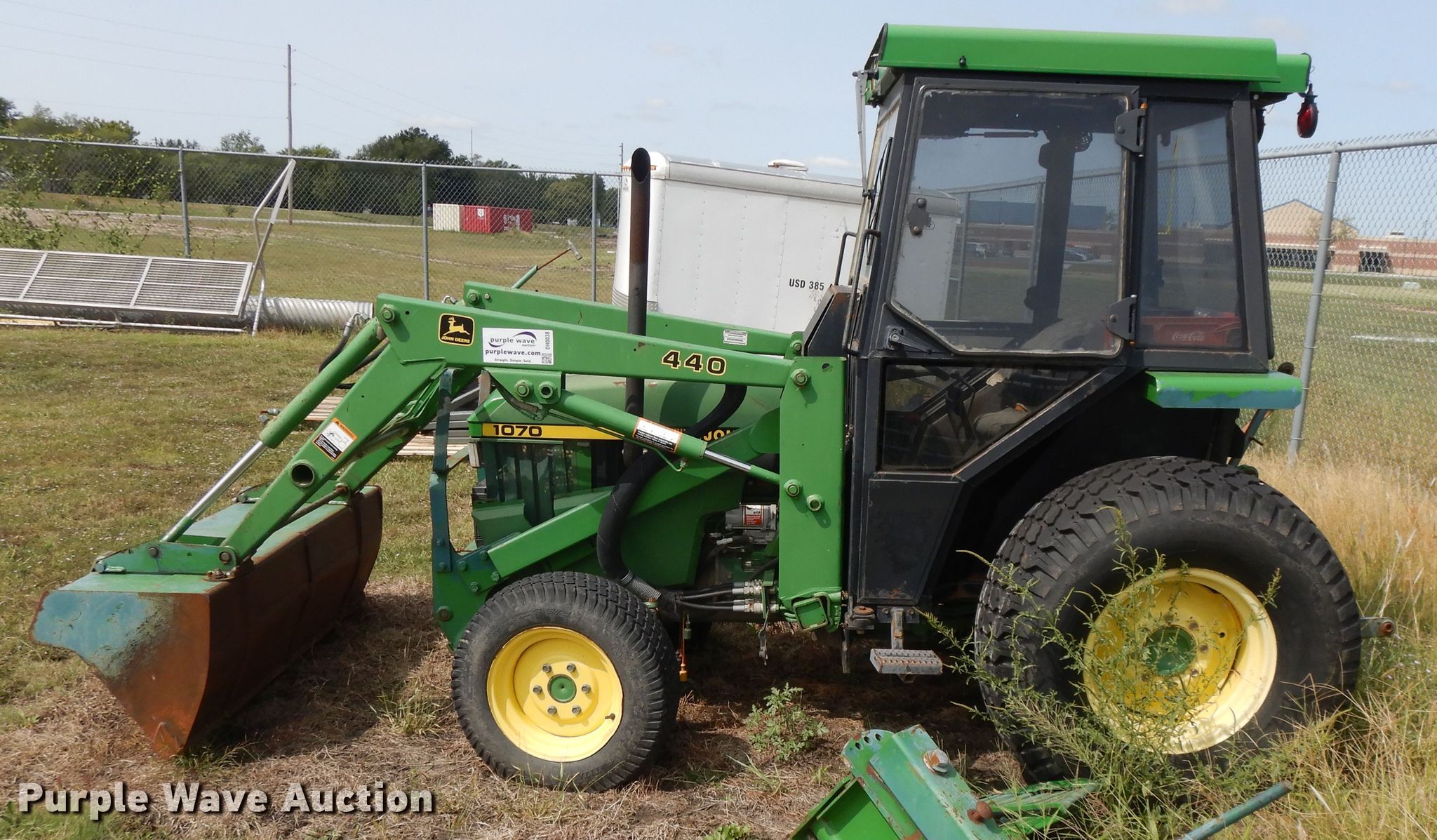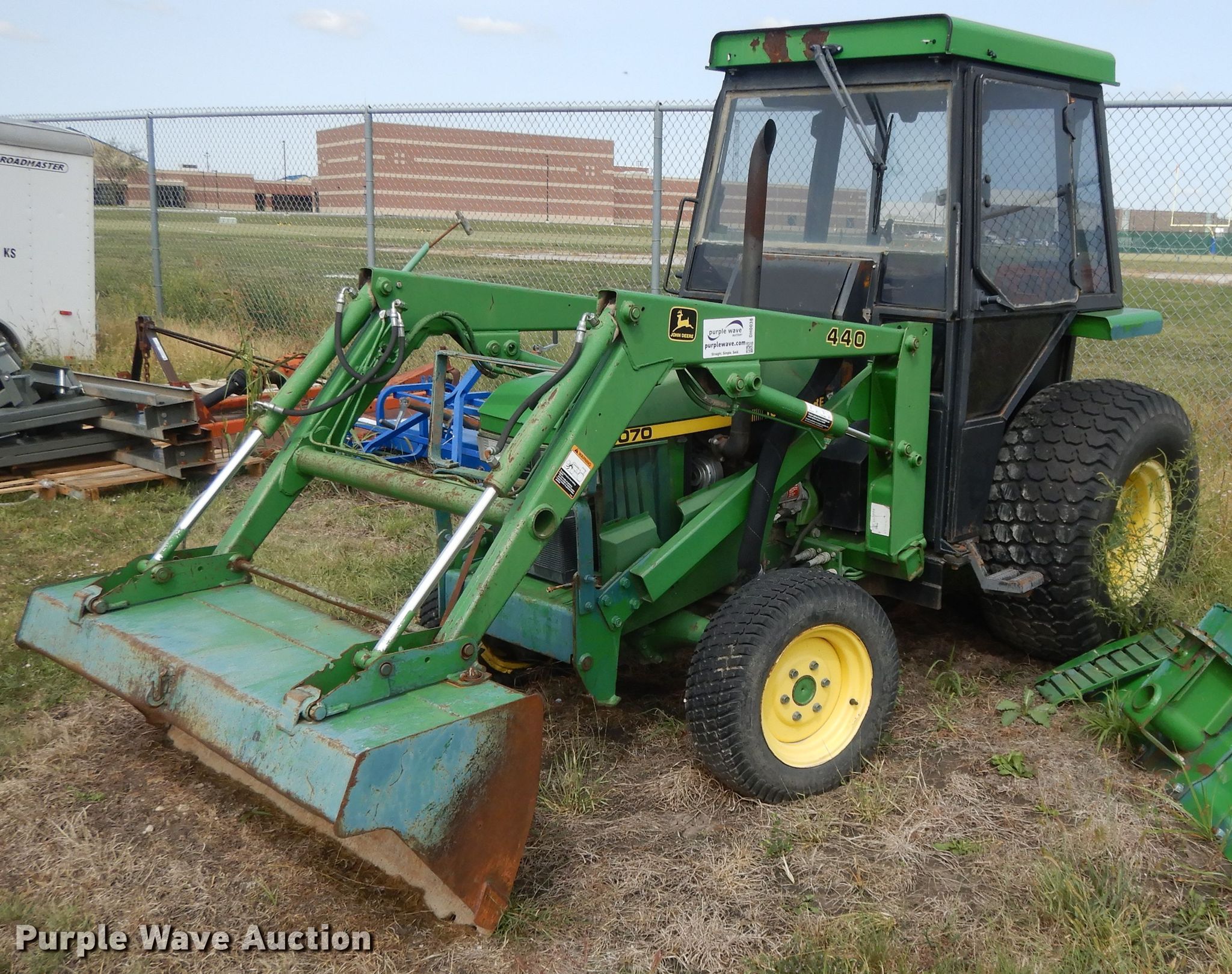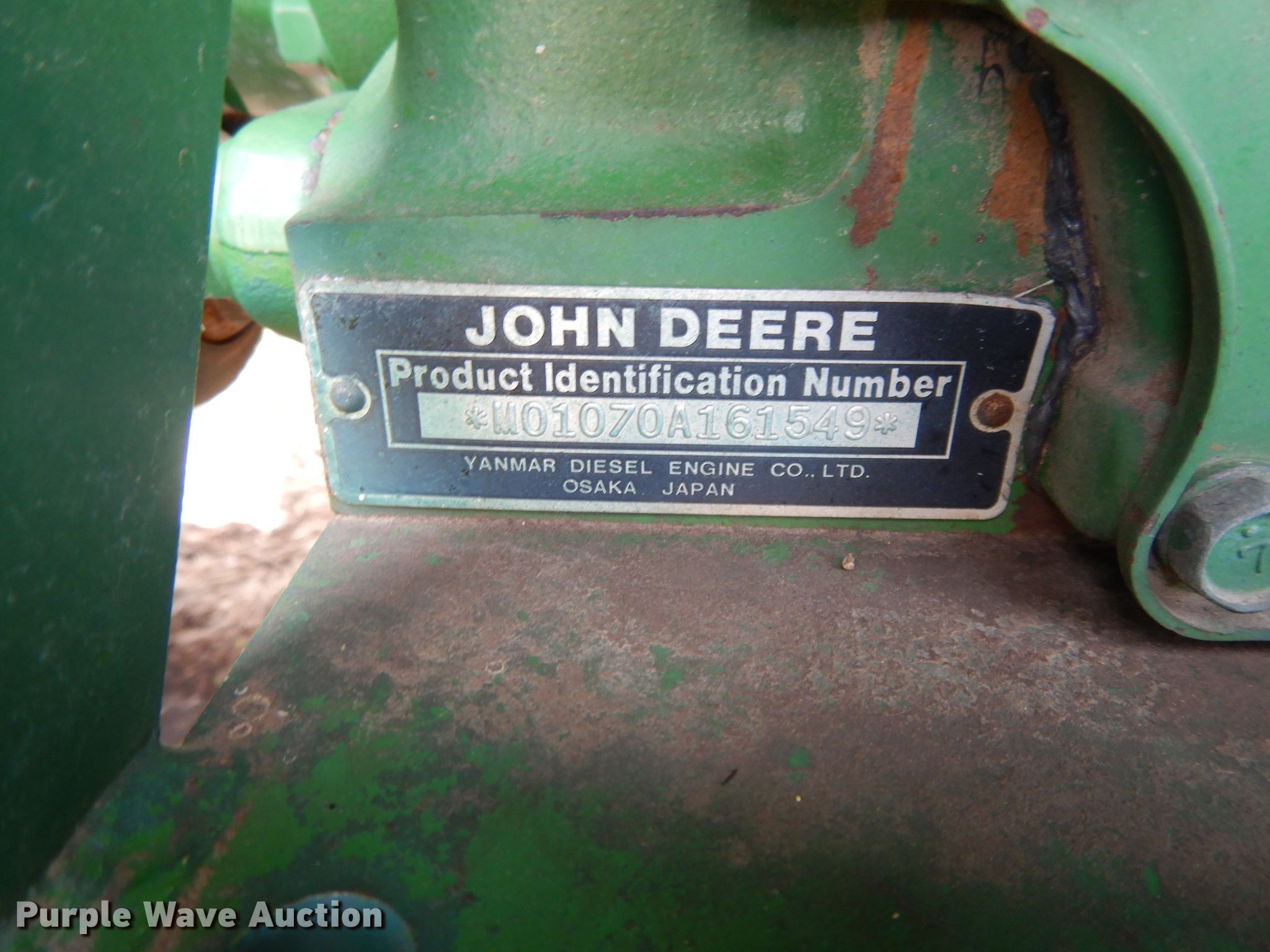 John Deere 1070 tractor. 1,564 hours on meter. Engine Yanmar 4TN84-RJK, Serial: CH4048D016526, Cylinders: 3, Fuel type: Diesel. Transmission Manual, 5F - 1R. Operational PTO: 540, Three point Top link, Loader John Deere 440, Controls: Joystick, Bucket Width: 62", 59"W blade Three point, Manual angle adjustment. Tires Front: 27x8.50R15, Rear: 44x18.00-20, Wheelbase: 68". Notes Non-operational unit. USD 385 Andover Public Schools. Andover, KS 67002