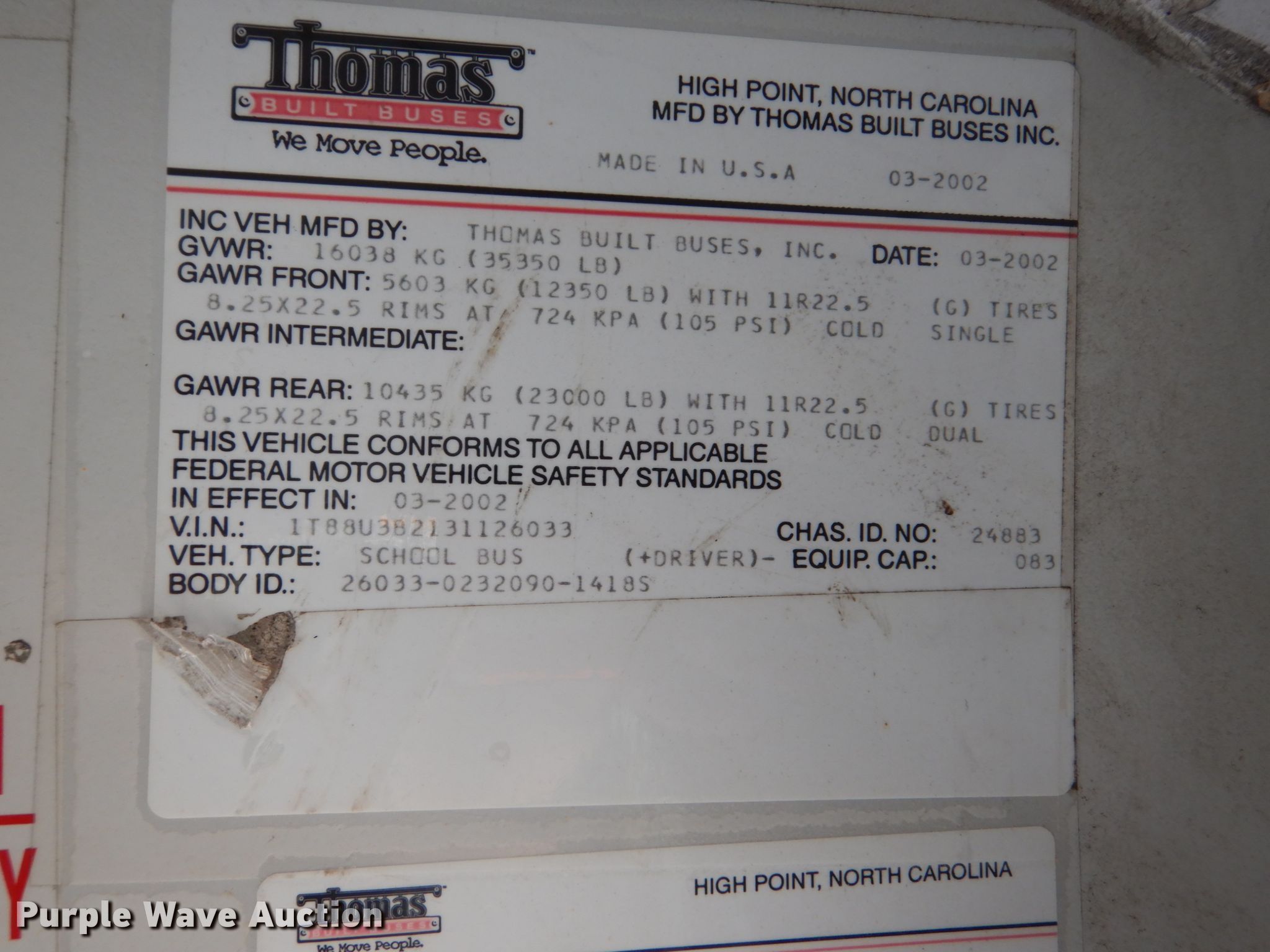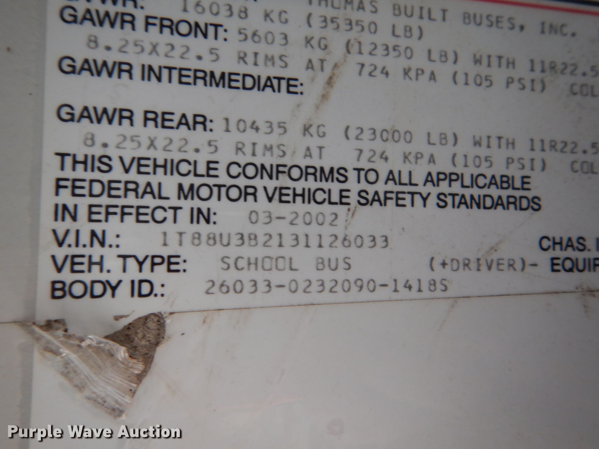 2003 Thomas Built Saf-T-Liner MVP EF school bus. 135,567 miles on odometer, Engine hours: 15,386, Unit #: 662. Engine Cummins , Cylinders: 6, Fuel type: Diesel. Transmission Automatic. Chassis Axles: Single, Suspension: Air, Brakes: Air, GVWR: 35,350 lbs. Interior AC, Heat, Heated mirrors, Electric passenger sliding door, Passengers: 83, Seats Adult seats: 28. Tires Size: 11R22.5. Notes Check engine light on, Non-operational brakes. Iowa title. Title distribution may be delayed up to 30 days from verification of funds. 1T88U3B2131126033. Des Moines Public Schools. 1915 Prospect Rd. Des Moines, IA 50310