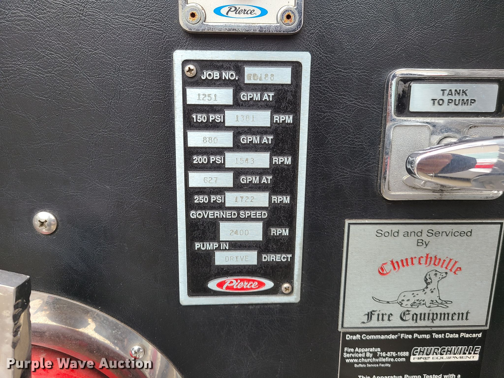 1999 Pierce Sabor pumper fire truck. 21,089 miles on odometer. Engine Cummins ISC, Displacement: 8.3L, Cylinders: 6, Fuel type: Diesel. Transmission Automatic. Chassis Suspension: Spring, Brakes: Air, GVWR: 43,000 lbs. Interior Heat. Operational Pump 1250gpm, PA/ siren controls, Generator Honda EM6500SX gas engine. Tires Front: 315/80R22.5, Rear: 12R22.5. Notes Water hose, tools, and contents not included. Missouri title. Title distribution may be delayed up to 14 days from verification of funds. 4P1CT02M7XA001341. City of North Kansas City. 2010 Howell St. North Kansas City, MO 64116