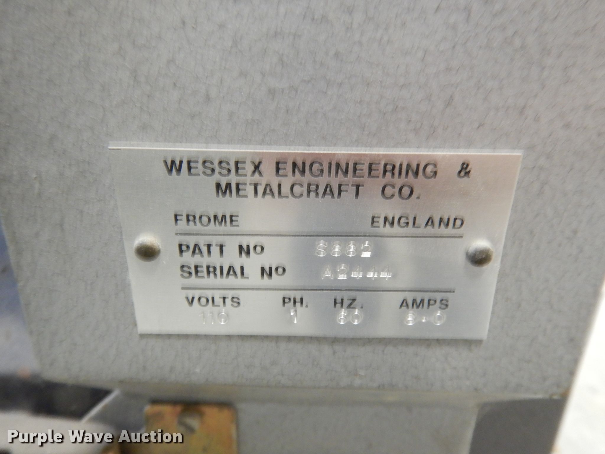 Purple Wave is selling a used Tools in Kansas. This item is a Wessex Engineering & Metalcraft Co. machine with the following: 110V, 8 amps, Single phase, Unknown operating condition, Serial A2444