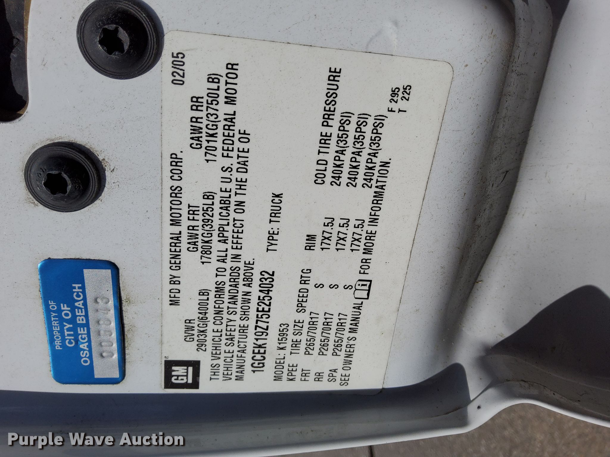2005 Chevrolet Silverado 1500 Ext. Cab pickup truck. 93,511 miles on odometer. Engine Displacement: 5.3L V8 OHV 16V FFV, Cylinders: 8, Fuel type: Gas. Transmission Automatic, Four wheel drive. Interior AC, Heat, Power windows, Power locks, Cruise control. Tires Size: 265/70R17. Notes Safari topper Length: 96". Missouri title. 1GCEK19Z75E254032. City of Osage Beach. 1000 City Pkwy. Osage Beach, MO 65065