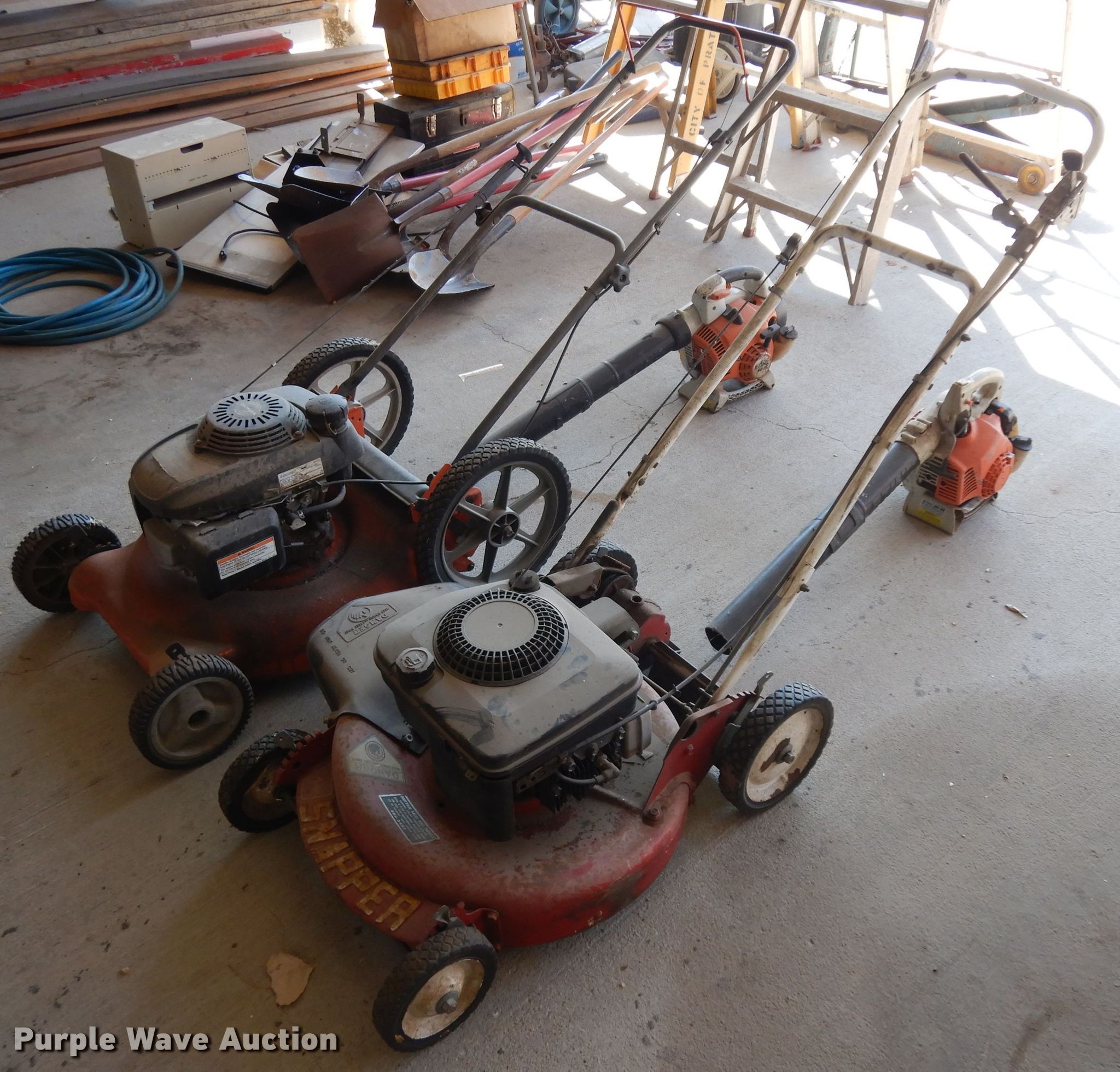 Purple Wave is selling a used Lawn and Garden in Kansas. This item is a Lawn equipment with the following: (2) push mowers, Husqvarna, Snapper, (2) Stihl leaf blowers