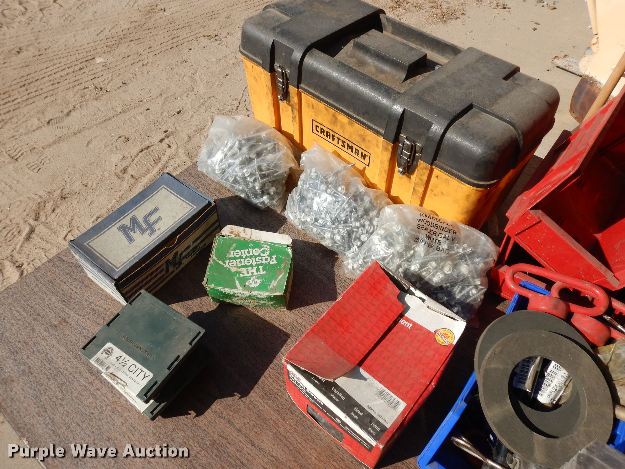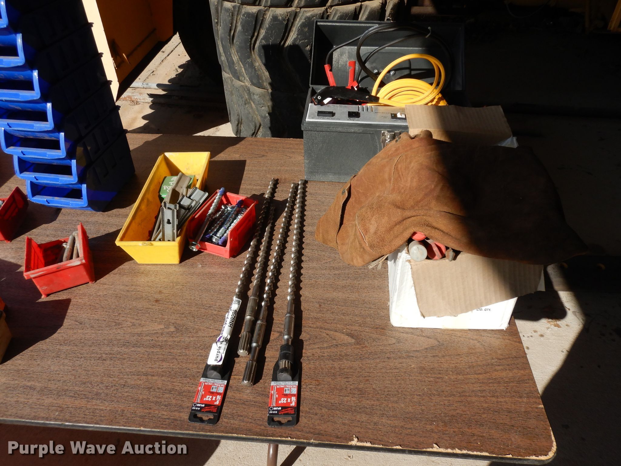 Purple Wave is selling a used Tools in Kansas. This item is a Bolt bins with the following: Bolt bin rack, Toolbox, Bolts, Screws, Masonry bits, Service-Mate P700 power source