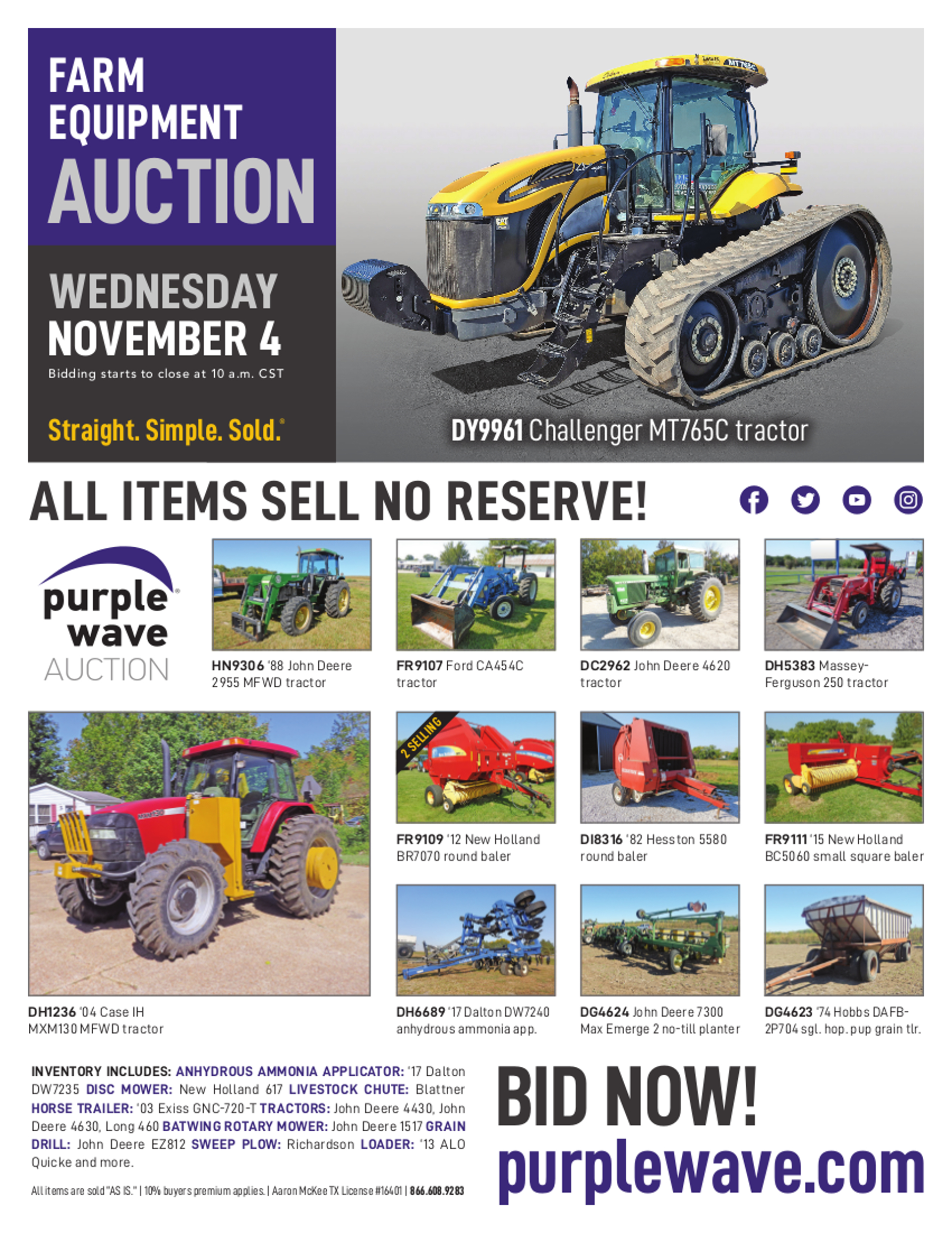 This auction is conducted by Purple Wave, Inc., whose home office is 825 Levee Drive, Manhattan, Kansas. Aaron McKee, Texas auctioneer license # 16401, operates Purple Wave, Inc. Complaints against us may be directed to the Texas Department of Licensing and Regulation, P.O. Box 12157, Austin, Texas 78711, (512) 463-6599. For additional required information, see the attached document.