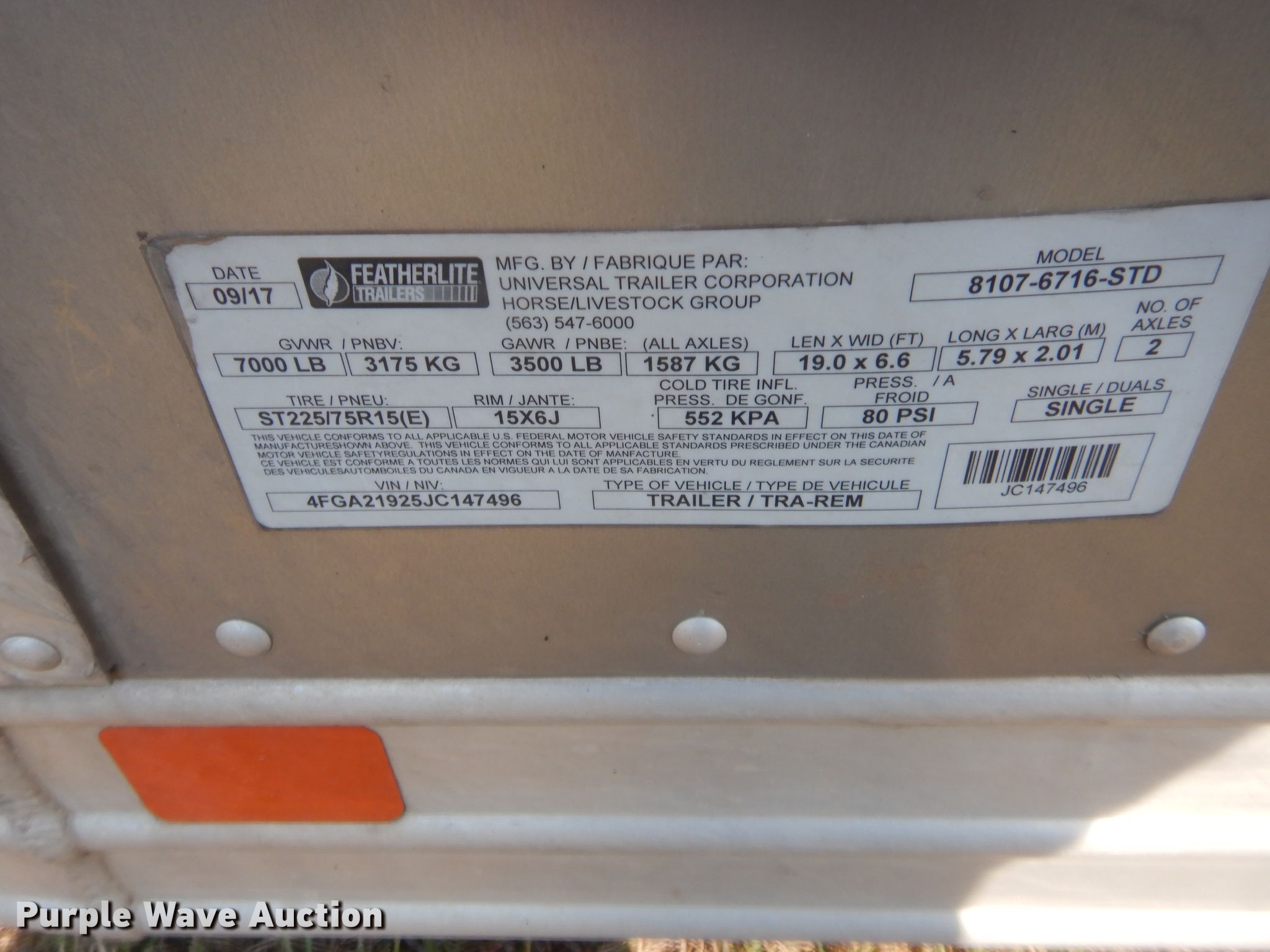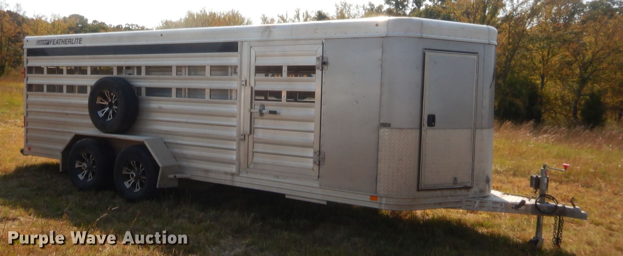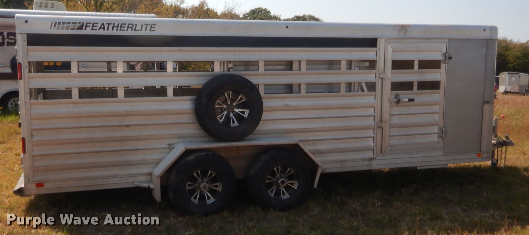 Purple Wave is selling a used Livestock Trailer in Oklahoma. This item is a 2018 Featherlite 8107-6716-STD livestock trailer with the following: 24'L x 102"W overall, 19'L x 79"W body, 5'3"H inside, (2) gates, 2" ball hitch, Spring suspension, Electric brakes, Tandem axle, 225/75R15 tires, GVWR 7,000 lbs, One gate unattached, but included in trailer, Collision damage, Insurance salvage, Claim# 2020812860