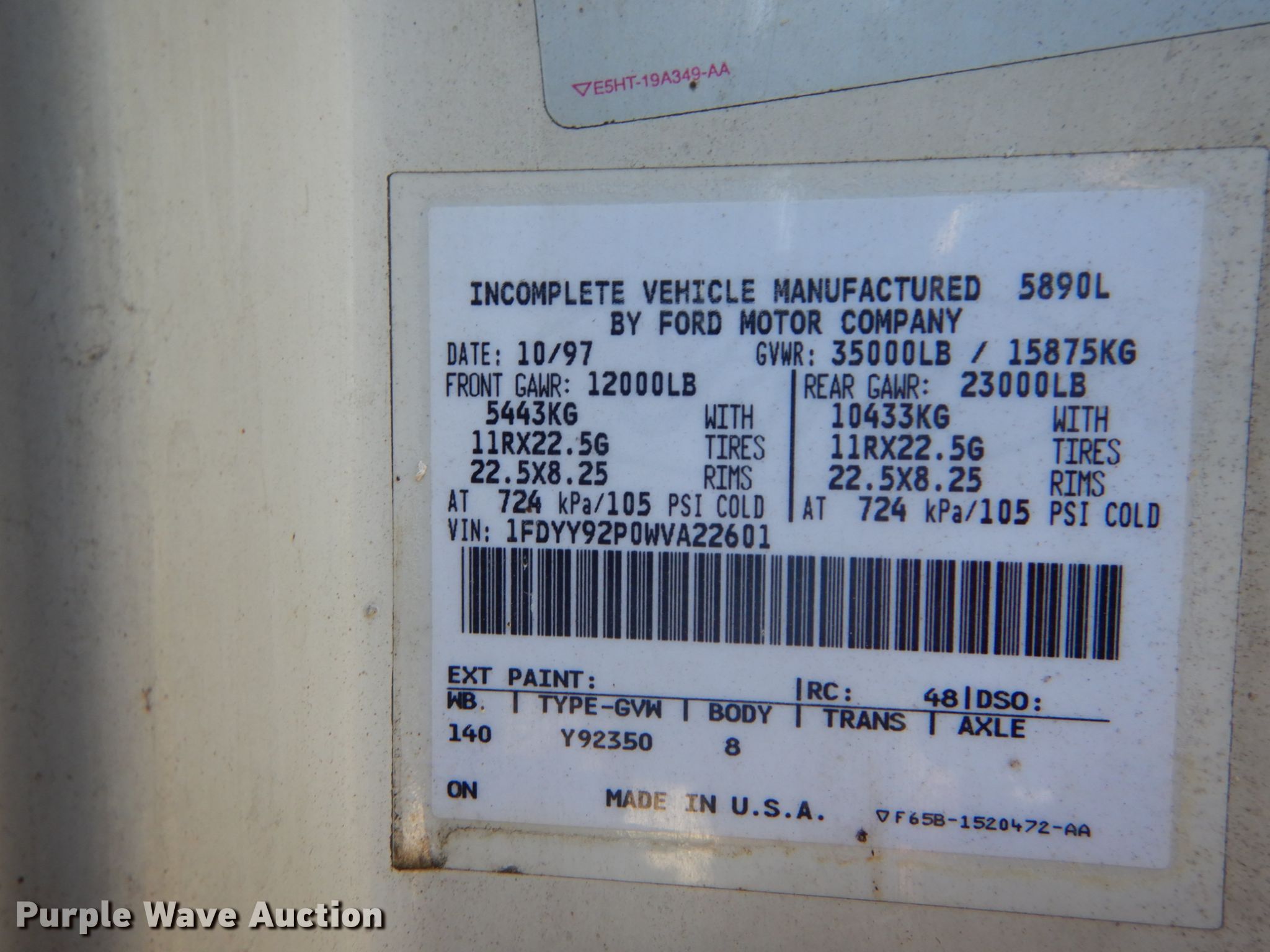 1998 Ford LA9000 semi truck. 957,938 miles on odometer. Engine Cummins CM11, Cylinders: 6, Fuel type: Diesel. Transmission Eaton Fuller, Manual, Speed: 7. Chassis Axles: Tandem, Tag axle, Suspension: Air, Brakes: Air, GVWR: 35,000 lbs FAWR: 12,000 lbs, IAWR: 23,000 lbs, Wheelbase: 167". Interior AC, Heat, Heated mirrors, Cruise control. Operational Deck plate: Steel, Fifth wheel type: Air operated, Sliding, Fuel tank: Dual. Tires Size: 11R22.5. Notes Power steering leak , ABS light on, Rear brakes disconnected. Michigan title. Title distribution may be delayed up to 30 days from verification of funds. 1FDYY92P0WVA22601. Hancock, MI 49930