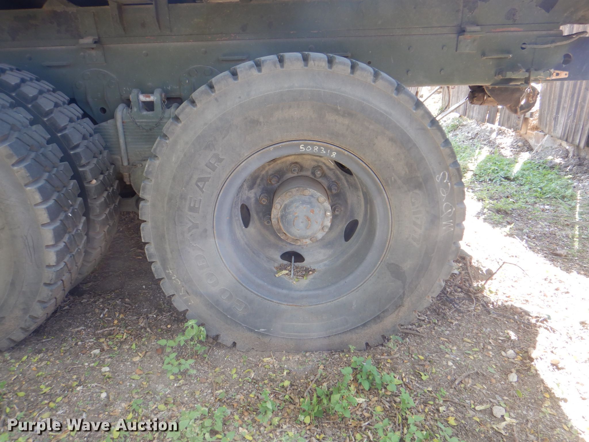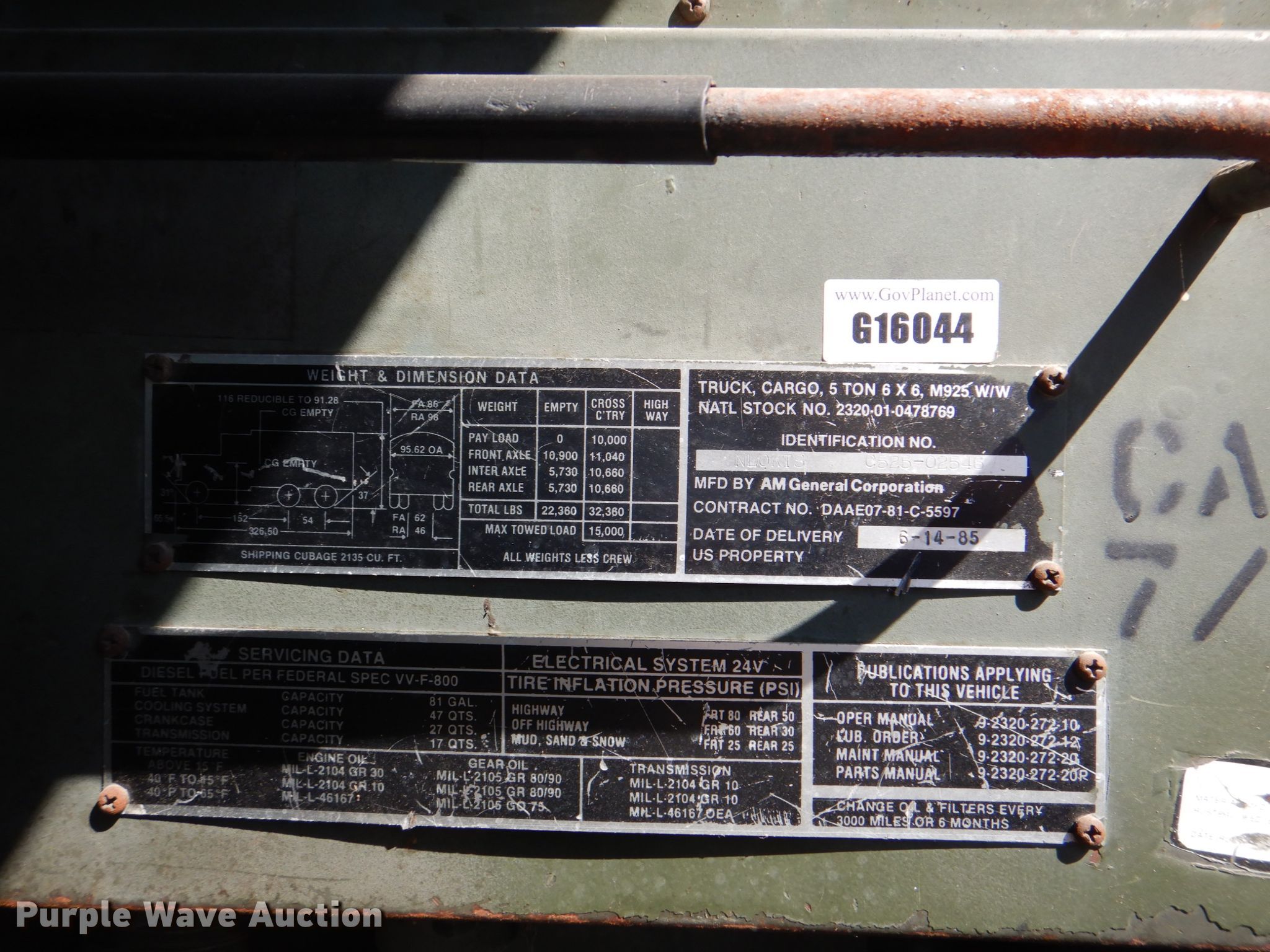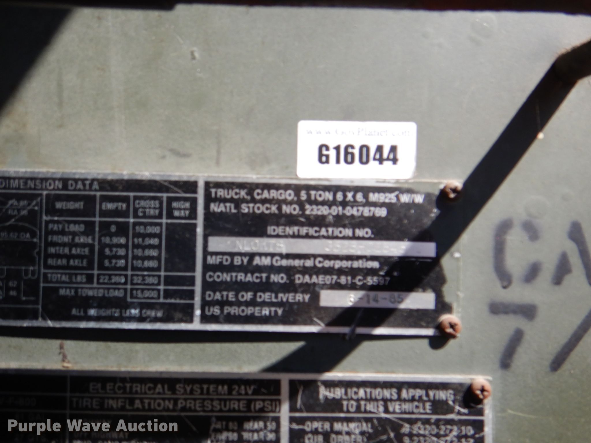 1985 Am General M925 flatbed truck. 35,614 miles on odometer, Engine hours: 1,639. Engine Cummins NHC250, Serial: 11650142, Cylinders: 6, Fuel type: Diesel. Transmission Automatic. Chassis Six wheel drive, Axles: Tandem, Suspension: Spring, Brakes: Air, PTO, GVWR: 22,360 lbs, Wheelbase: 182". Operational Flatbed Length: 14', Width: 96", Removable sides. Tires Size: 11R20, Brand: Goodyear. Notes Unknown operating condition. Texas title. Title distribution may be delayed up to 30 days from verification of funds. NL0KTSC52502546. 559 E Church St. Lewisville, TX 75057