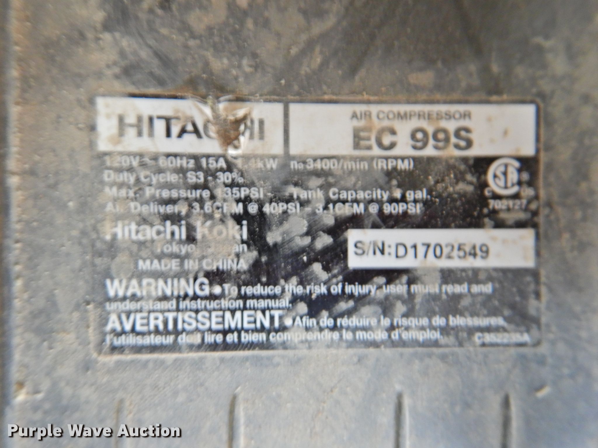 Purple Wave is selling a used Air Compressor in Texas. This item is a Hitachi EC99S air compressor with the following: Serial: D1702549