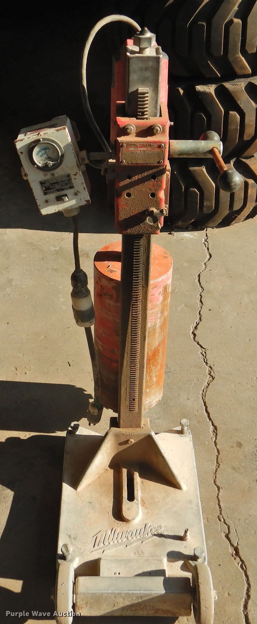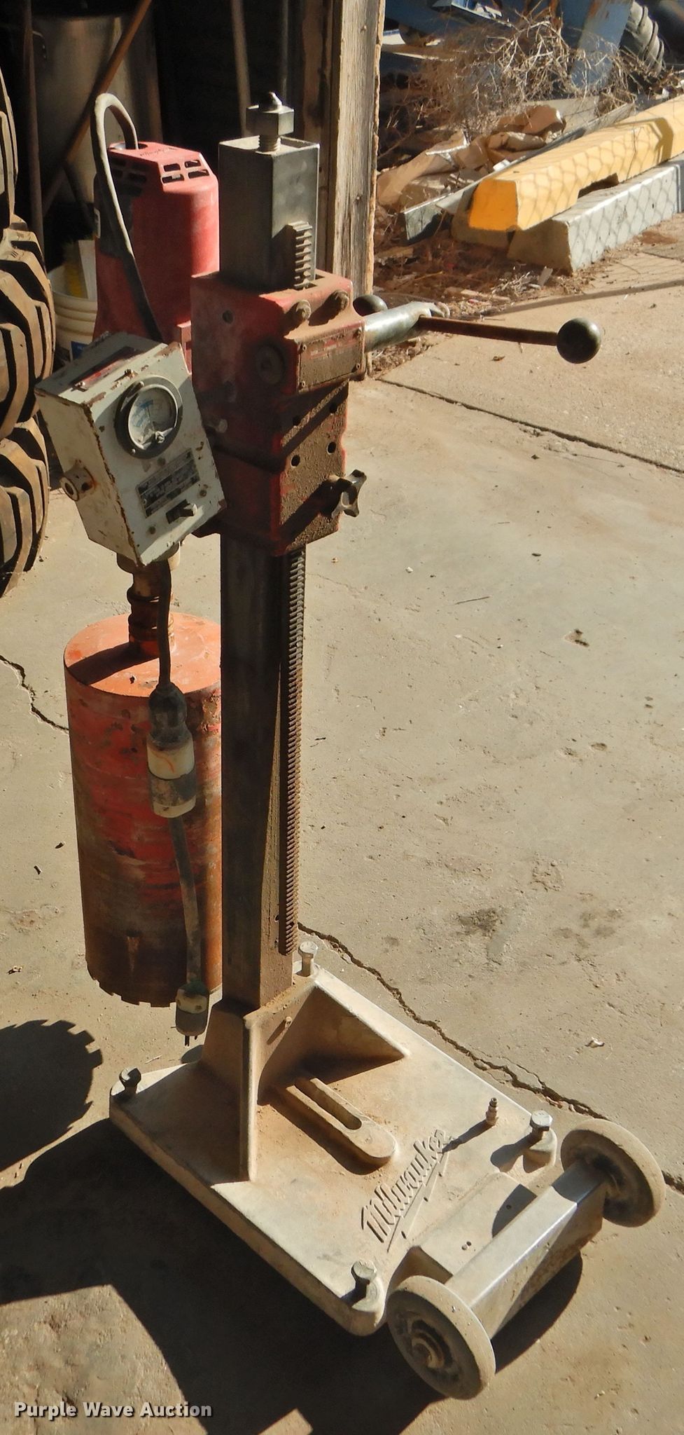 Purple Wave is selling a used Core Drill in Texas. This item is a Milwaukee Dymodrill core drill with the following: 8" bit, 2" to 10" diameter bit capacity, 1 1/4" seven spindle thread, Dymorig drill stand, Milwaukee meter box, Serial 798C602400088