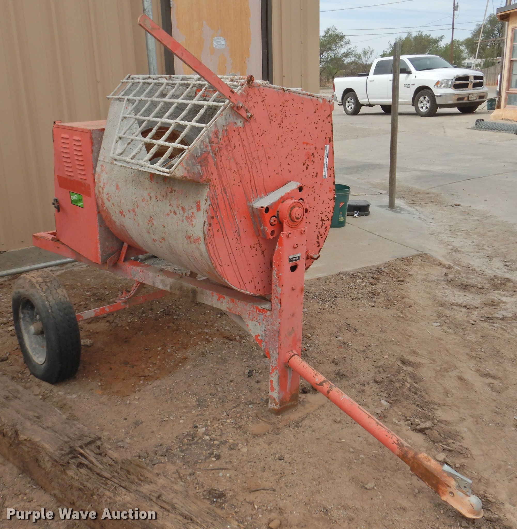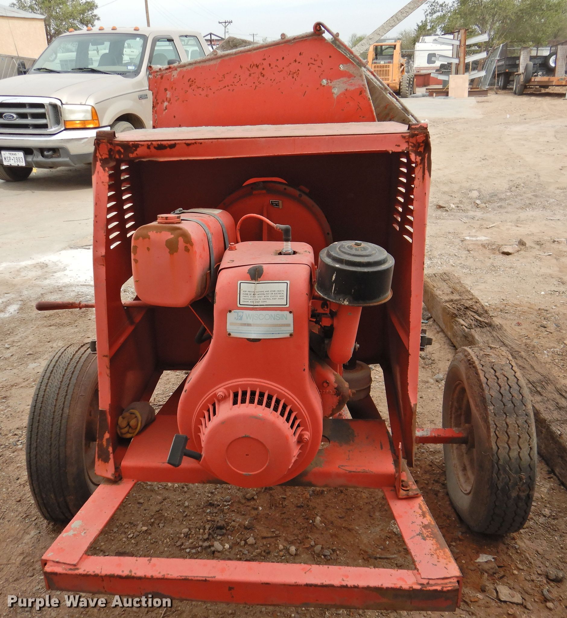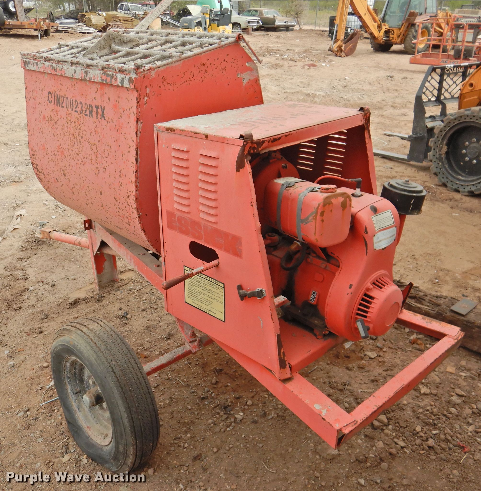 Purple Wave is selling a used Concrete Dispenser in Texas. This item is a Essick 120W concrete mixer with the following: Wisconsin AENL single cylinder gas engine, Serial 6235723, Spring suspension, A78-13 tires, Non-operational unit, Serial 82900292