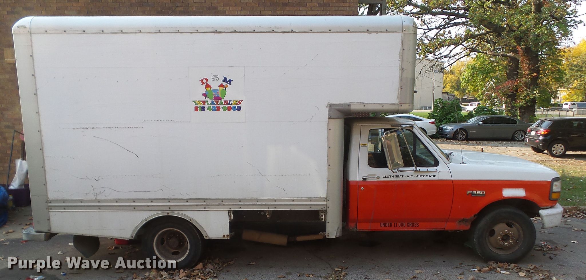 1997 Ford F350 XL box truck. 256,177 miles on odometer. Engine Displacement: 7.5L V8 OHV 16V, Cylinders: 8, Fuel type: Gas. Transmission Automatic. Chassis Axles: Single, Suspension: Spring, Brakes: Hydraulic, GVWR: 11,000 lbs, Wheelbase: 161". Interior Heat. Operational Box bed Overall length: 13'10" Floor length: 11'4", Upper storage: 2'6", Floor: Aluminum, Slider ramp Width: 24".. Tires Size: LT245/75R16. Notes Windshield chipped or cracked. Iowa title. Title distribution may be delayed up to 14 days from verification of funds. 1FDKF37G5VEB87642. DSM Inflatables. 1244 32nd St. Des Moines, IA 50311