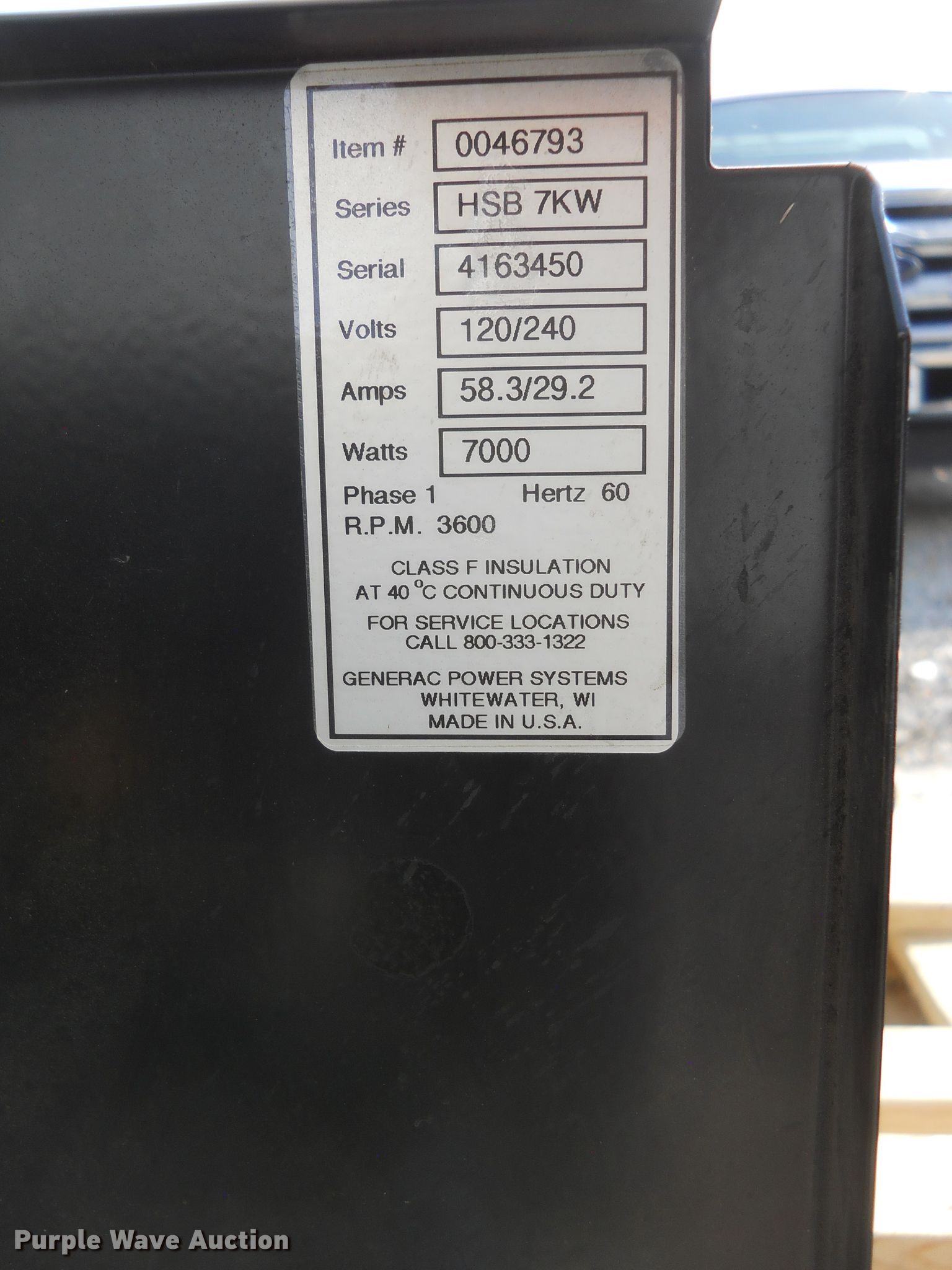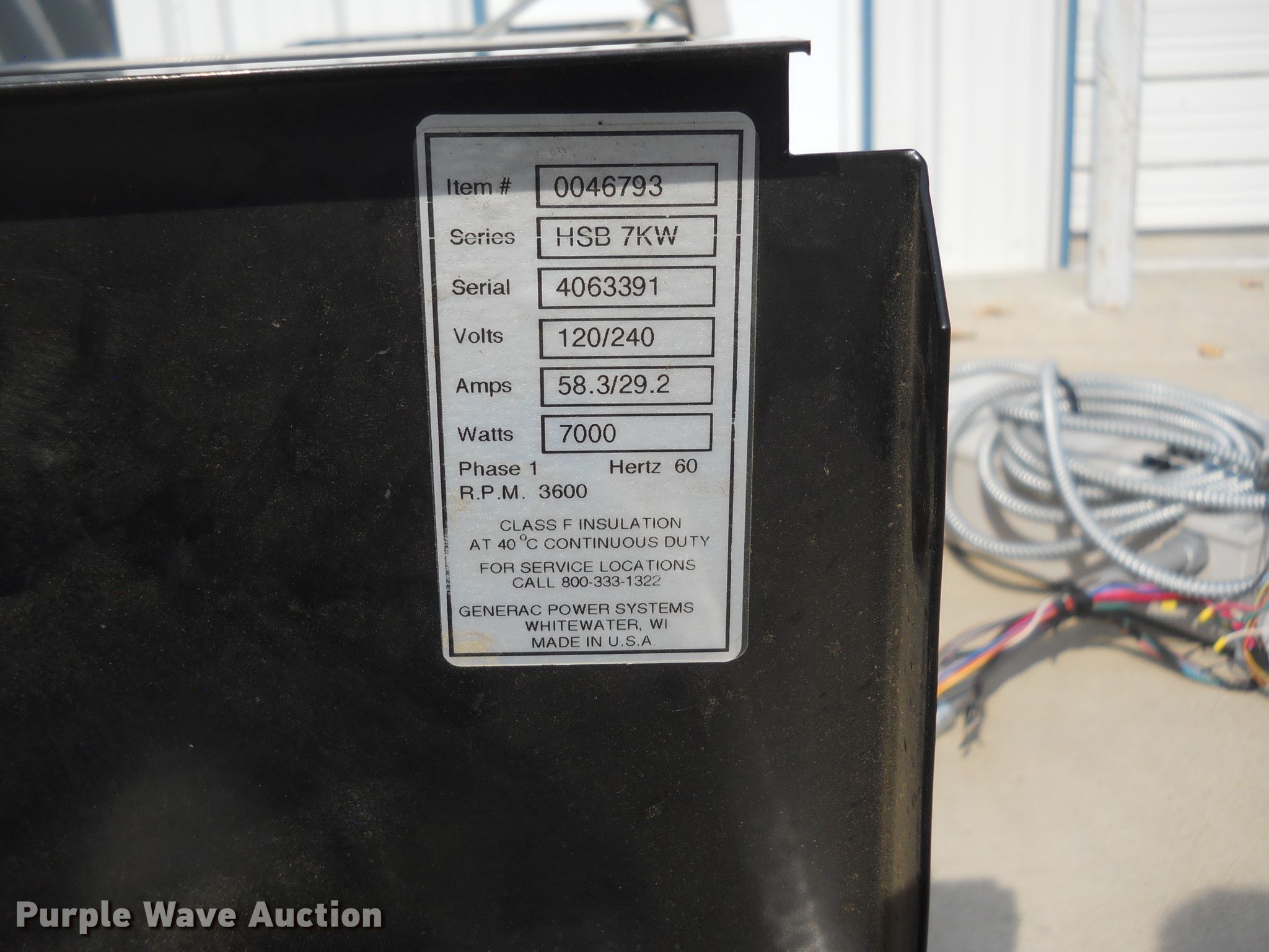 (2) Generac 0046973 generators. Serial: 4063391, 4163450. Engine Generac, Cylinders: 2, Fuel type: LPG. Operational Watts: 7,000, kW: 7, Phase: Single, Electric start. Notes Units will not generate power. Cunningham Telephone Co, Inc.. 220 W Main St. Glen Elder, KS 67446