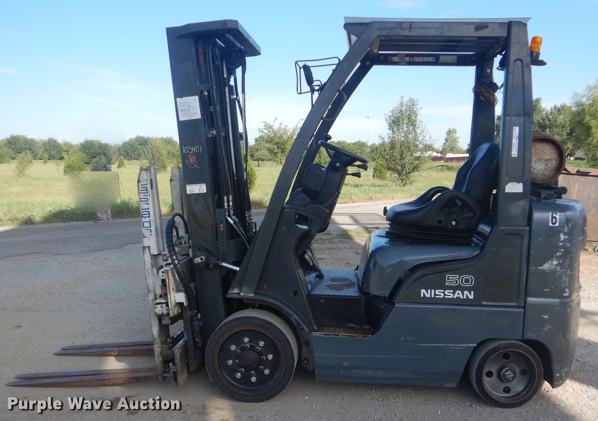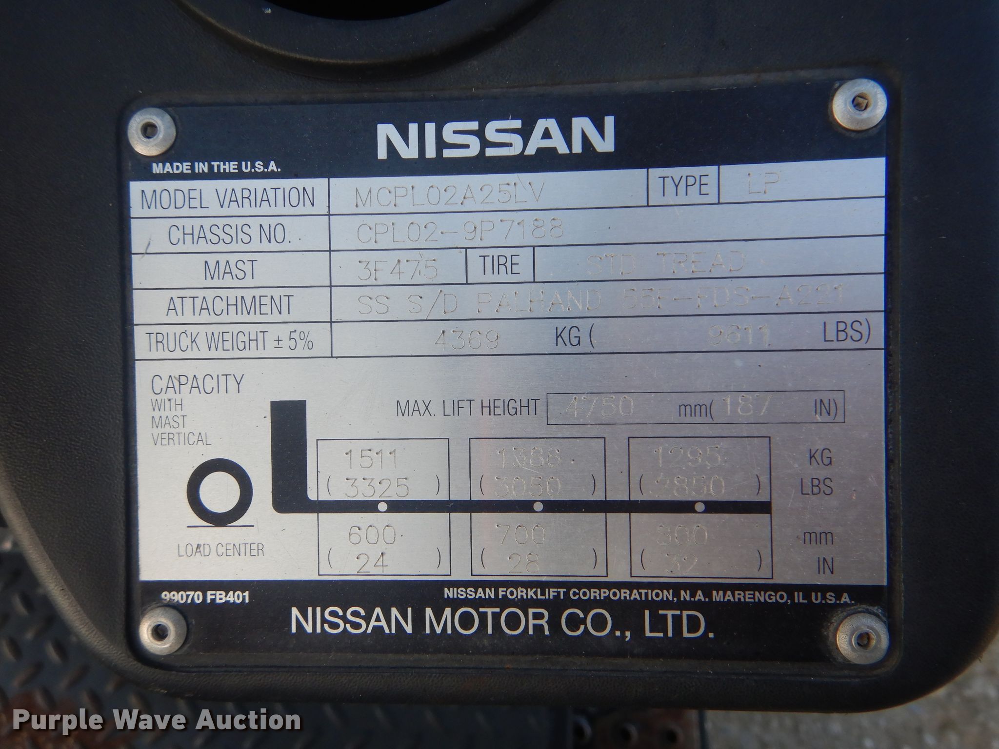 Purple Wave is selling a used Warehouse Forklift in Oklahoma. This item is a Nissan MCPL02A25LV forklift with the following: 25,829 hours on meter, Serial: CPL02-9P7188