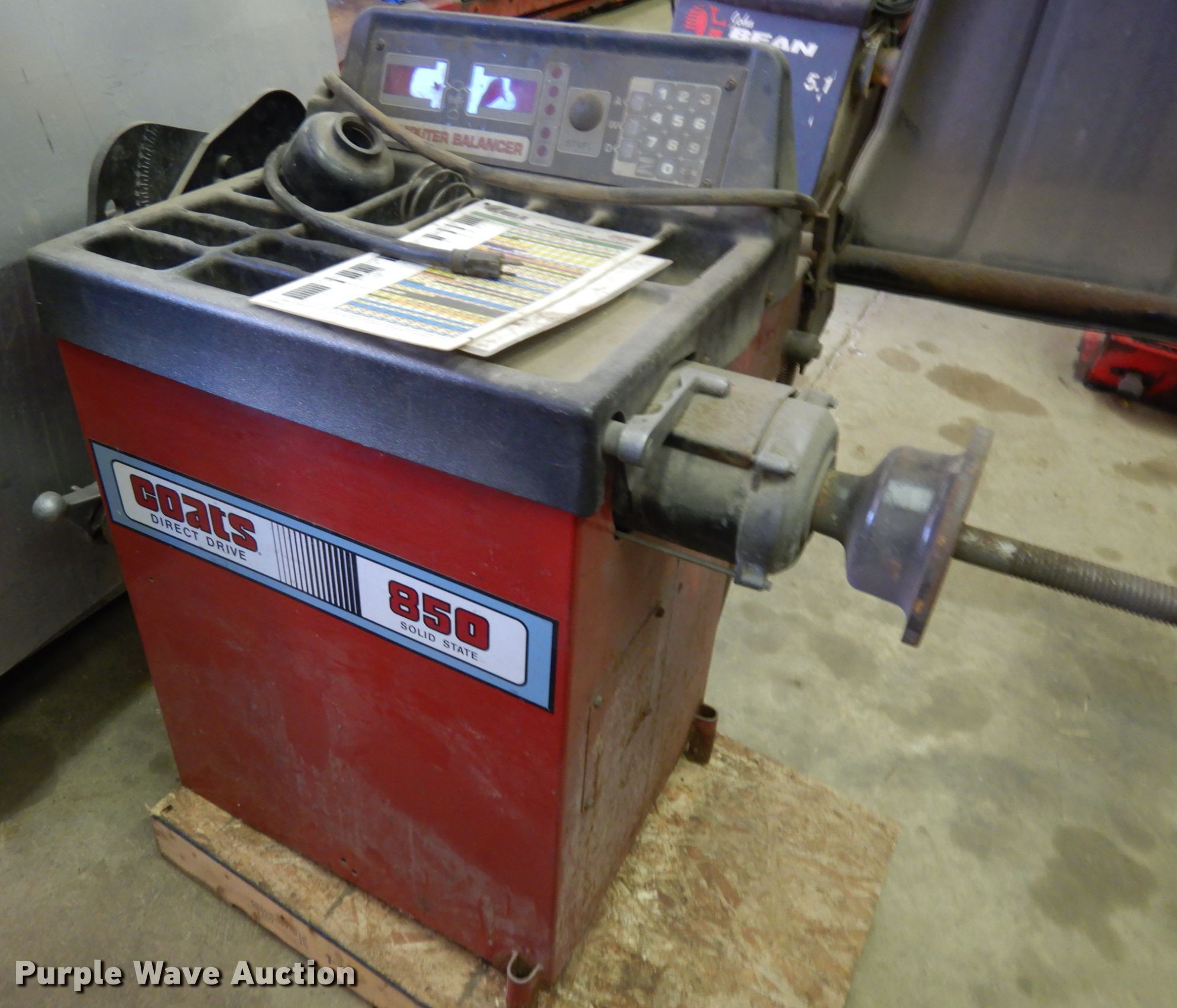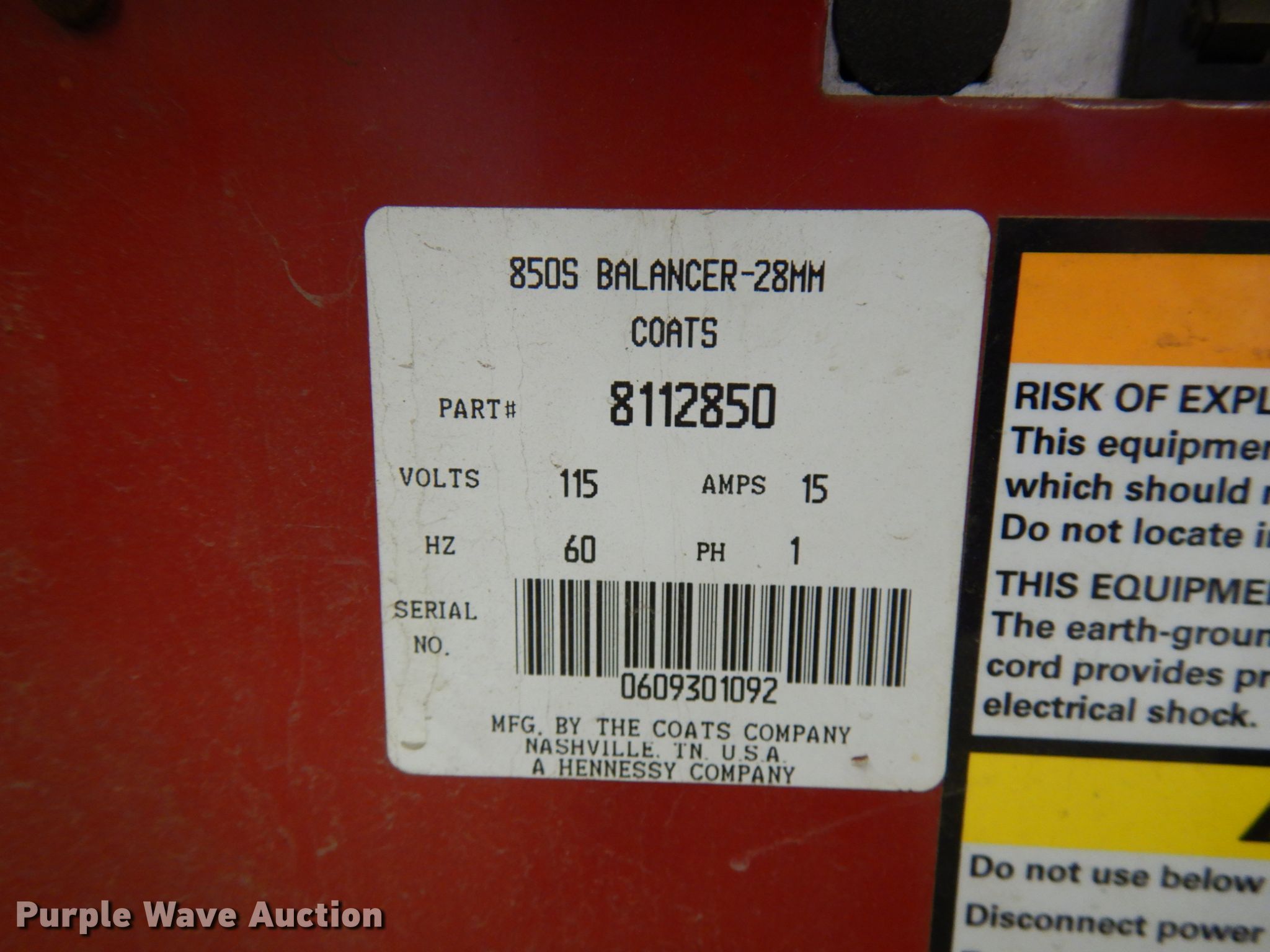 Purple Wave is selling a used Tools in Iowa. This item is a Coats 850S solid state wheel balancer with the following: 115V, 15 amp, Single phase, 60 Hz, Part no. 8112850, Serial 0609301092