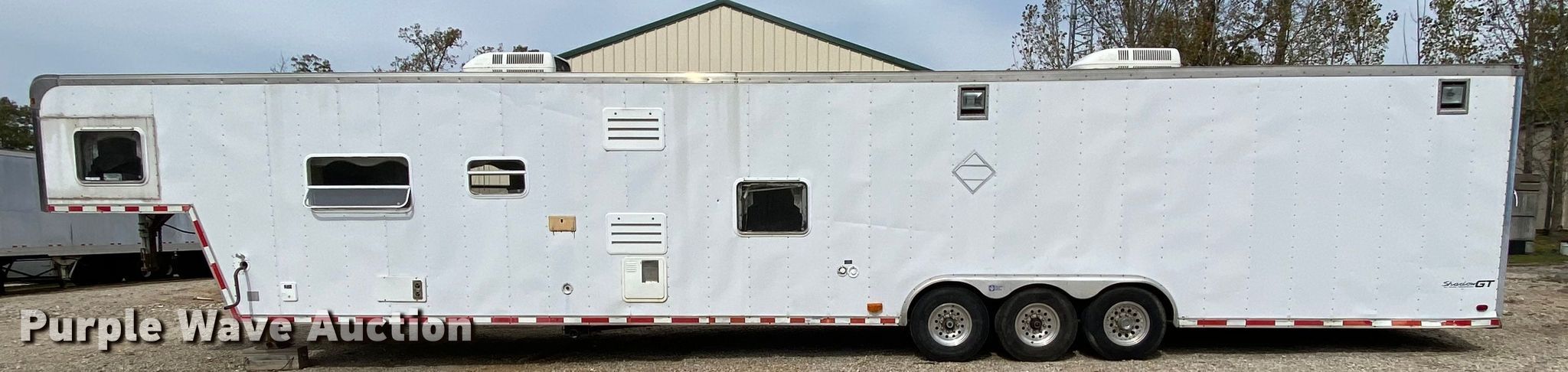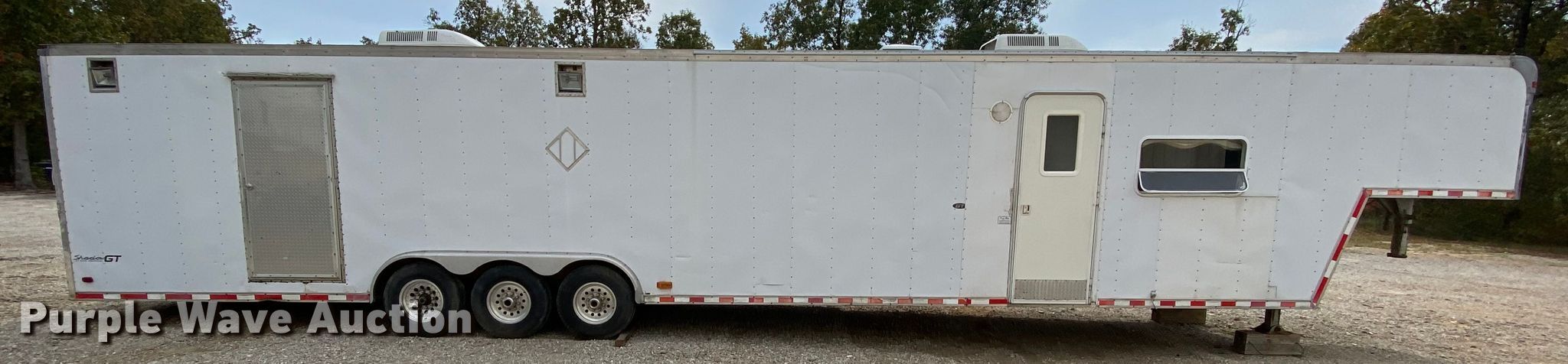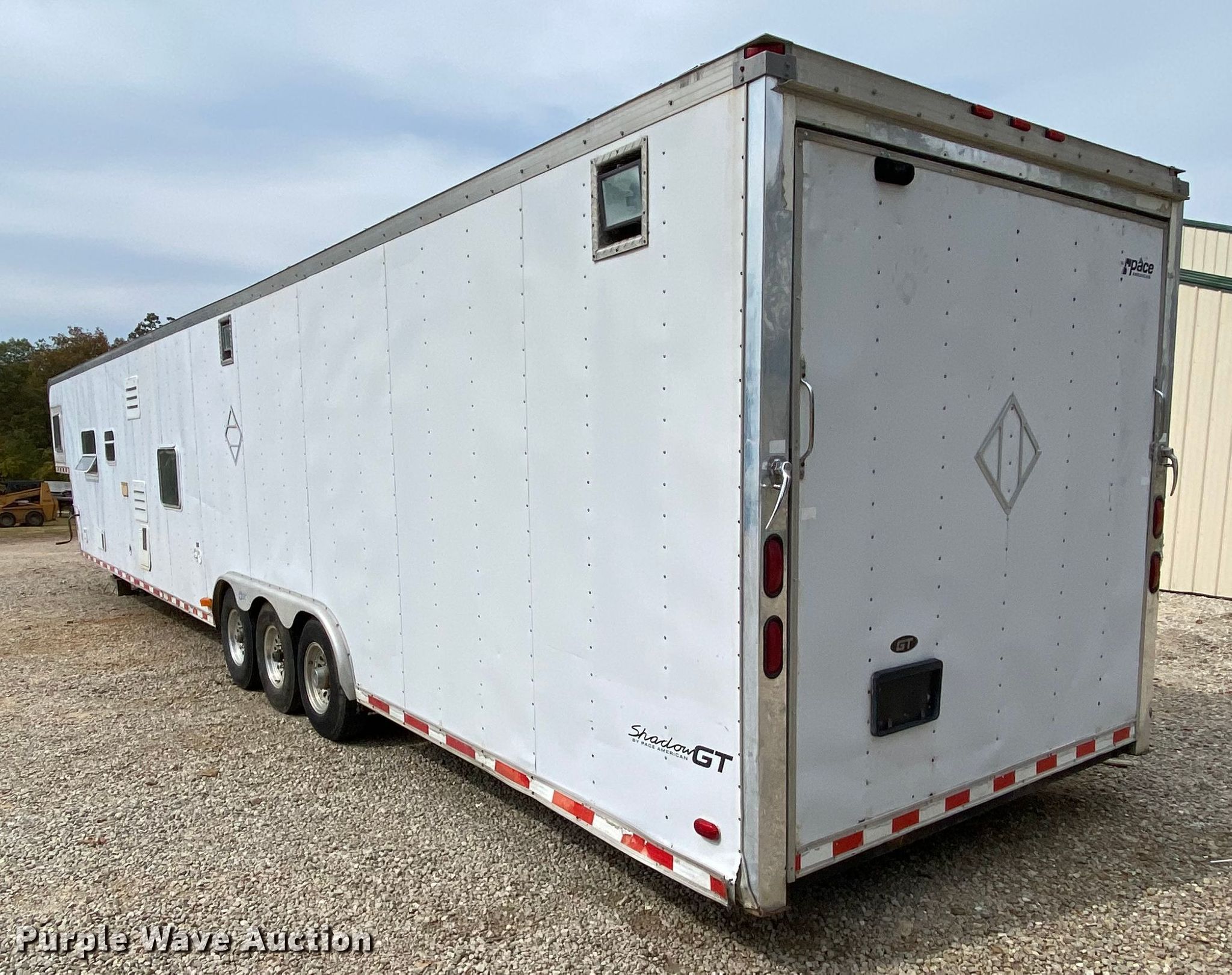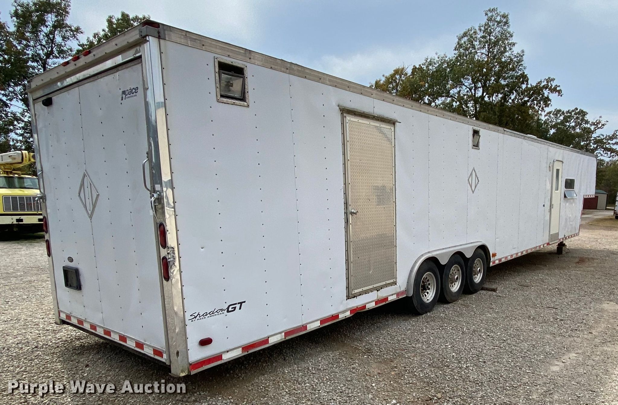 Purple Wave is selling a used Enclosed Cargo Trailer in Missouri. This item is a 2001 Pace American GT Shadow enclosed cargo trailer with the following: 48'L overall, 42'L x 8'W body, 20'L cargo area, (2) Coleman Mack AC unit, (2) 80 gallon fresh water tanks, 28'L living quarters, Queen bed, Fold out couch, (2) sets of bunk beds, Refrigerator/freezer, Stove, (2) sinks, Microwave, Full shower insert, Inverter box, Wood deck, Dual leg landing gear, Spring suspension, Electric brakes, Triple axle, Aluminum wheels, 7.50R16LT tires