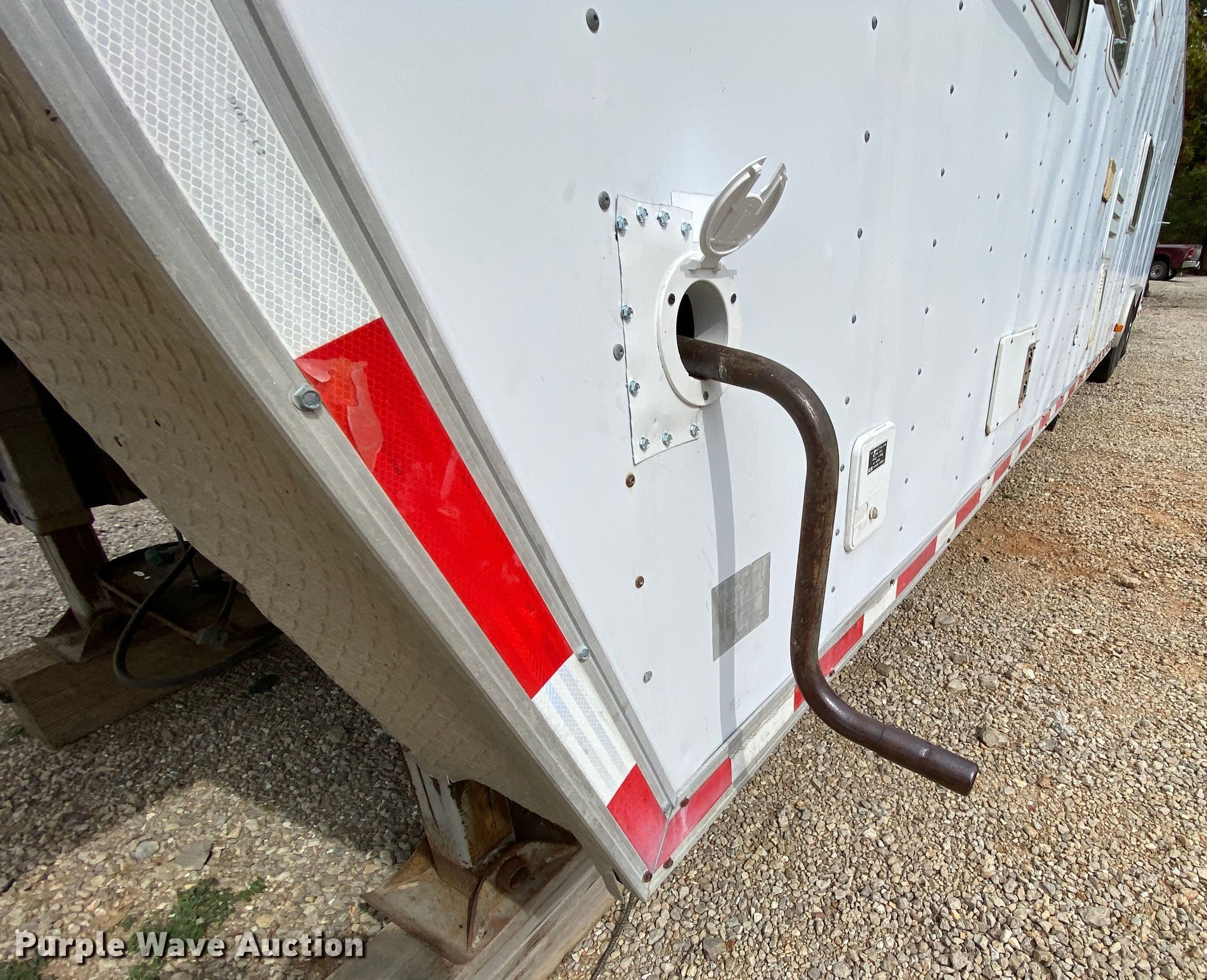 2001 Pace American GT Shadow enclosed cargo trailer. 48'L overall, 42'L x 8'W body, 20'L cargo area (2) Coleman Mack AC unit, (2) 80 gallon fresh water tanks, 28'L living quarters Queen bed, Fold out couch, (2) sets of bunk beds, Refrigerator/freezer, Stove, (2) sinks, Microwave, Full shower insert, Inverter box, Wood deck, Dual leg landing gear, Spring suspension, Electric brakes, Triple axle, Aluminum wheels, 7.50R16LT tires. Missouri title. 40LW548391P073436. Premier Pyrotechnics. 25255 Hwy K. Richland, MO 65556