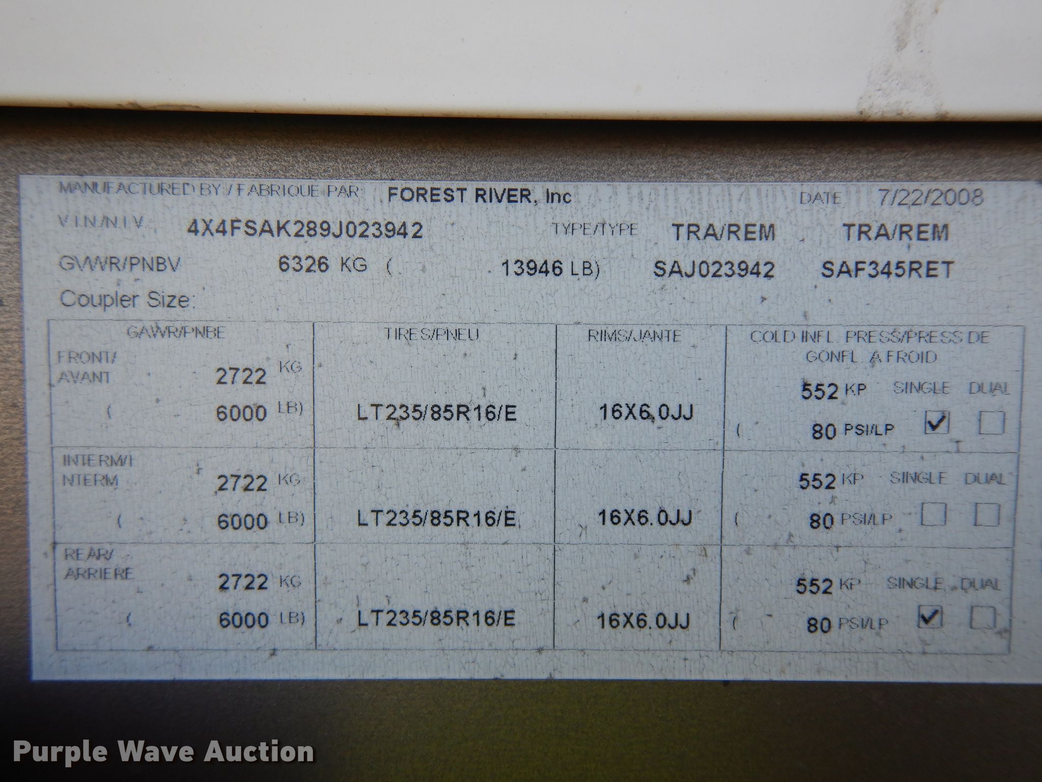 2008 Forest River Sandpiper camper. Camper length: 39'. Chassis Axles: Tandem, Suspension: Spring, Brakes: Electric, GVWR: 13,946 lbs. Interior Kitchen: Sink, Refrigerator, Freezer, Microwave, Oven, Stove: Propane, Living room: Table, Couch, Pull Out Couch, Bathroom, Washer and dryer hookups, Beds: 1, Bed type: Queen, TVs: 1, Heater, AC units: 2. Operational Slide outs: 3, Type of awnings: Electric. Tires Tire size: 235/85R16. Notes Contents not included. Kansas rebuilt salvage title. 4X4FSAK289J023942. Davis Trenching Inc. Eureka, KS 67045