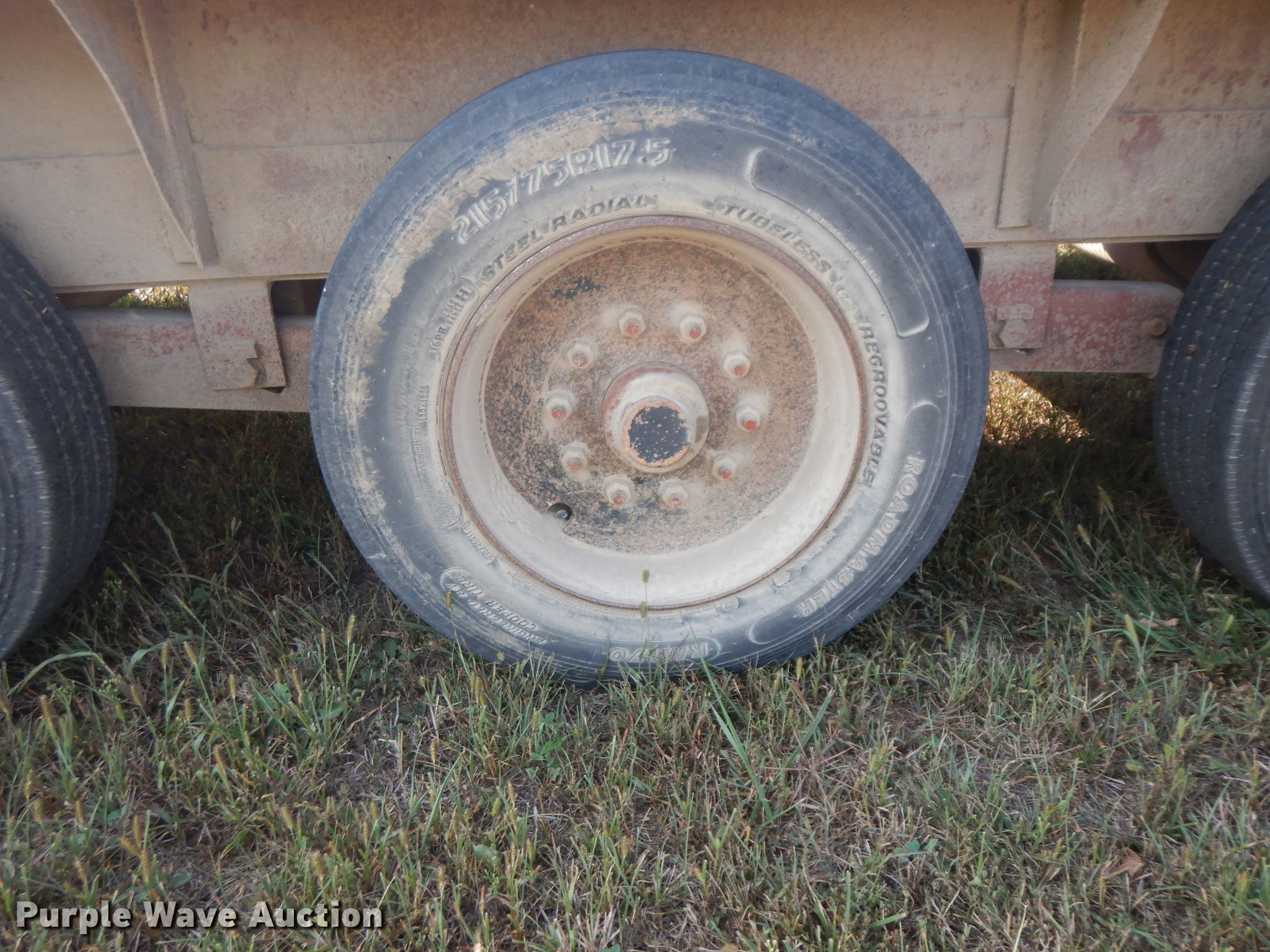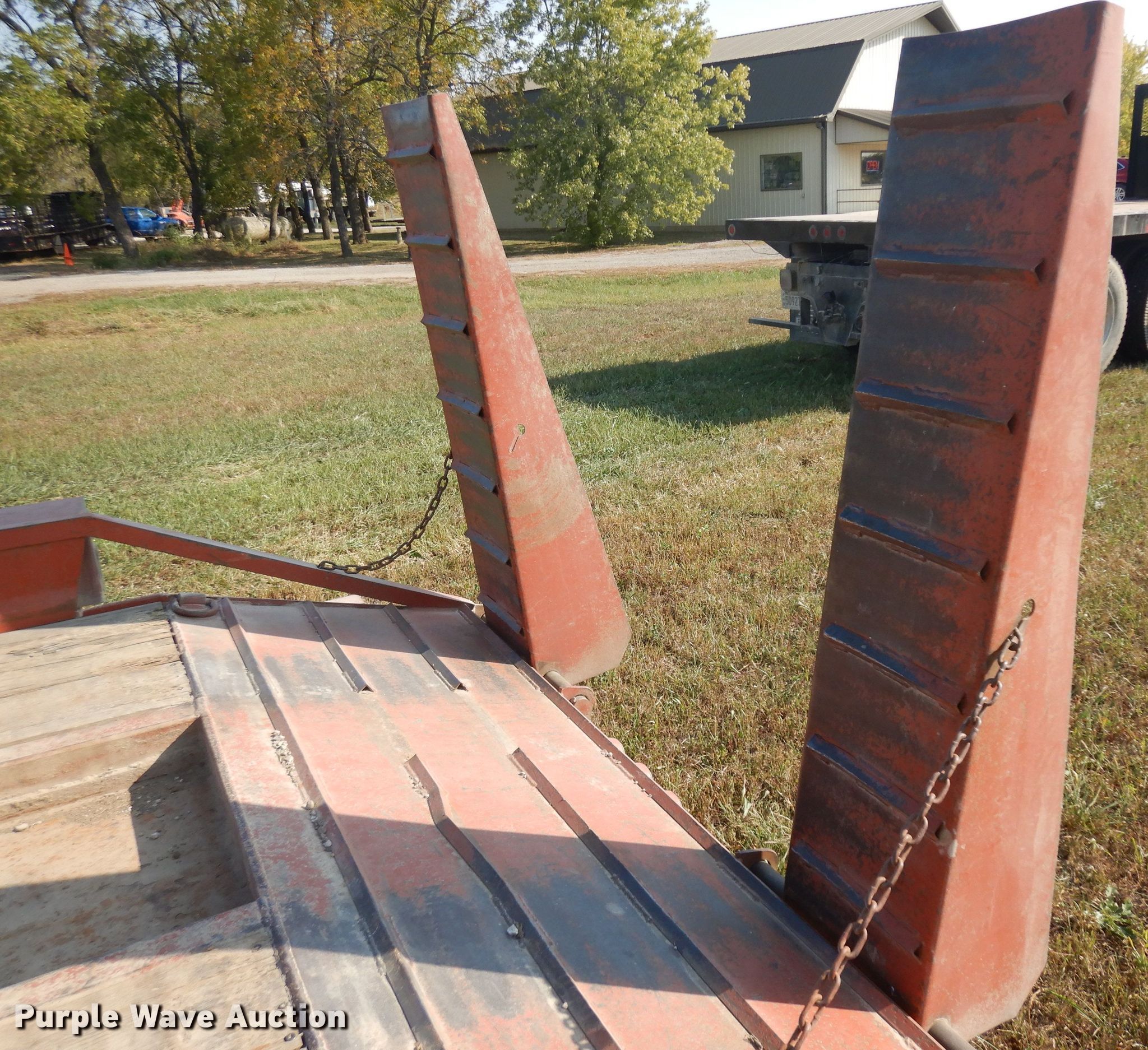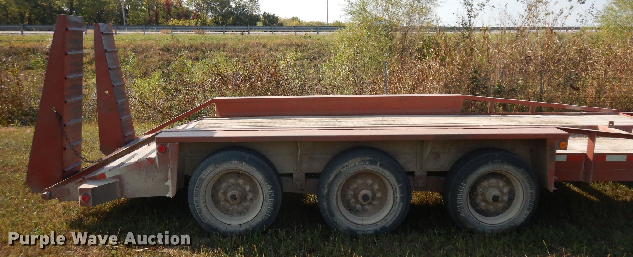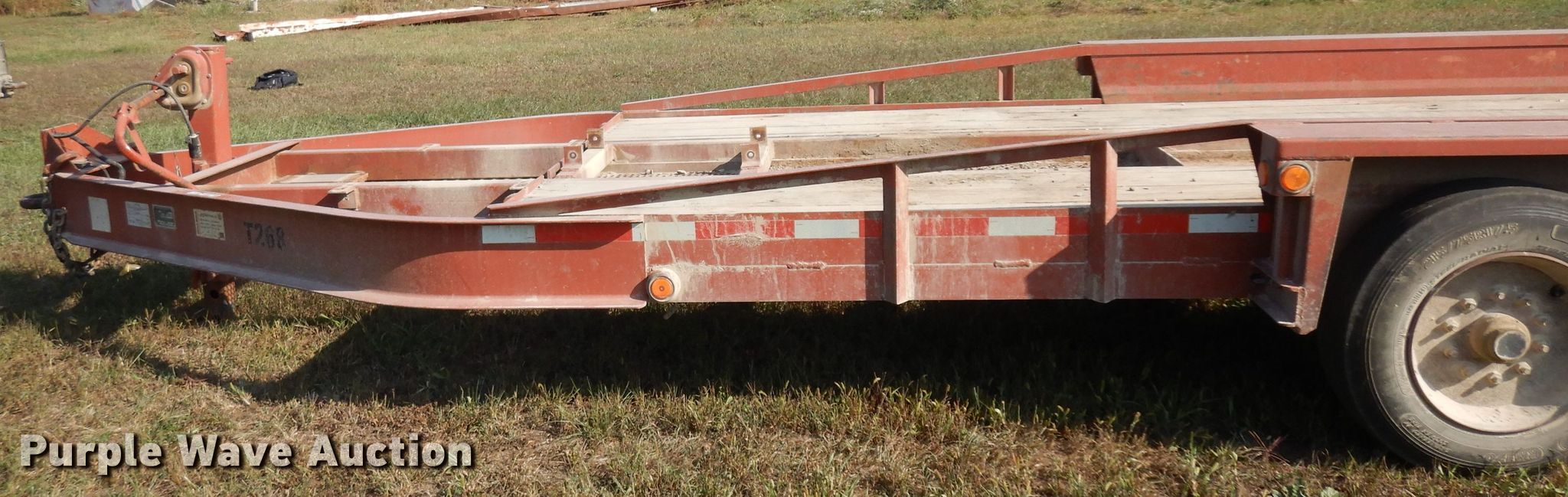 Purple Wave is selling a used Equip. Trailer in Kansas. This item is a 2002 Belshe T-18 equipment trailer with the following: 28'L x 102"W, 18'L x 82"W wood deck, 26" floor height, 2.5' tail length, 5'L ramps, Single leg landing gear, Spring suspension, Electric brakes, Triple axle, Steel wheels, 215/75R17.5 tires, GVWR 24,000 lbs, (2) additional tires included