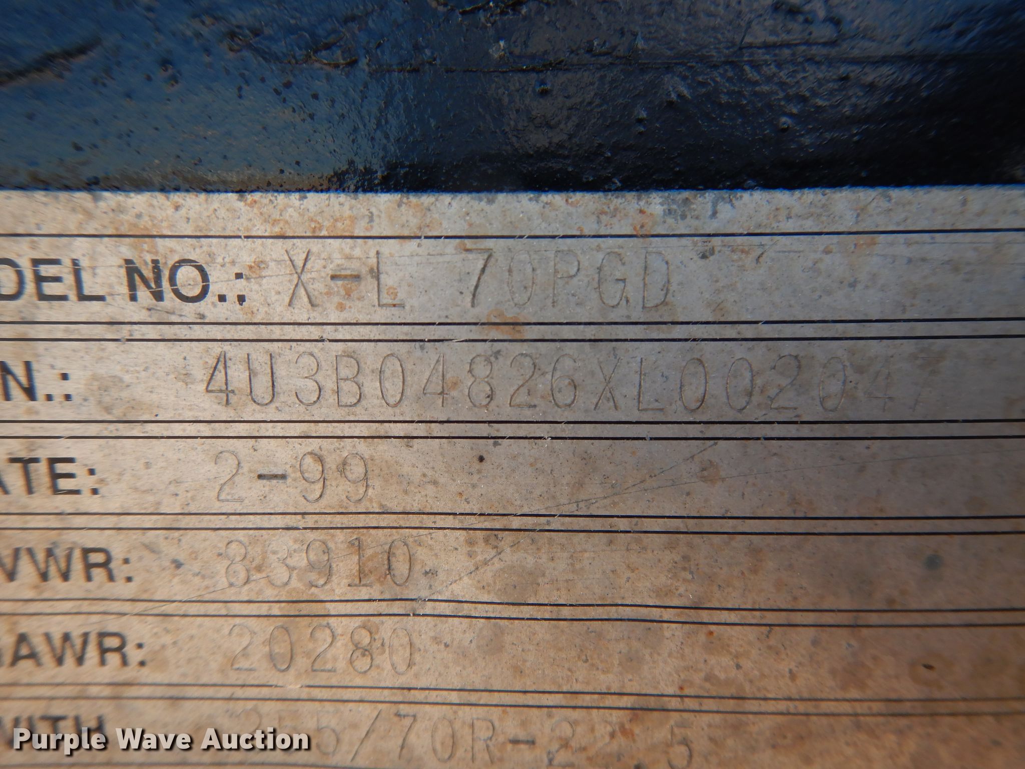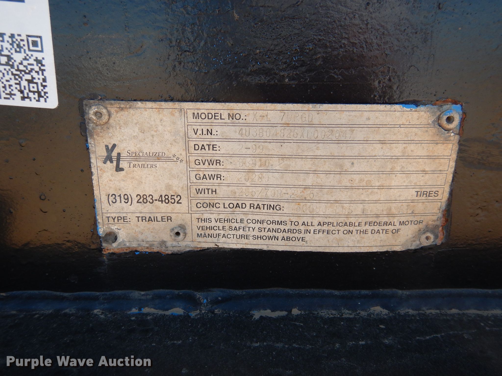Purple Wave is selling a used Flat or Drop Deck Trailer in Kansas. This item is a 1999 Specialized XL 7OPGD double drop deck trailer with the following: 52'7"L x 102"W overall, 8.25'L top deck, 35'8"L deck, 7.4'L rear deck, 12" swing-outs, Wood deck, Dual leg two speed landing gear, Air suspension, Air brakes, Tandem axle, Steel wheels, 255/70R22.5 tires, GVWR 83,910 lbs, GAWR 20,280 lbs