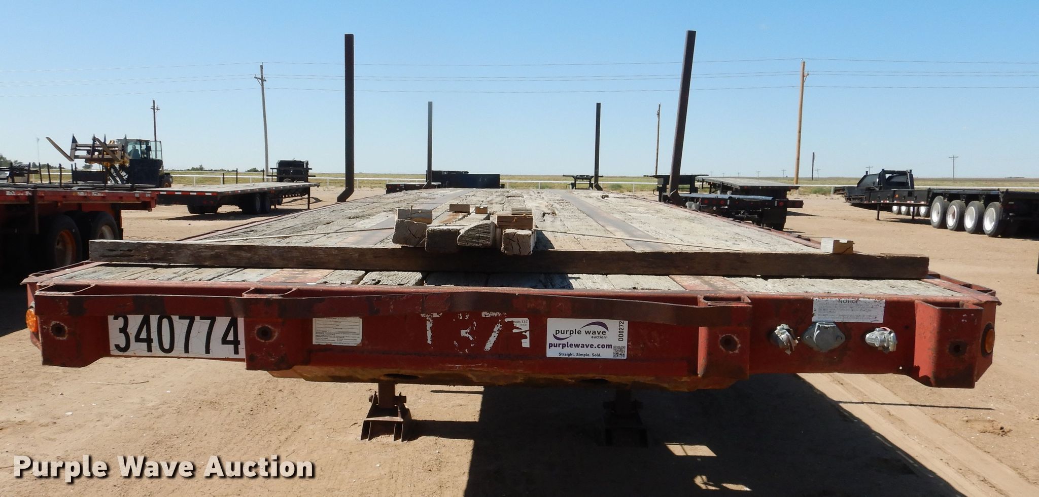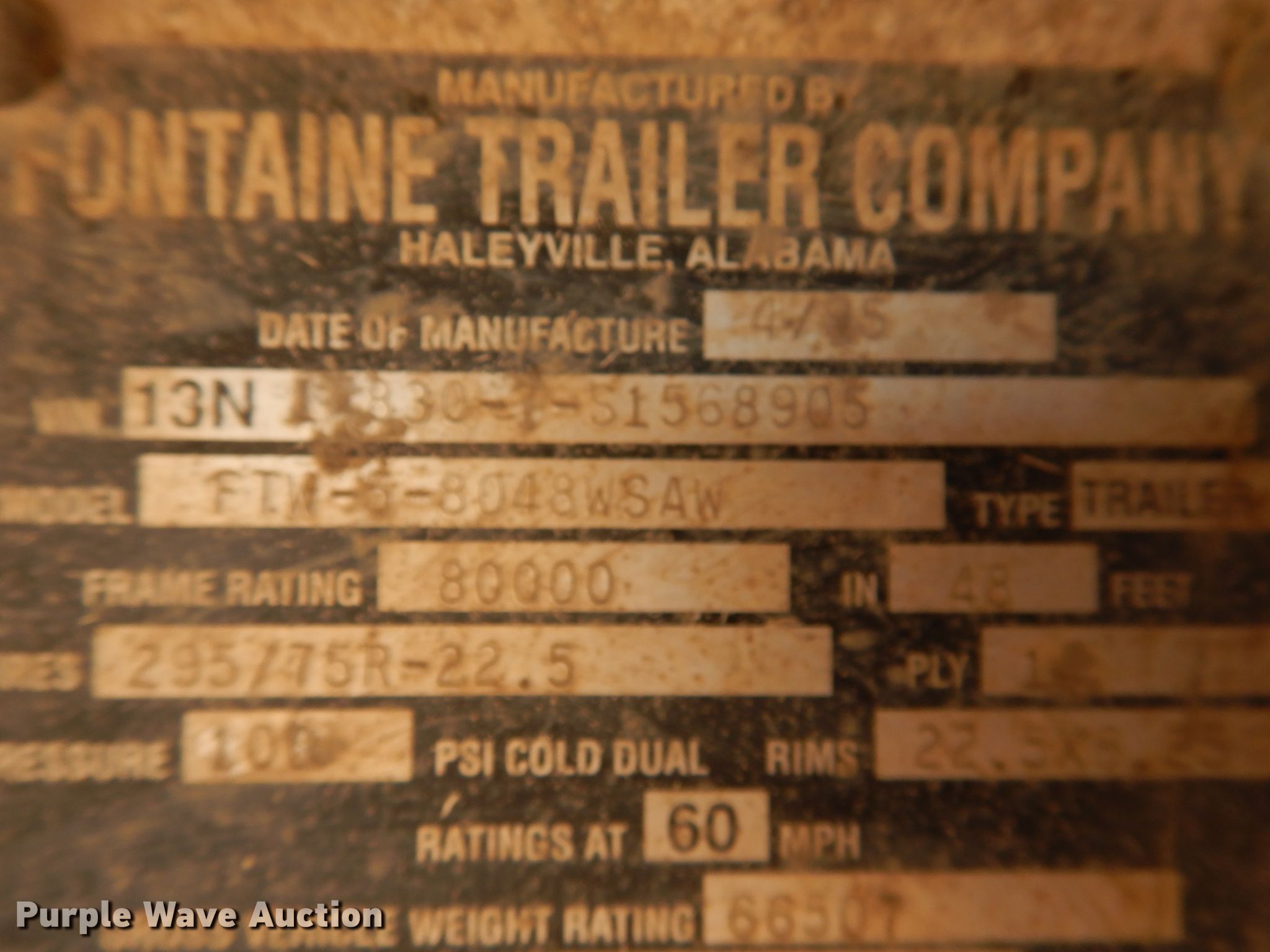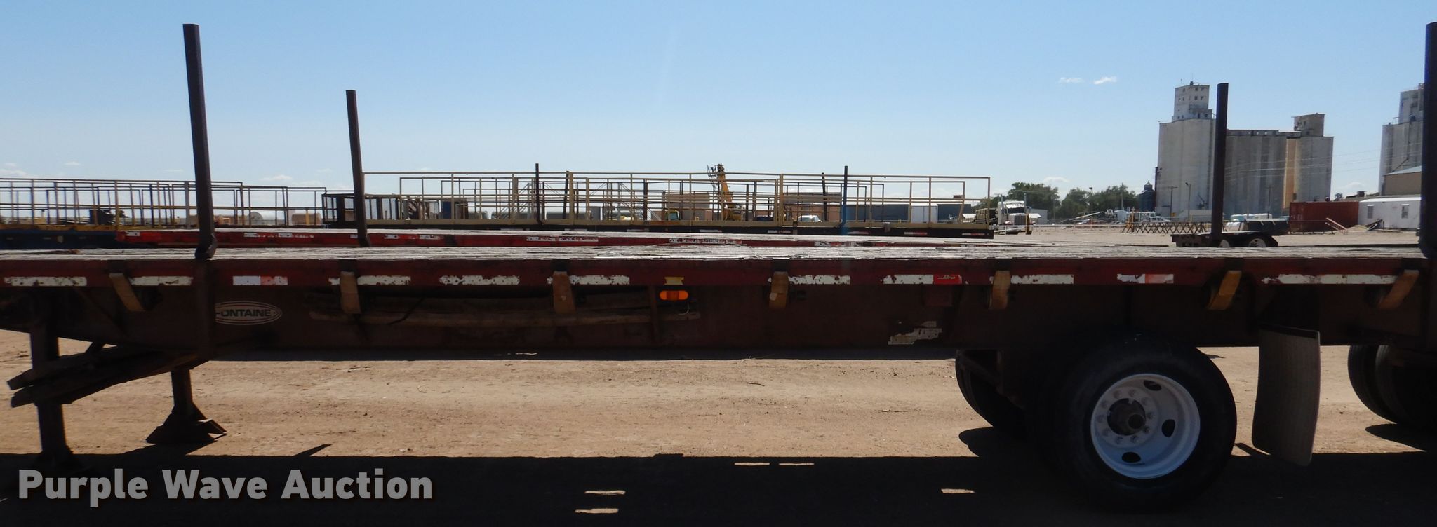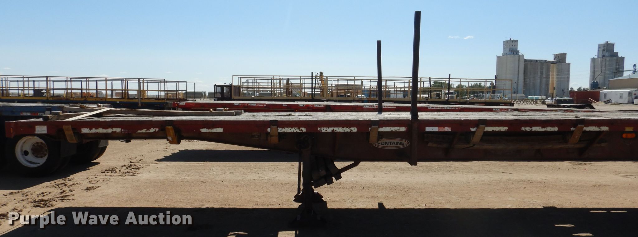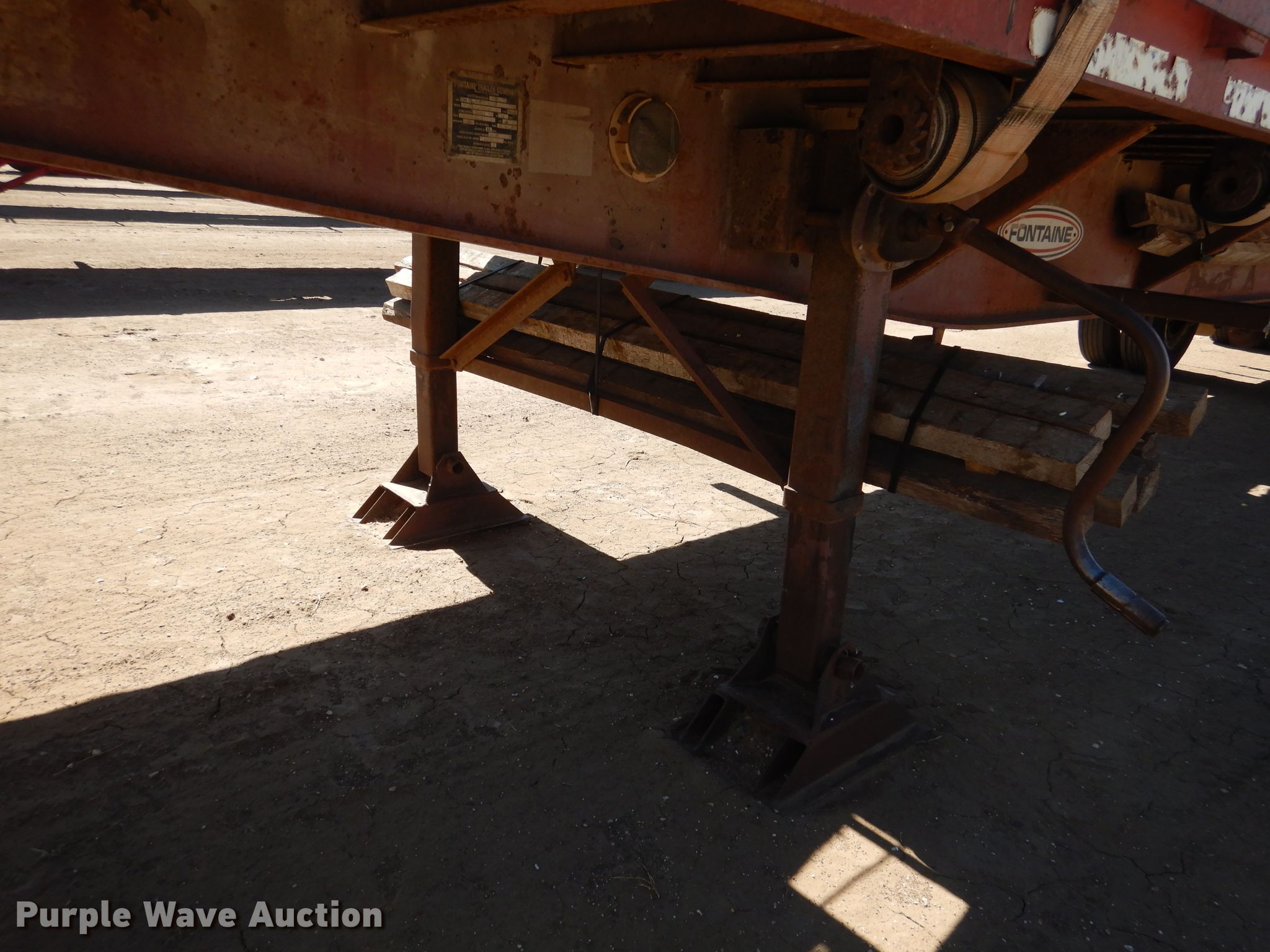 Purple Wave is selling a used Flat or Drop Deck Trailer in Kansas. This item is a 1995 Fontaine FTW-5-8048WSAW flatbed trailer with the following: 48'4"L x 102"W overall, 48'L x 98"W deck, 4' bolster height, Wood deck, Dual leg two speed landing gear, Air suspension, Air brakes, Spread axle, Steel wheels, 11R22.5 tires, GVWR 66,507 lbs, GAWR 20,000 lbs