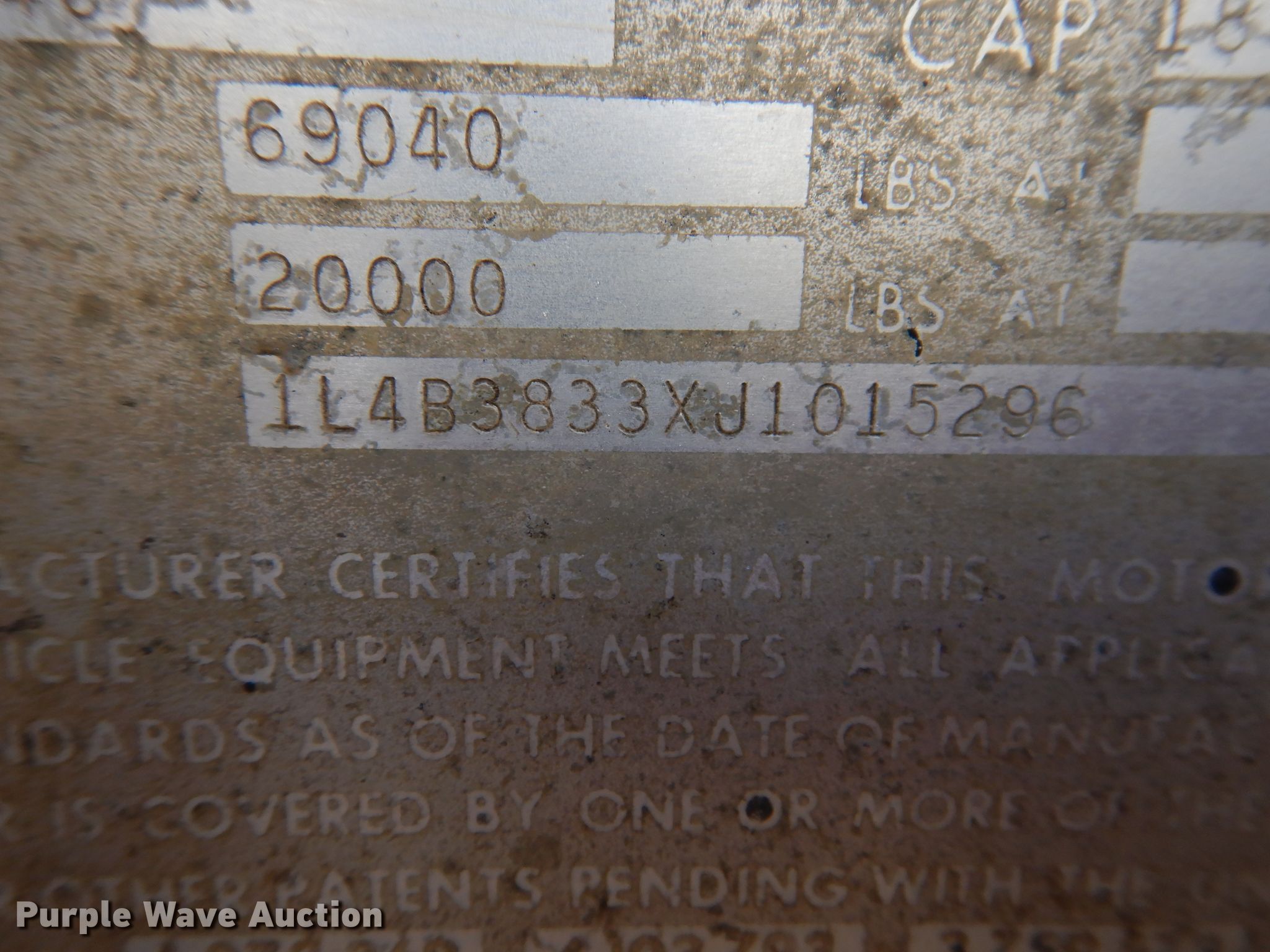 1988 Trail King 1827-0-3Axle bottom dump trailer. 40'L x 8'W overall, 67" side height, 12" side board height, Dual hydraulic cylinders, Air operated clamshell gate, Rear push block, 18 cu. yd. capacity, Steel construction, Dual leg landing gear, Spring suspension, Air brakes, Triple axle, Steel wheels, 11R22.5 tires, GVWR 69,040 lbs, GAWR 20,000 lbs, Unknown operating condition. Kansas title. 1L4B3833XJ1015296. Double T Industries Inc. - Open inspection November 11. 980 KS-51 N. Rolla, KS 67954