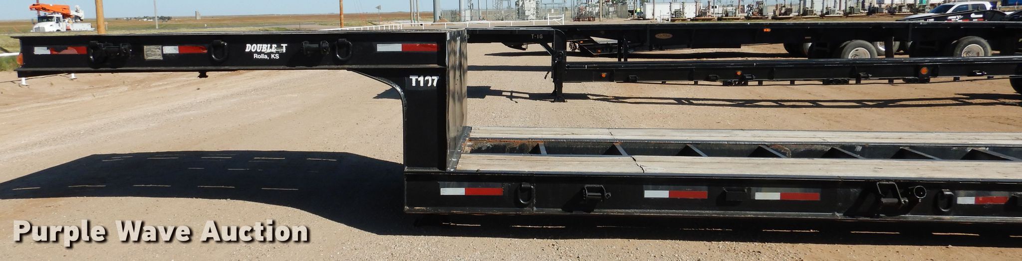 1972 Birmingham 820DLS drop deck trailer. 54'L x 8'W overall, 10.5'L top deck, 35'L deck, 8.5'L rear deck, Wood deck, Dual leg two speed landing gear, Spring suspension, Air brakes, Tandem axle, Steel wheels, 295/75R22.5 tires, GVWR 55,300 lbs, GAWR 20,000 lbs. Kansas title. CM526. Double T Industries Inc. - Open inspection November 11. 980 KS-51 N. Rolla, KS 67954