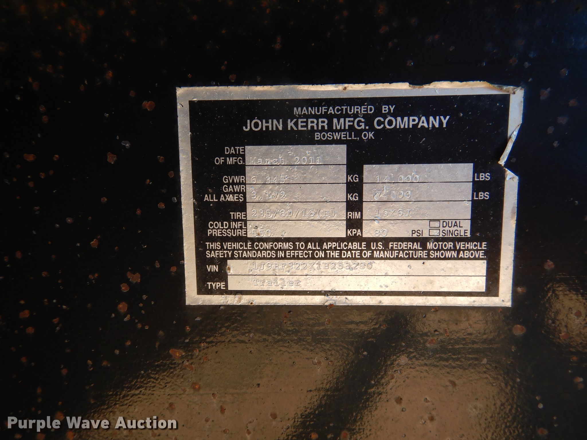 Purple Wave is selling a used Trailer Other in Kansas. This item is a 2011 John Kerr pipe trailer with the following: 37'6"L x 6'W overall, 32'3"L x 54"W deck, 3' bolster height, 2 5/16" ball hitch, Single leg landing gear, Spring suspension, Electric brakes, Tandem axle, Steel wheels, 235/80R16 tires, GVWR 14,000 lbs, GAWR 7,000 lbs