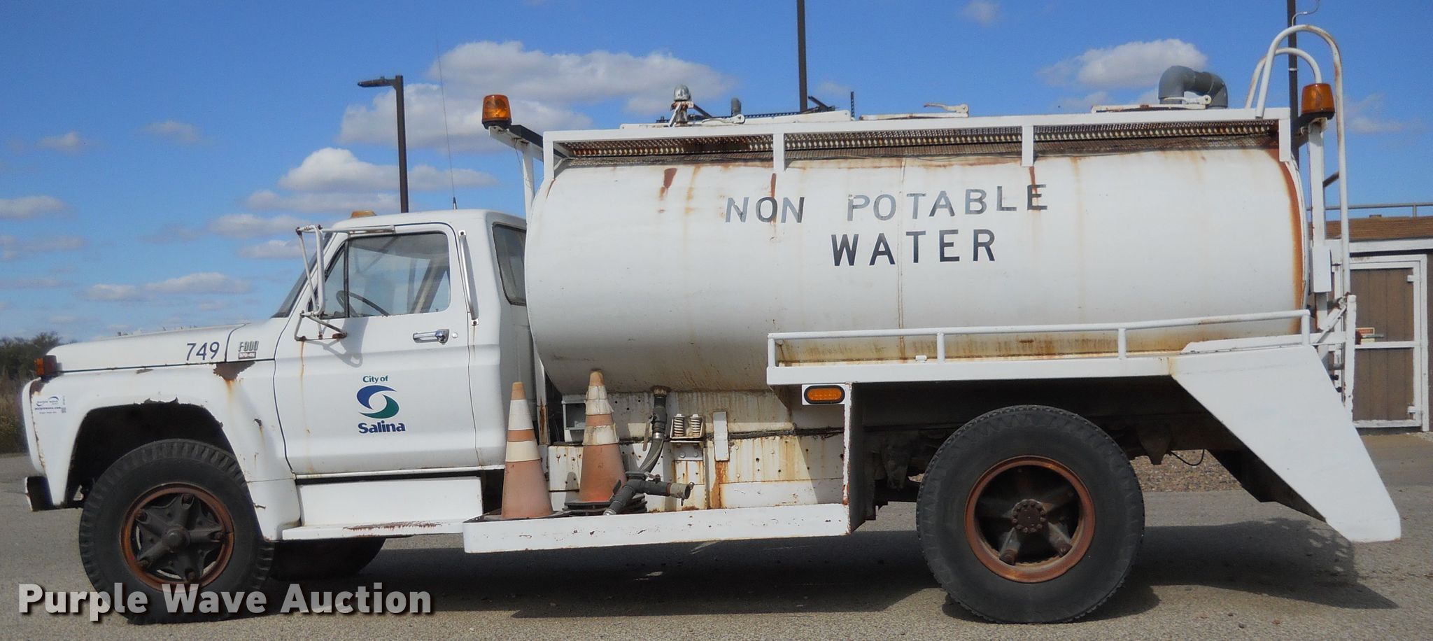1979 Ford F800 water truck. 65,754 miles on odometer. Engine Ford 370, Cylinders: 8, Fuel type: Gas. Transmission Manual, Speed: 4. Chassis Axles: Single, Suspension: Spring, Brakes: Hydraulic, GVWR: 27,500 lbs, Wheelbase: 176". Interior Heat. Operational Bed / tank Length: 170", Top fill. Notes Unit will need towed or hauled, Non-operational unit. Kansas title. Title distribution may be delayed up to 14 days from verification of funds. F82BVDC9224. City of Salina. 412 Ash St. Salina, KS 67401