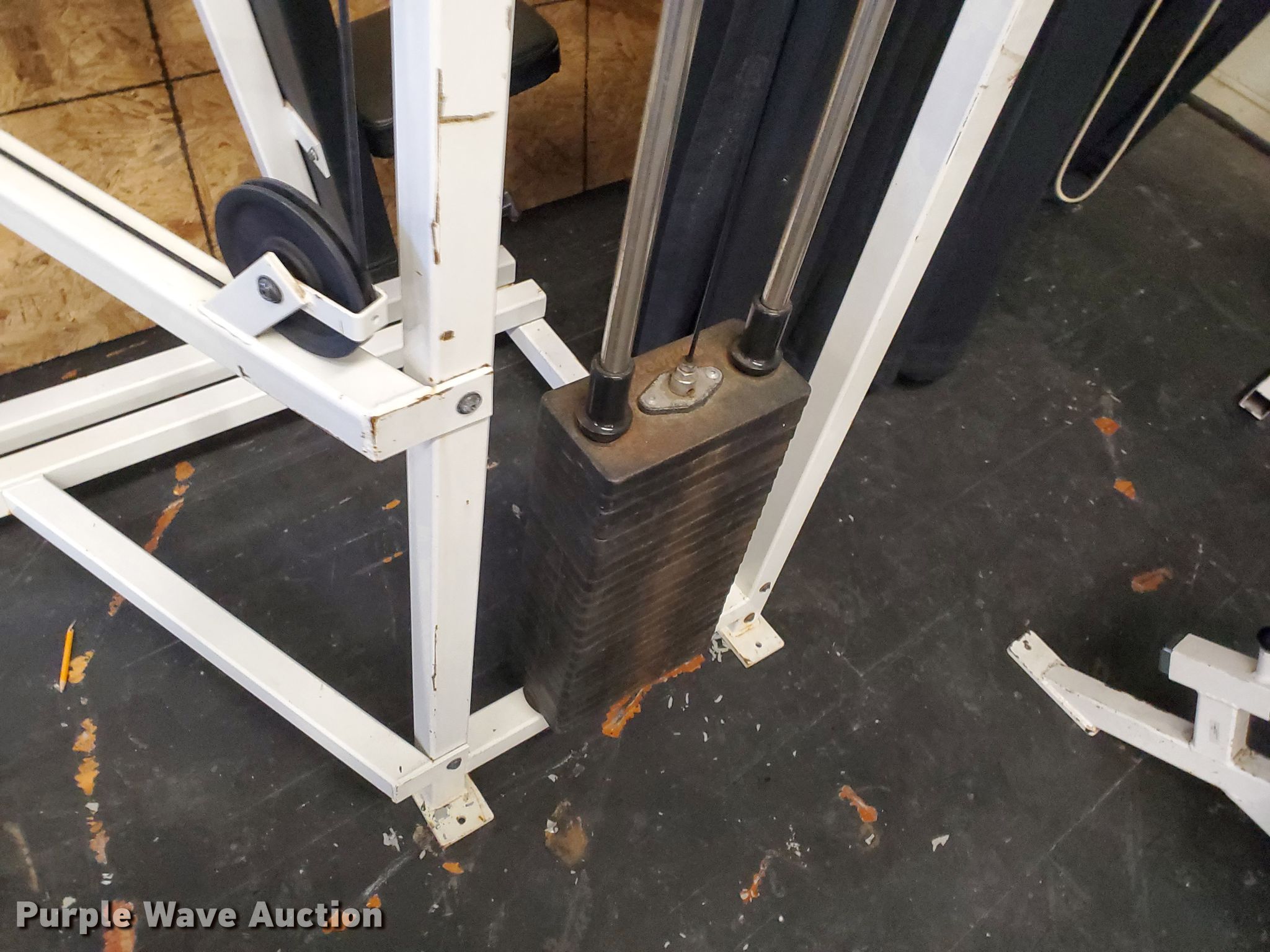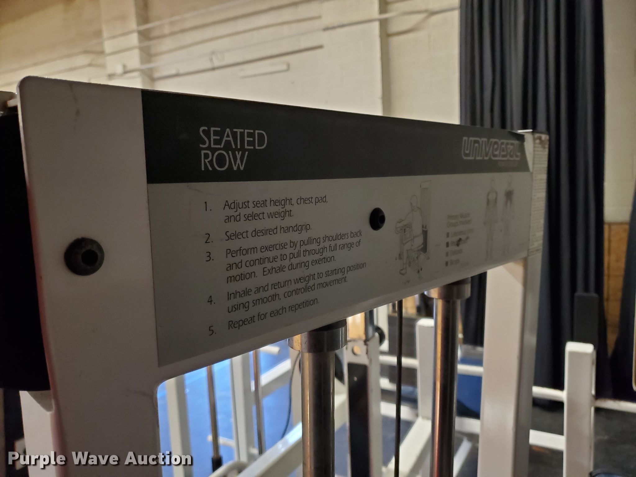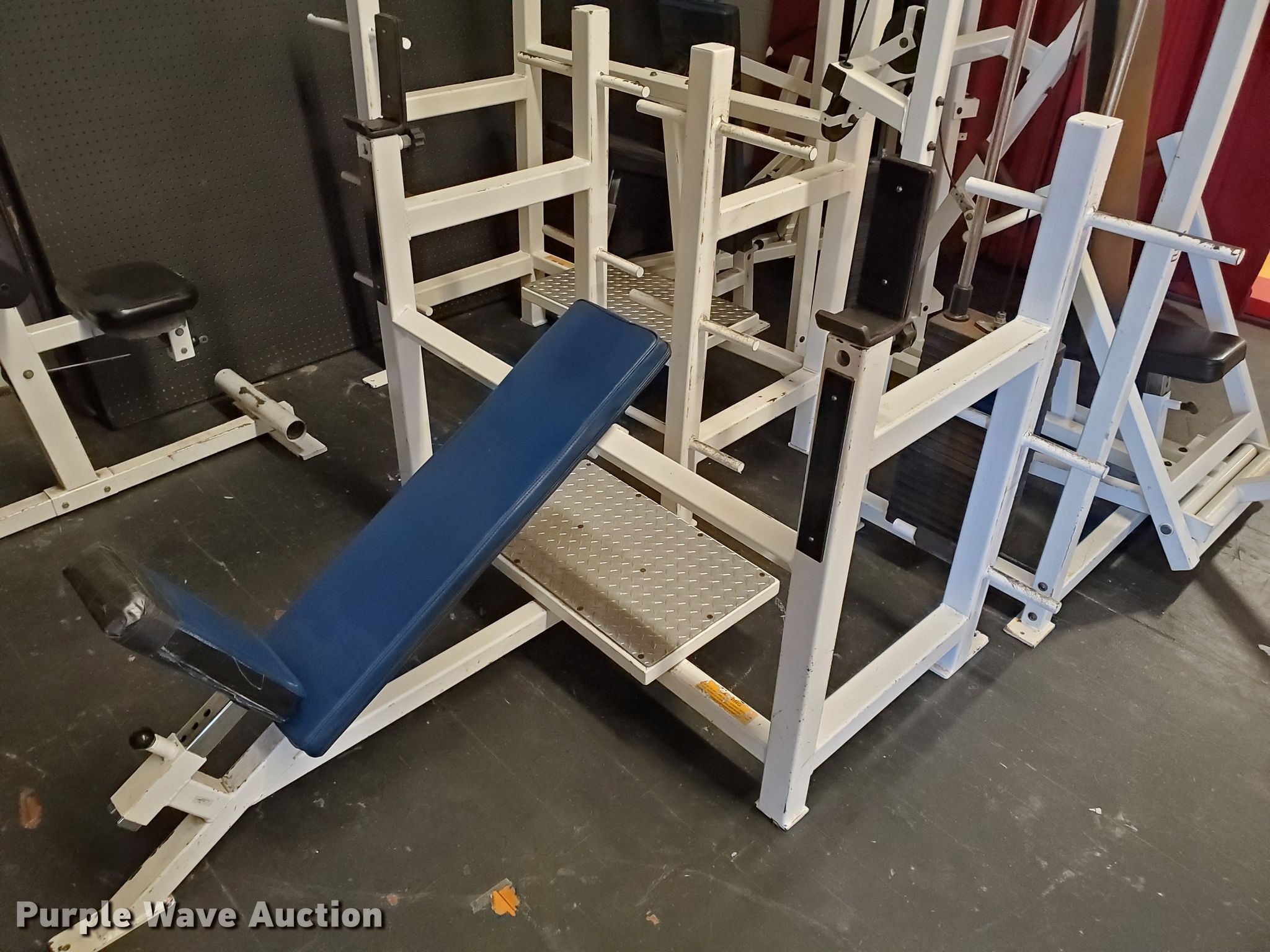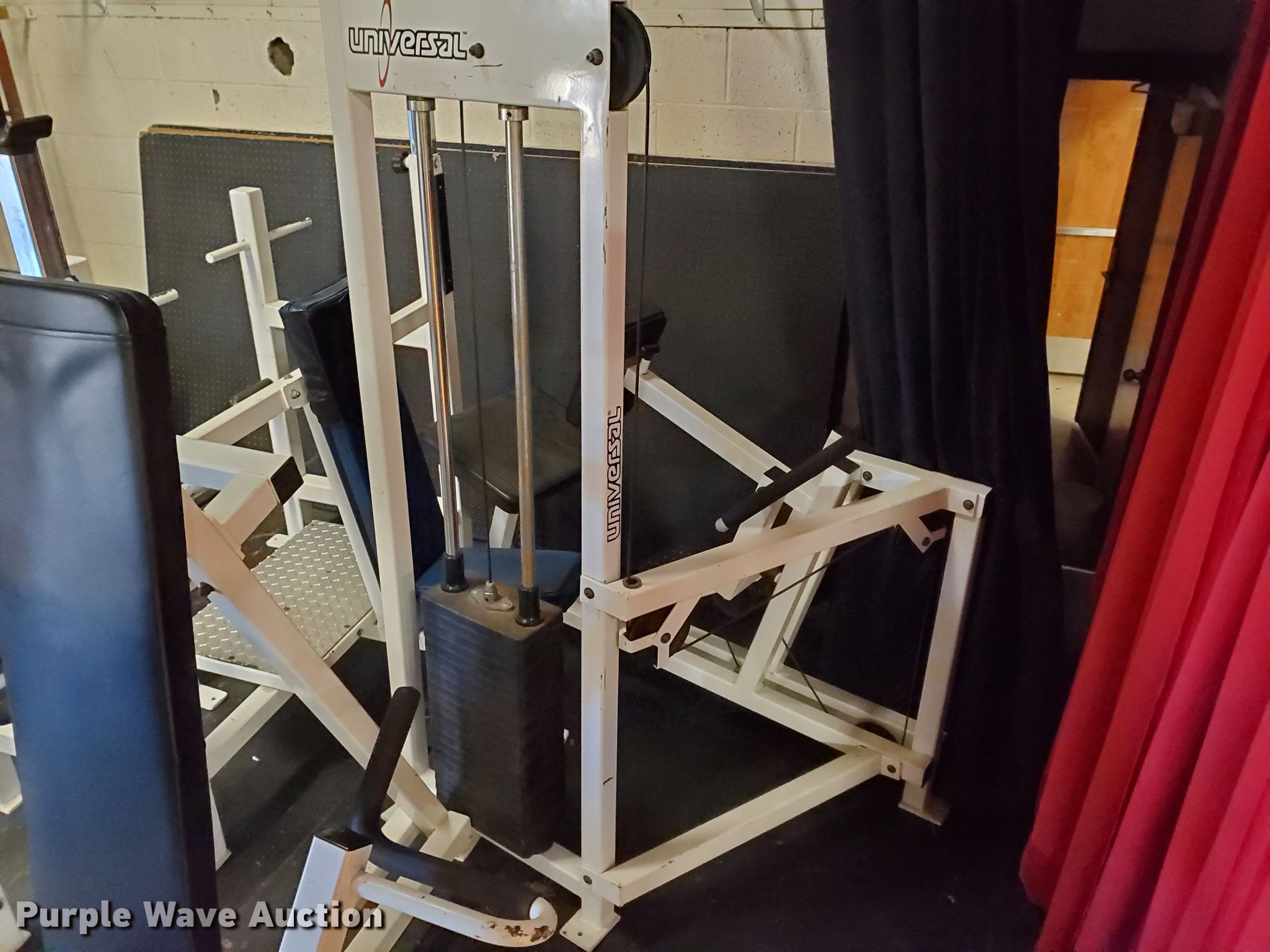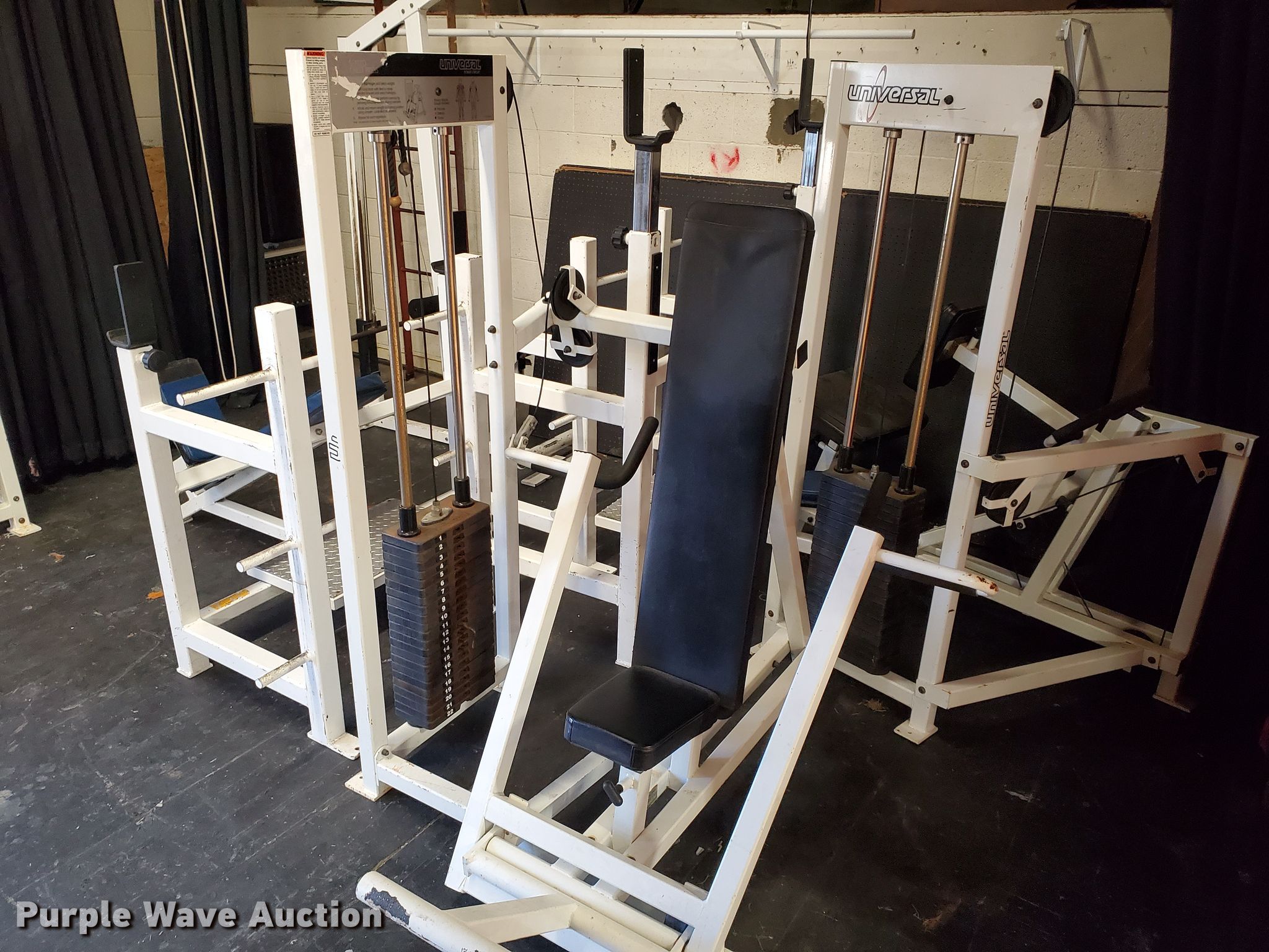 Purple Wave is selling a used Sporting Goods in Kansas. This item is a Weight equipment with the following: Universal shoulder press machine, Pull down machine, Incline bench, Seated military press bench, Universal seated chest press machine, Universal seated row machine