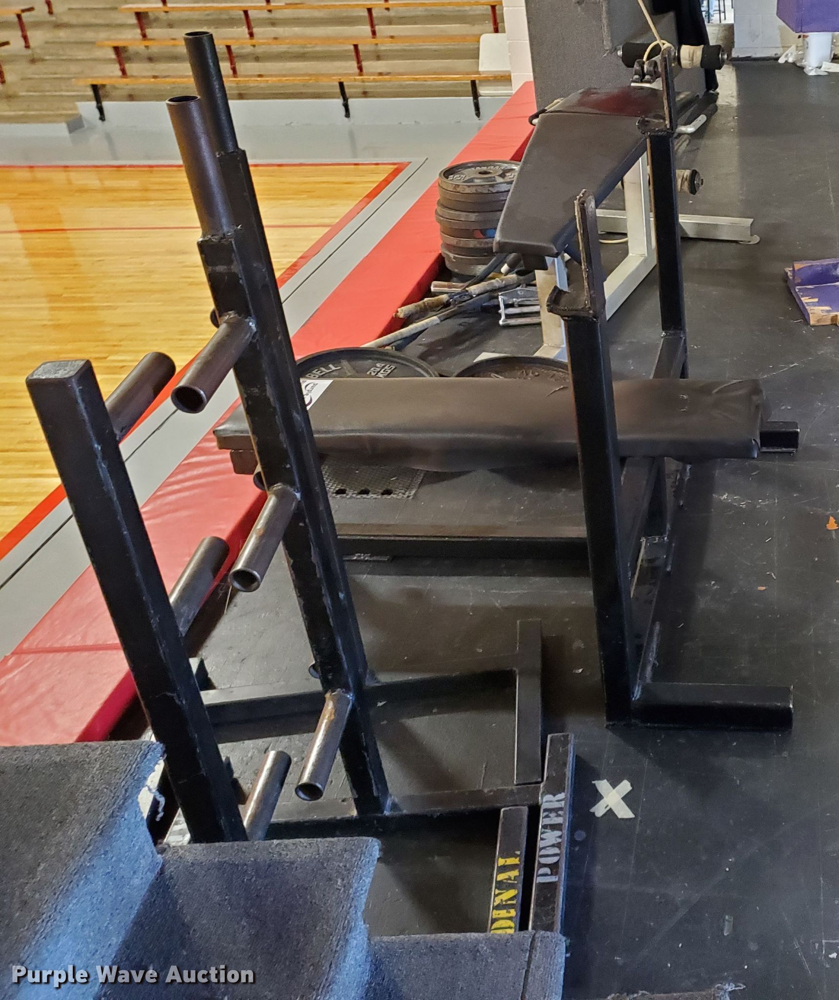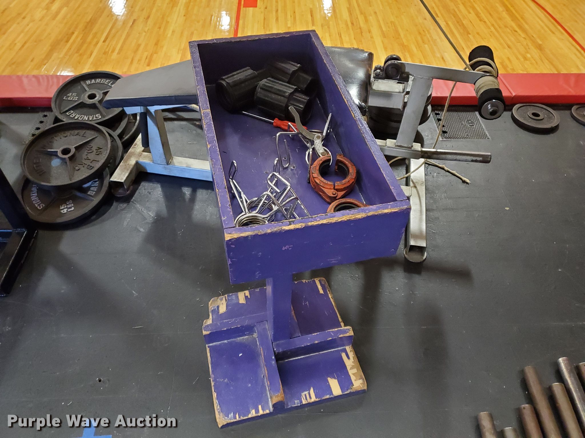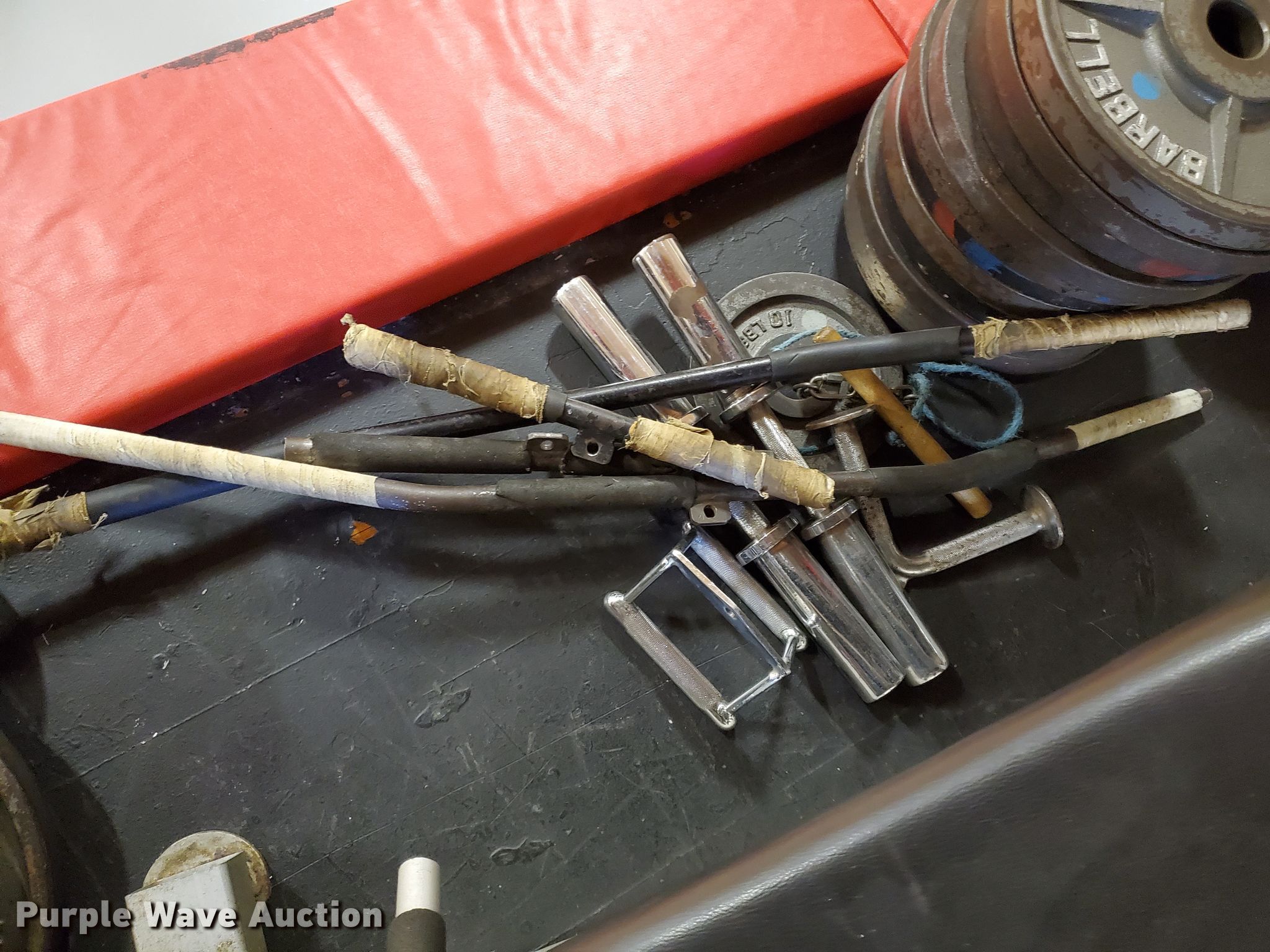 Purple Wave is selling a used Sporting Goods in Kansas. This item is a Weight equipment with the following: Horizontal bench, (7) weight bars, Weight plates, Leg curl station, Weight stands, (3) squat racks