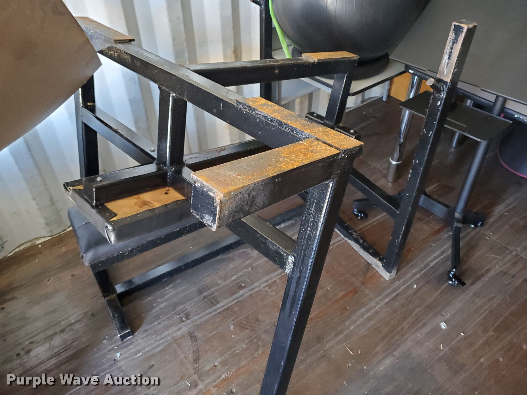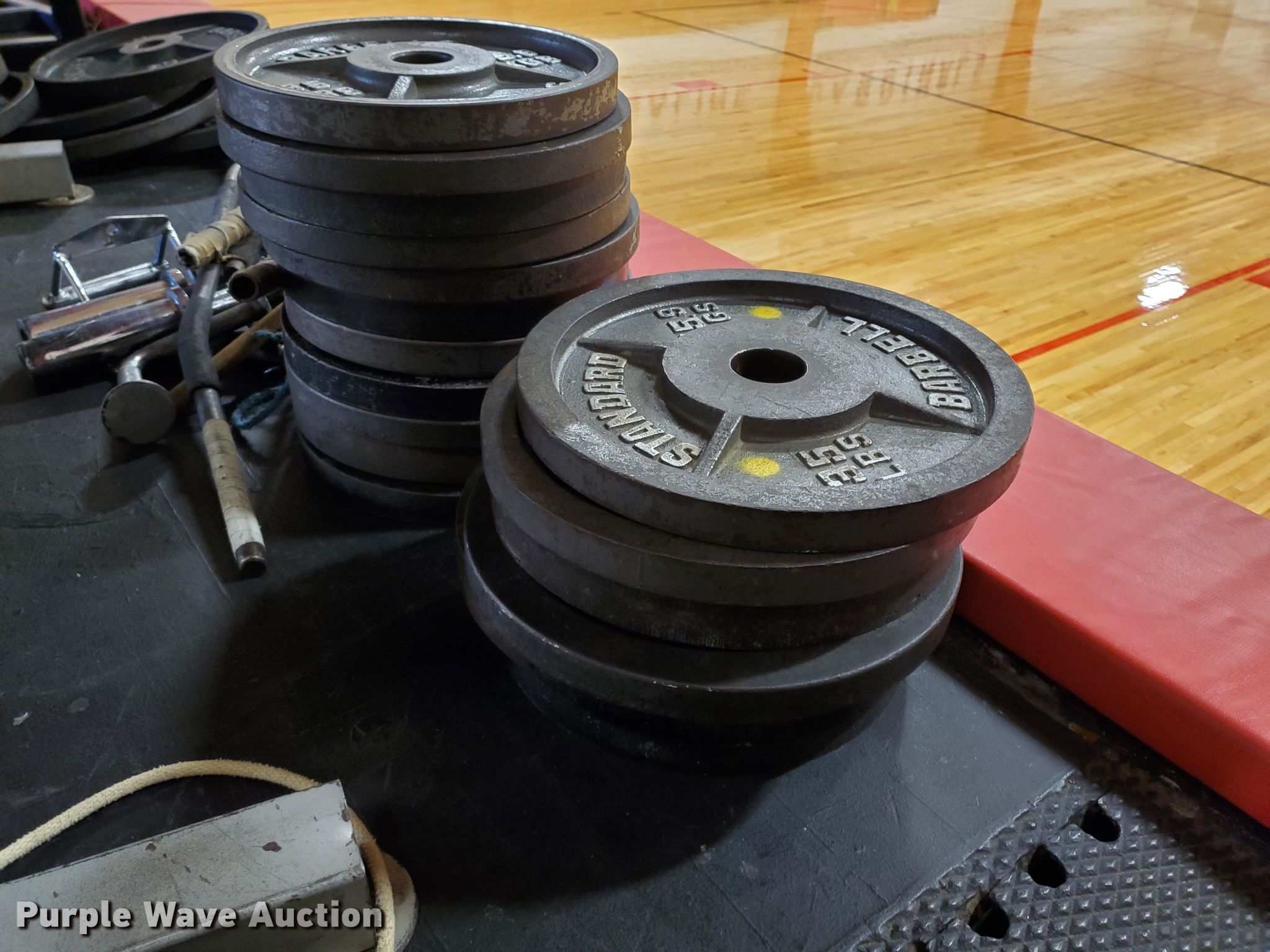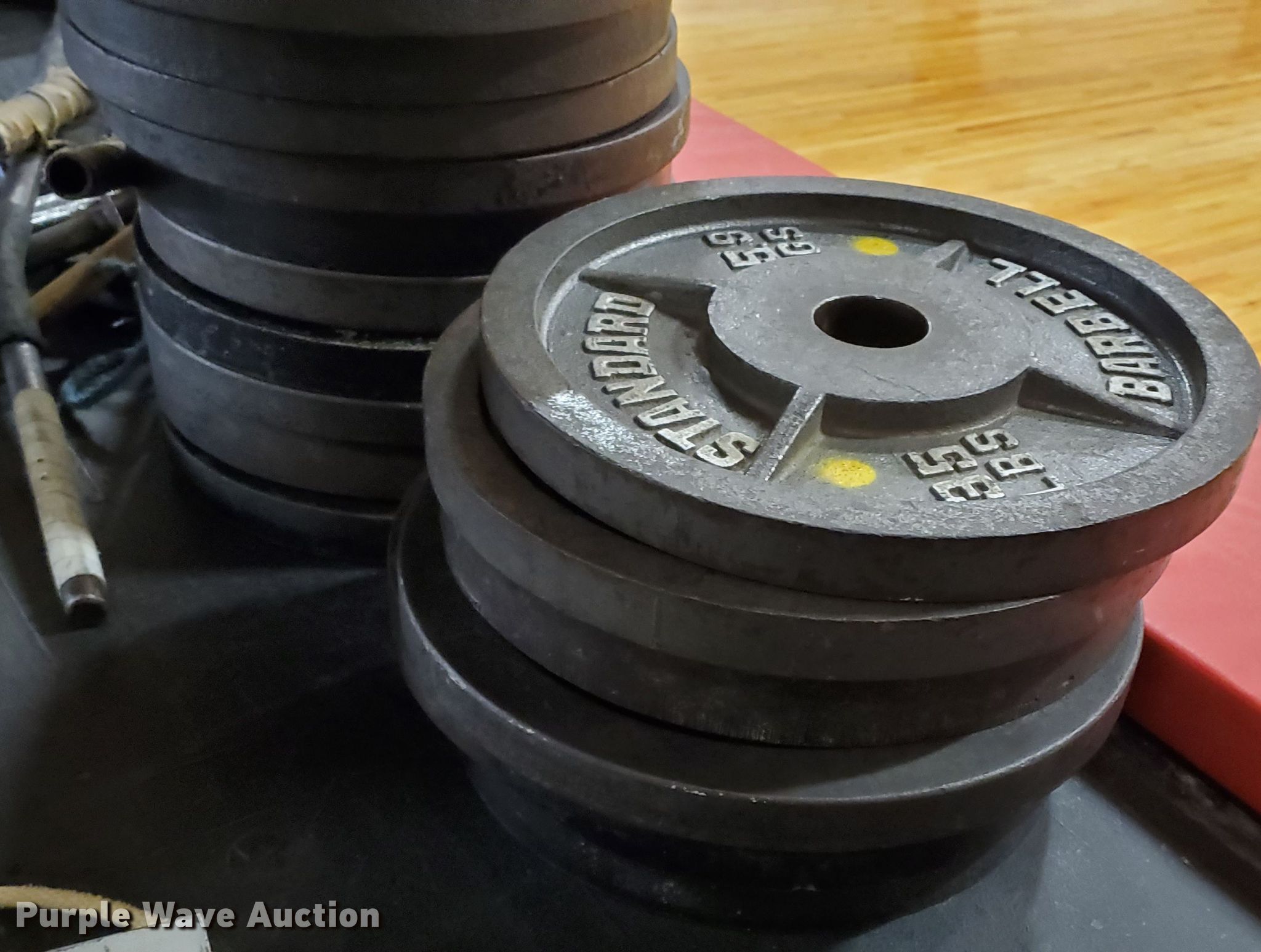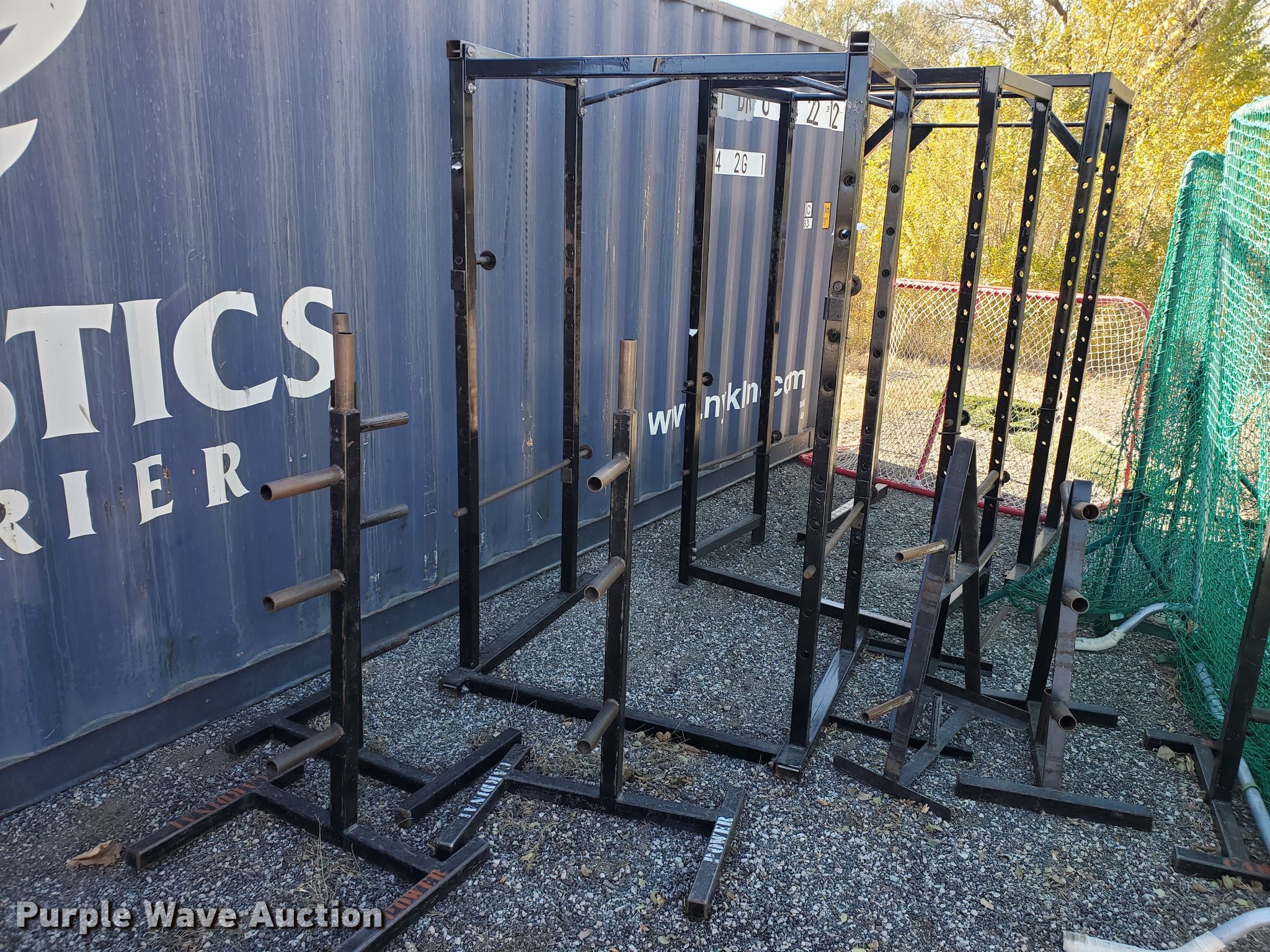 Purple Wave is selling a used Sporting Goods in Kansas. This item is a Weight equipment with the following: Horizontal bench, (7) weight bars, Weight plates, Leg curl station, Weight stands, (3) squat racks