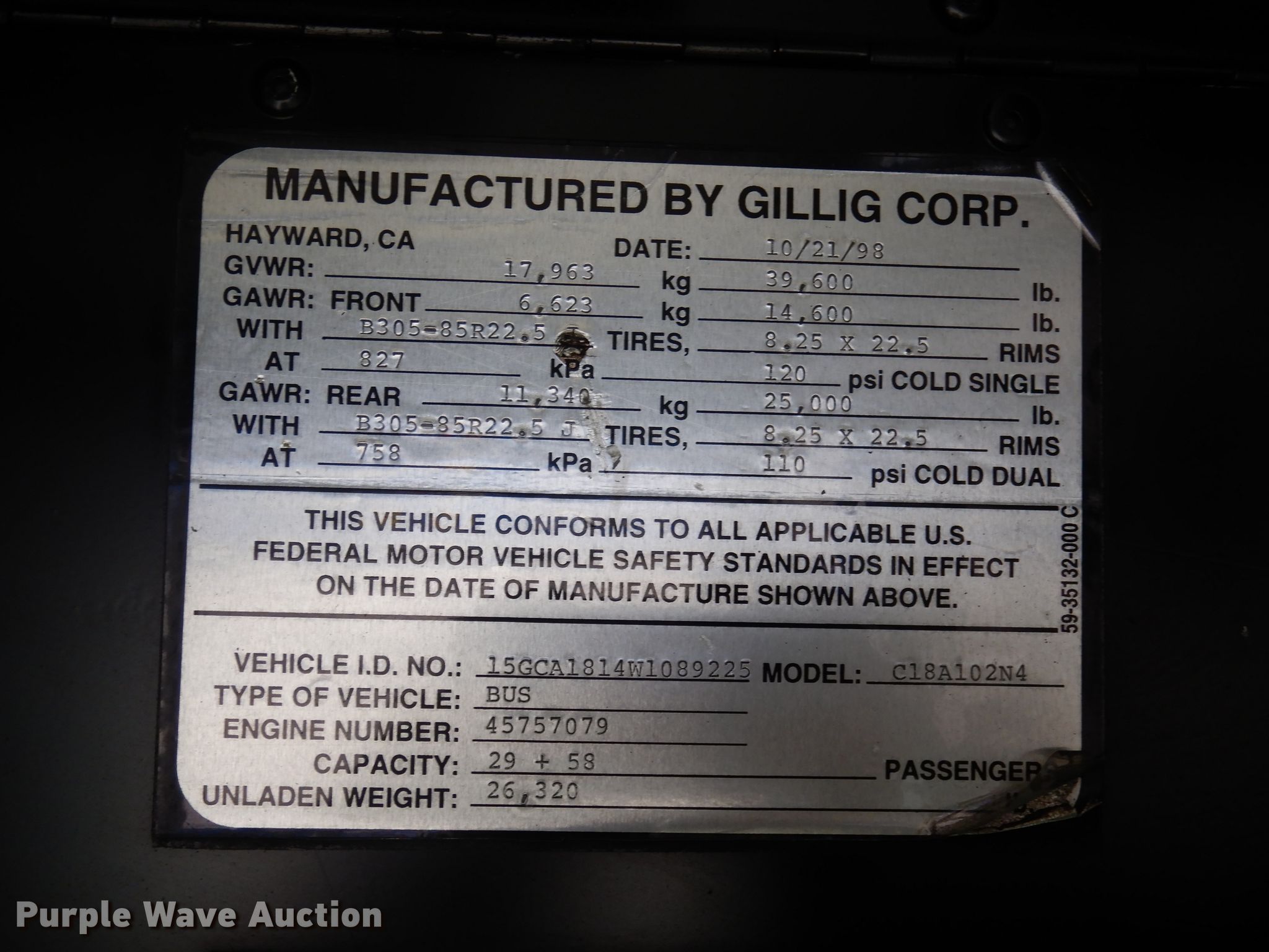 1998 Gillig C18A102N4 shuttle bus. 168,653 miles on hubodometer, Engine hours: 34,828, Unit #: 950. Engine Cummins, Serial: 45757079, Displacement: 8.3L, Cylinders: 6, Fuel type: Diesel. Transmission Automatic. Chassis Axles: Single, Suspension: Air, Brakes: Air, GVWR: 39,600 lbs, Wheelbase: 170". Interior AC, Heat, Heated mirrors, Electric passenger sliding door, Passengers: 29. Tires Size: 12R22.5, Brand: Hankook. Notes Additional parts included, Unit will not start, Engine issues , Unit must be towed or hauled, Non-operational unit. Kansas title. Title distribution may be delayed up to 30 days from verification of funds. 15GCA1814W1089225. Lawrence, KS 66044