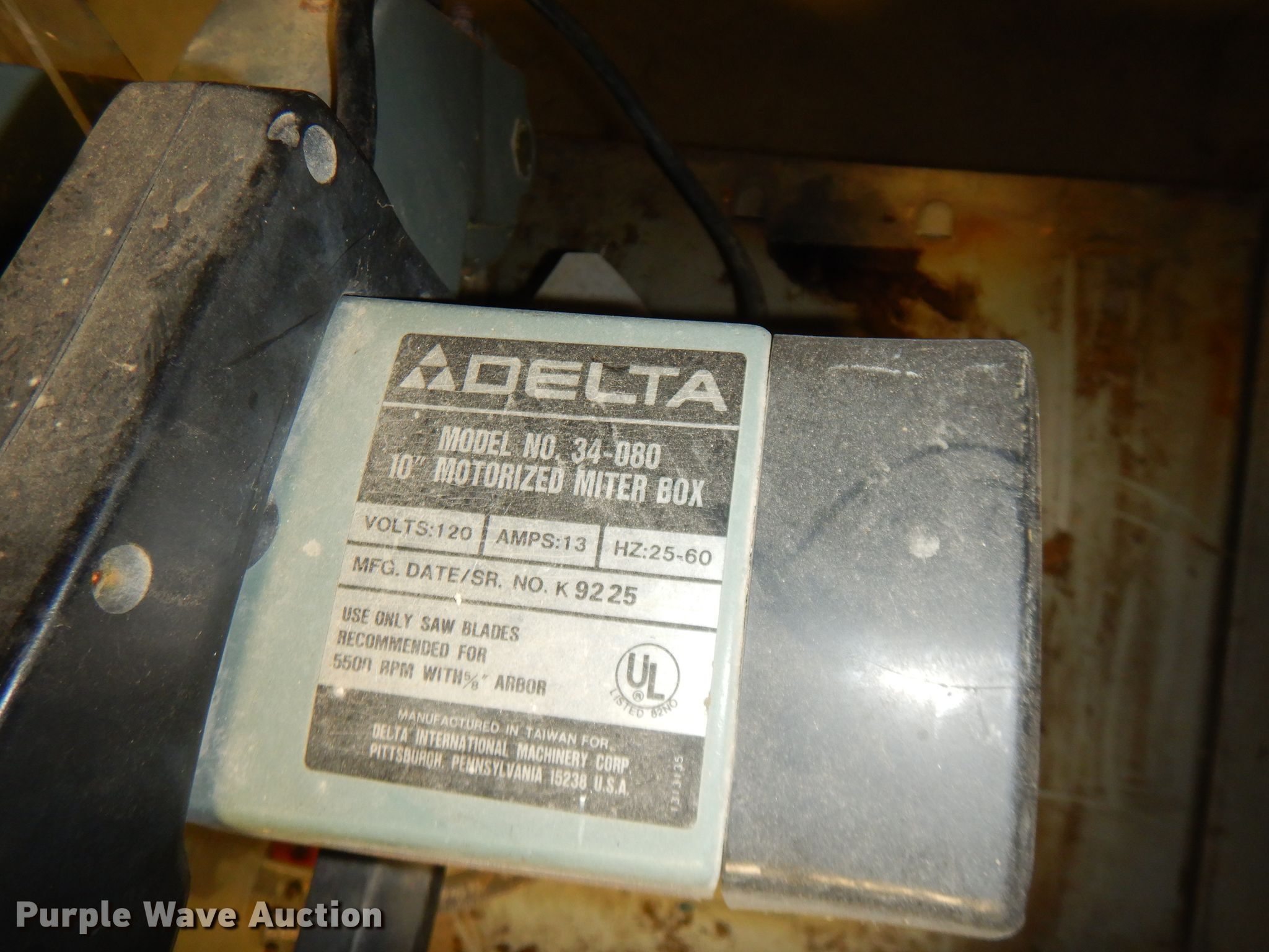 Purple Wave is selling a used Tools in Kansas. This item is a Delta 34-080 miter saw with the following: 10", 120V, Serial 9225
