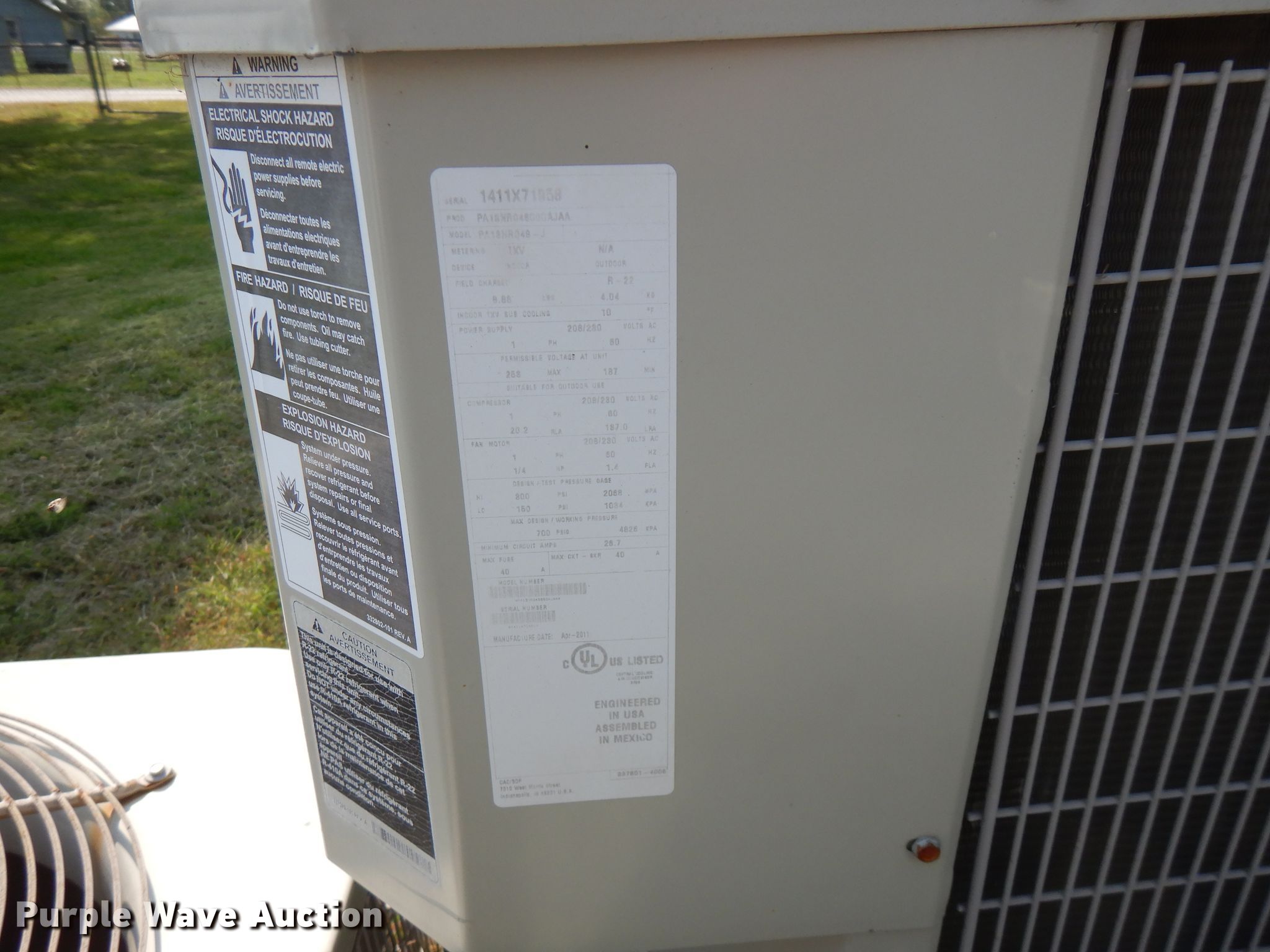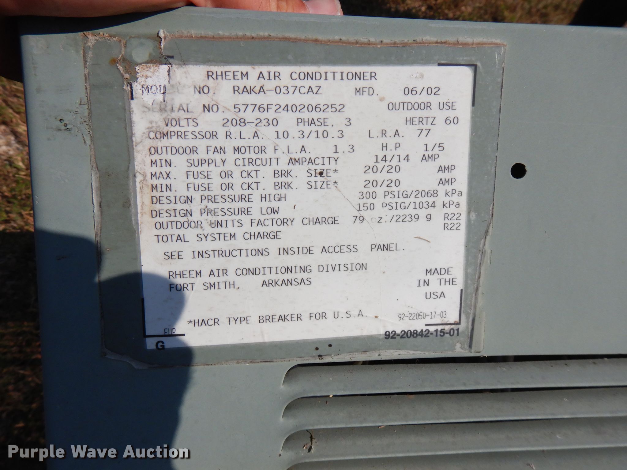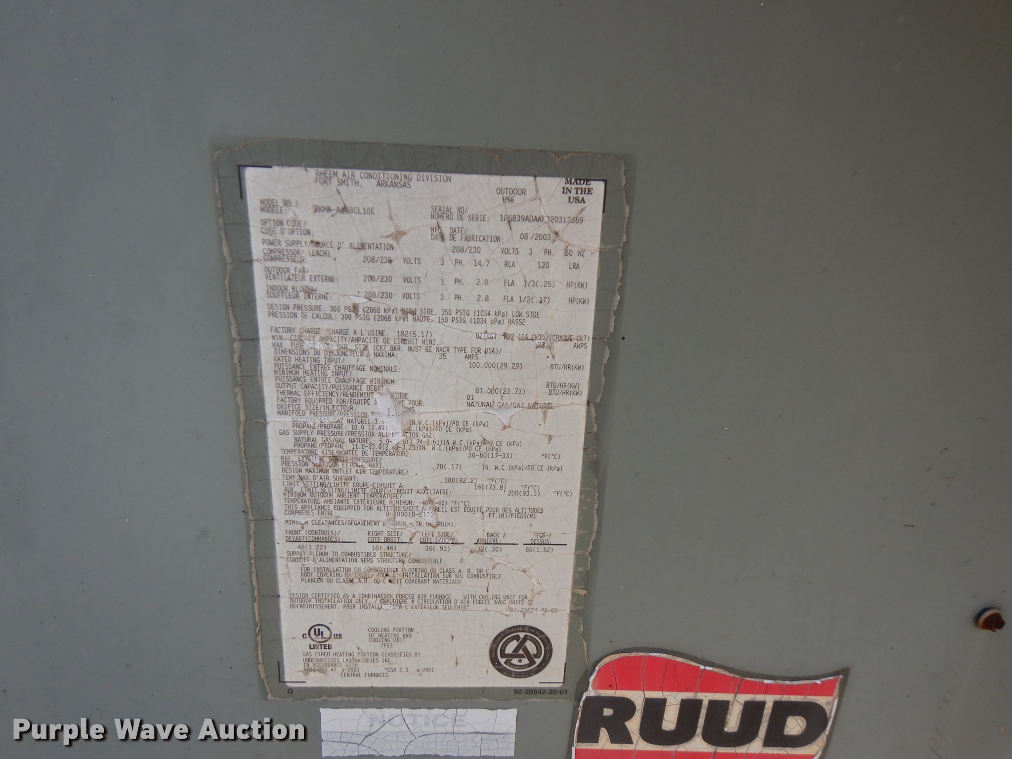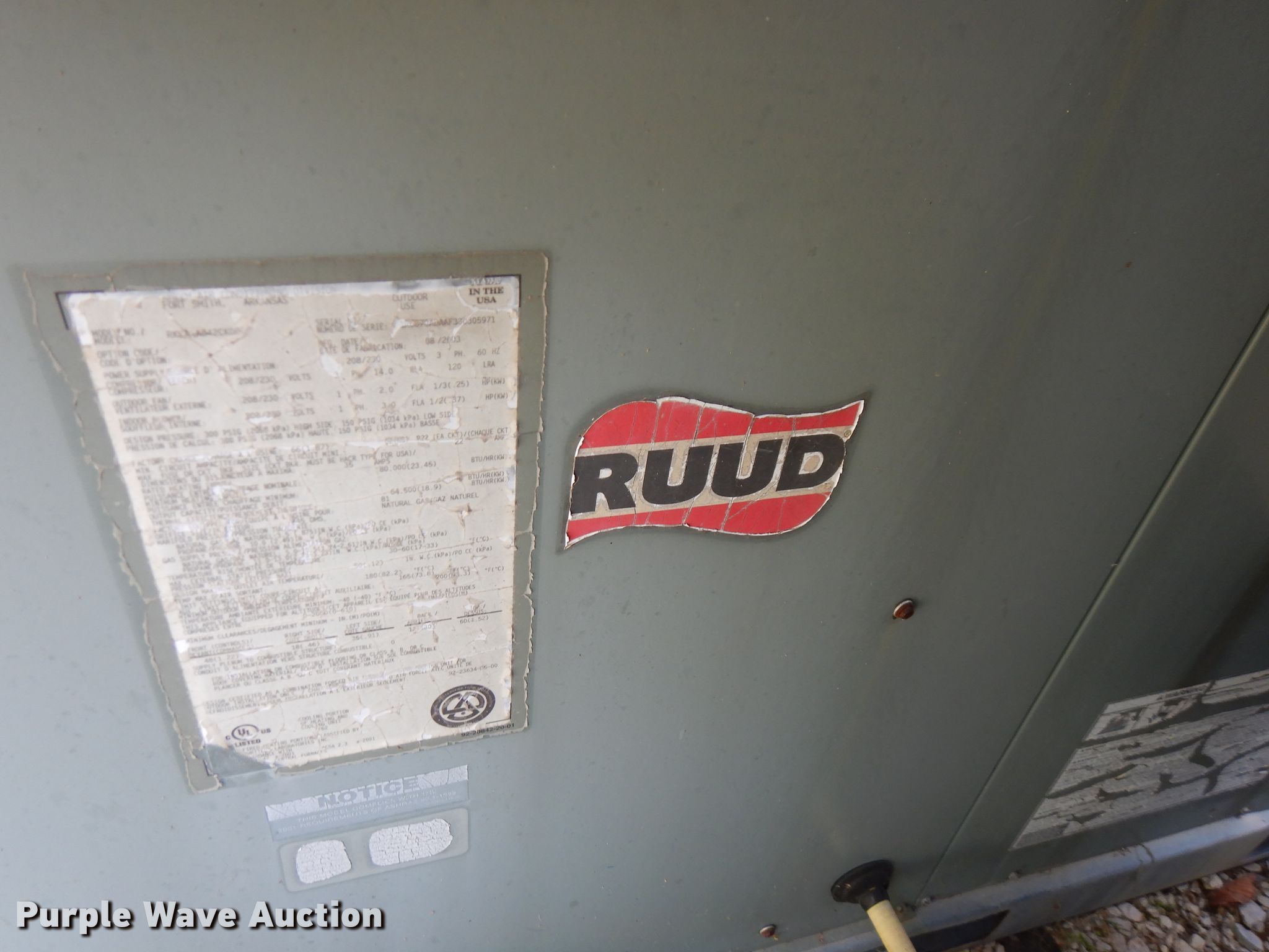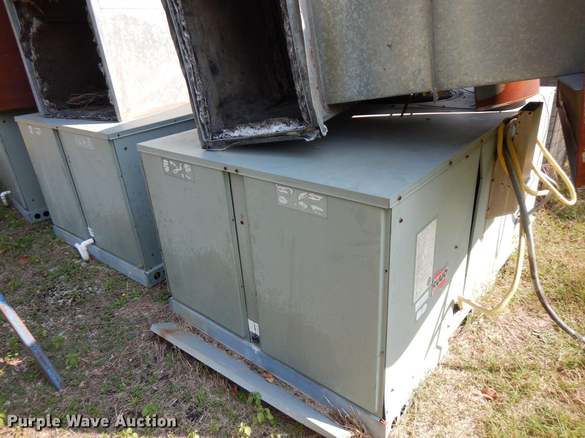 Purple Wave is selling a used Appliances in Kansas. This item is a (9) AC and heat units with the following: Trane XE78, Model PA13PR036-J, Serial 4311X60472, Model PA13NR348-J, Serial 1411X71058, Rheem Air RAKA-037CAZ, Serial 5776F240206252, Trane TTR042C100A1, Serial H30293422, Ruud RKMA-A848CL10E, Serial 1R6839ADAAF320313369, Ruud RKKA-A042CK08E, Serial 1R6870ADAAF320313232, Ruud RKKA-A042CK08E, Serial 1R6870ADAAF320305971, Ruud, Unknown operating conditions