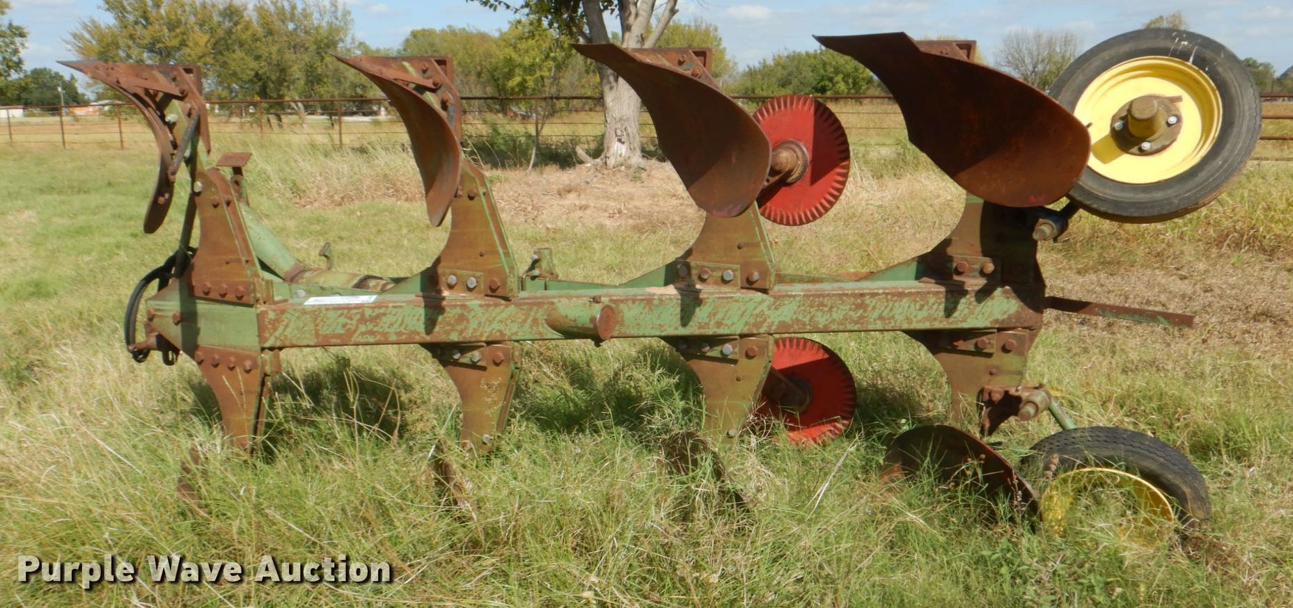 Purple Wave is selling a used Plow in Texas. This item is a John Deere E835A four bottom rollover plow with the following: 5'W, Three point hitch, 4.8-12 tires, Serial 100132A