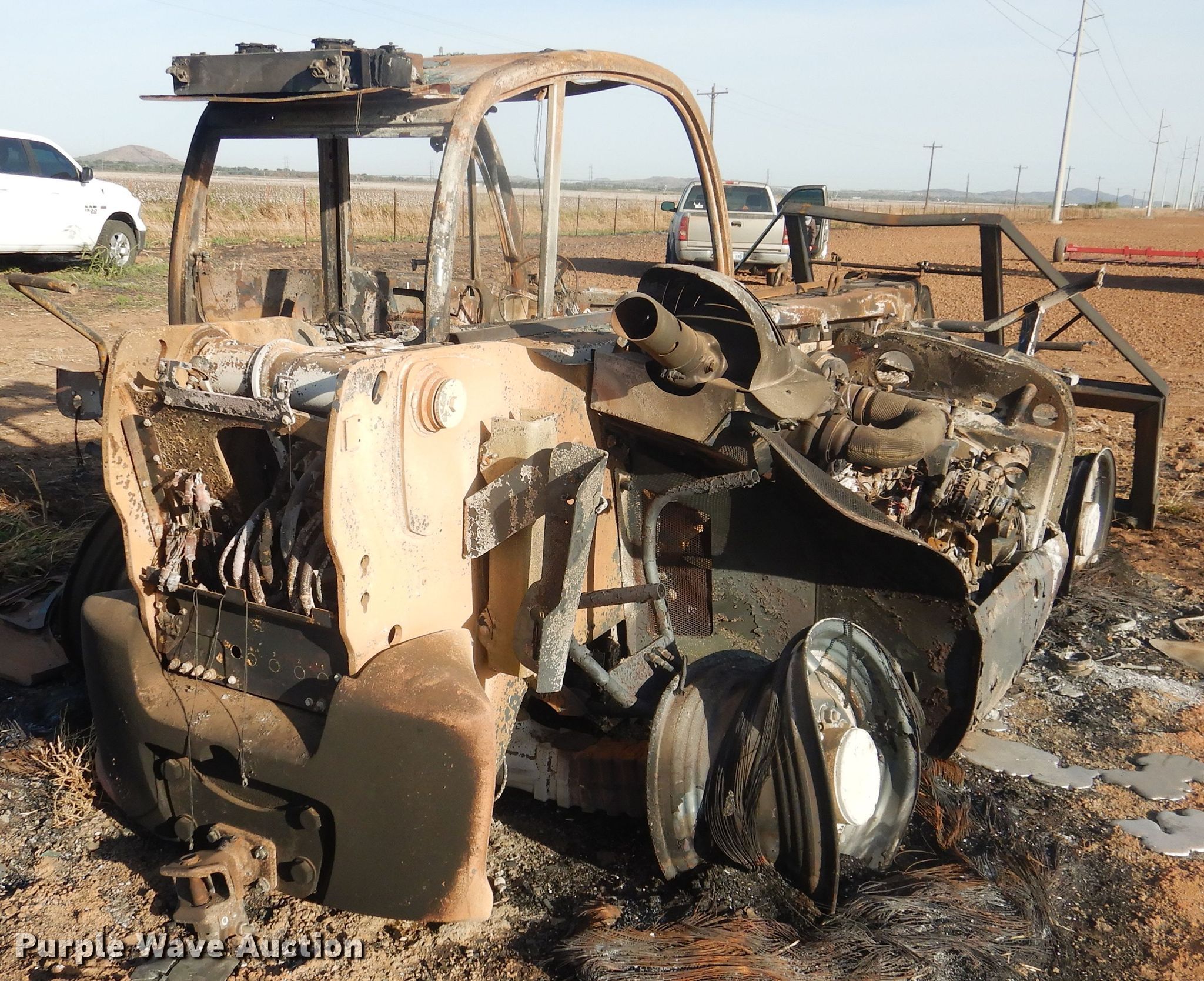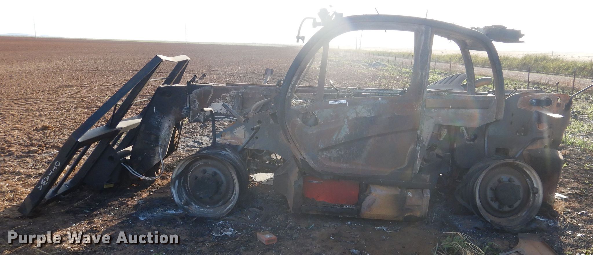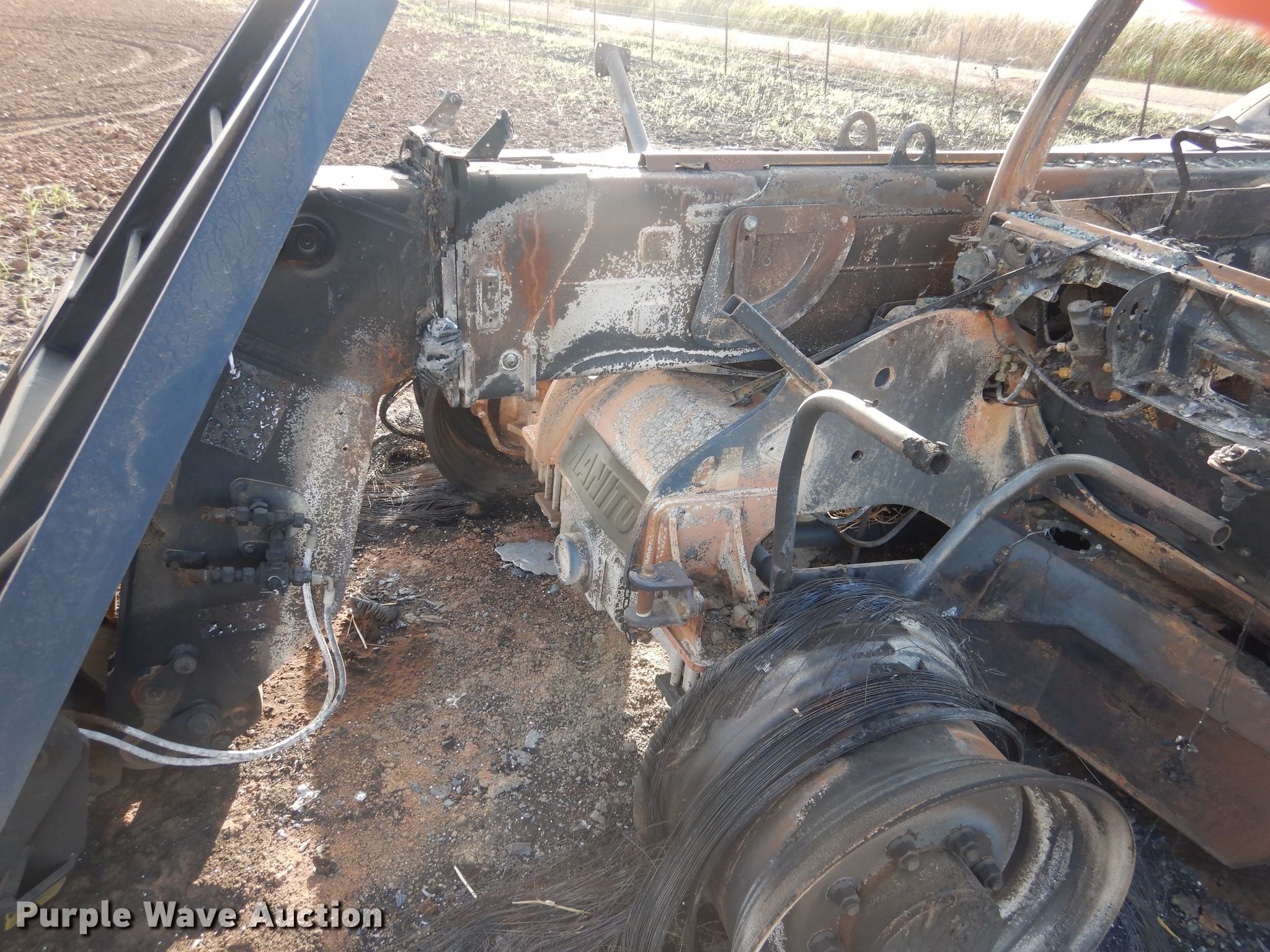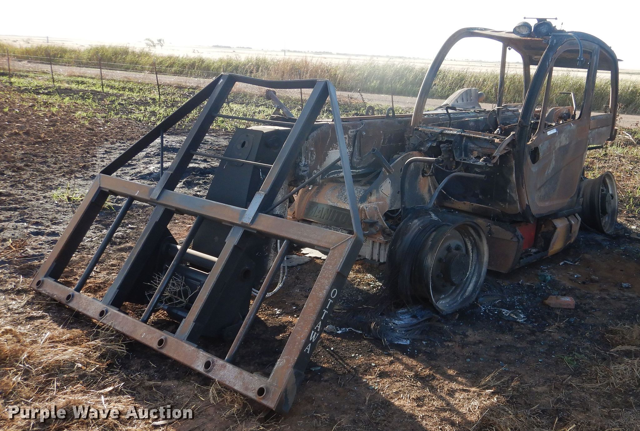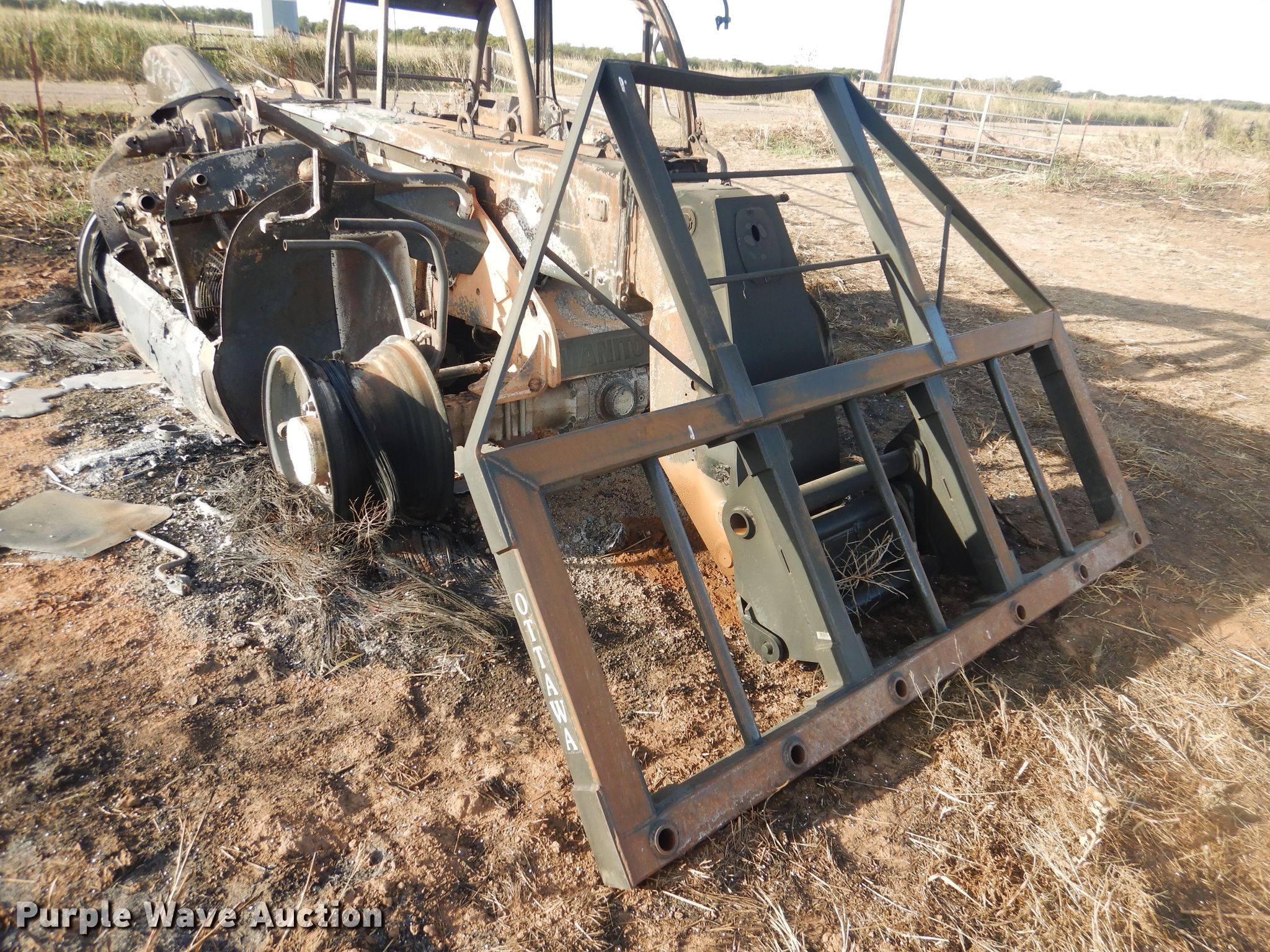 2020 Manitou MLT840-145 telehandler. Unknown hours on meter, Serial: 01019674, Claim #: 2020000390. Engine John Deere, Cylinders: 4, Fuel type: Diesel. Transmission Powershift, 3F - 3R. Operators station Enclosed cab. Operational Maximum lift capacity: 2,900 lbs, Maximum lift height: 25', Boom stages: 2, Tilt carriage, Quick attach: Hydraulic, 2020 Ottawa bale spear Serial 303657 , Spears included. Notes Fire damage, No tires. Insurance salvage. Oklahoma Farm Bureau Insurance. Snyder, OK 73566