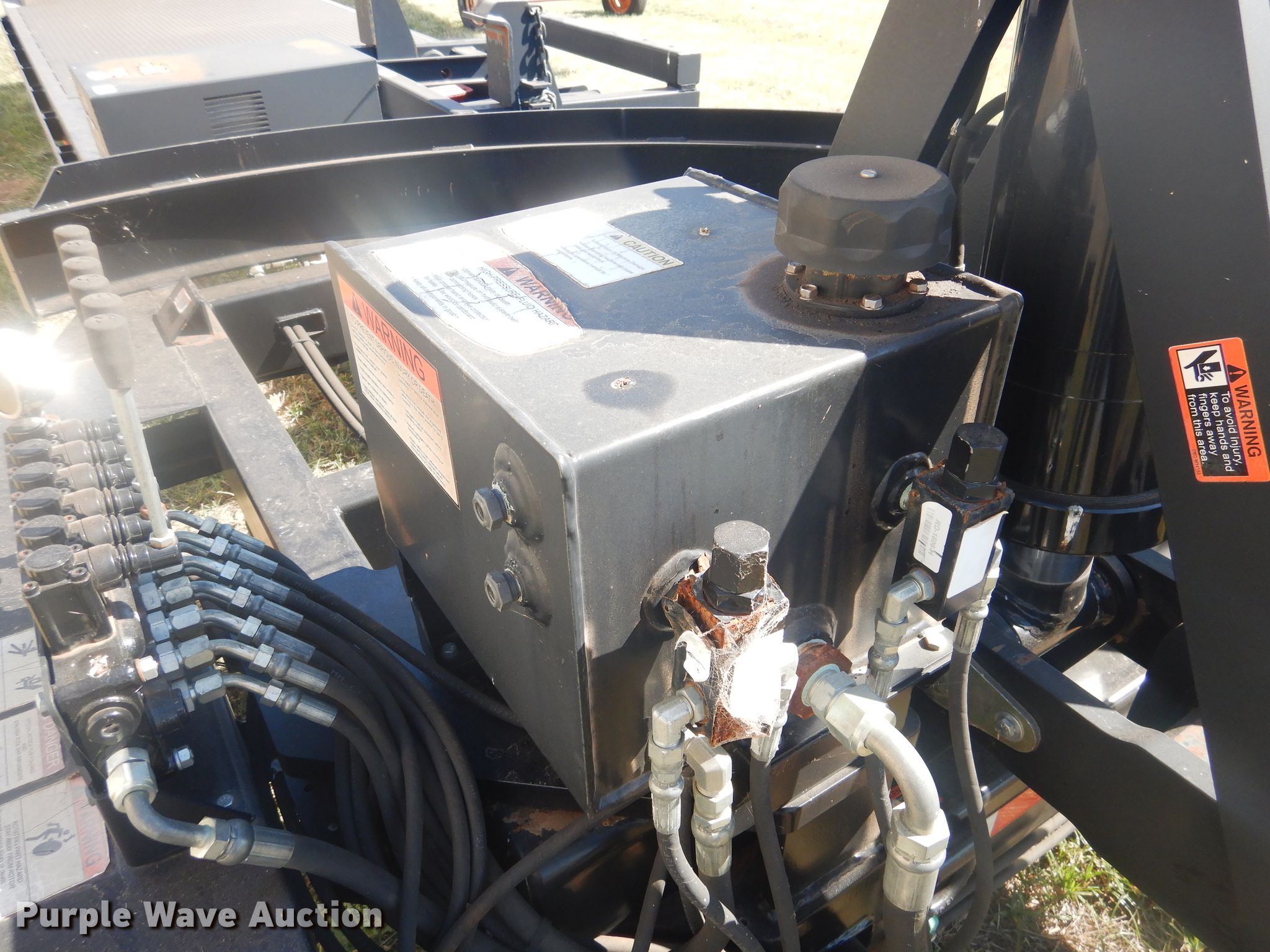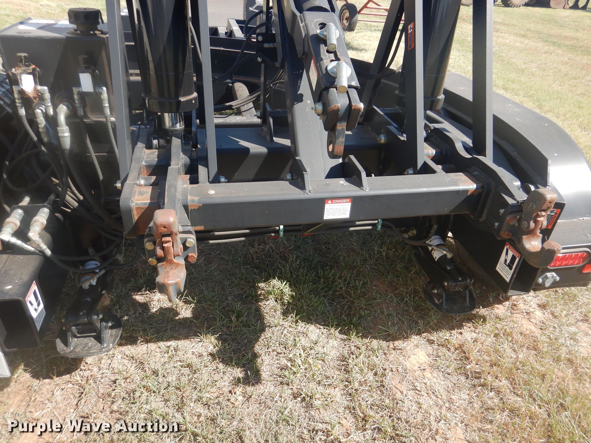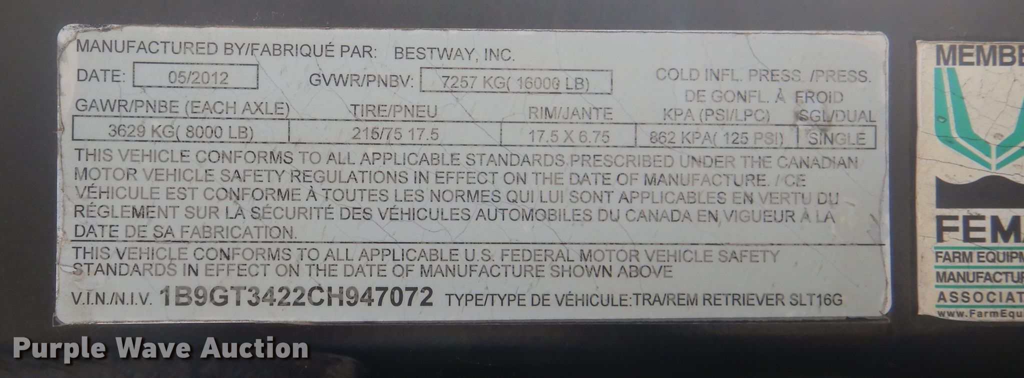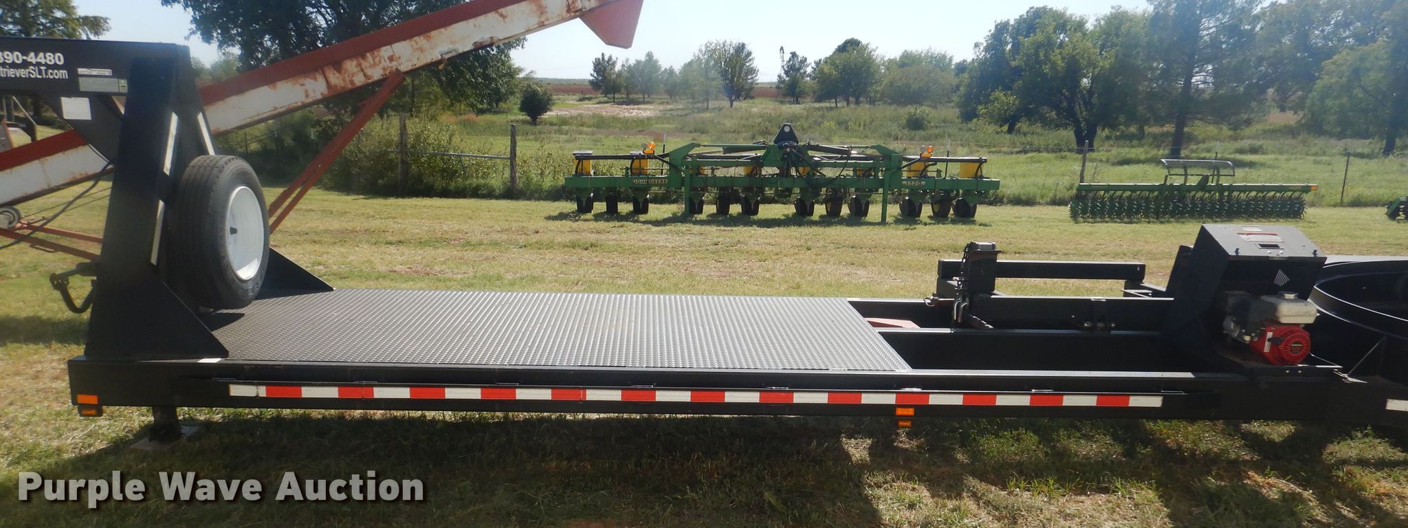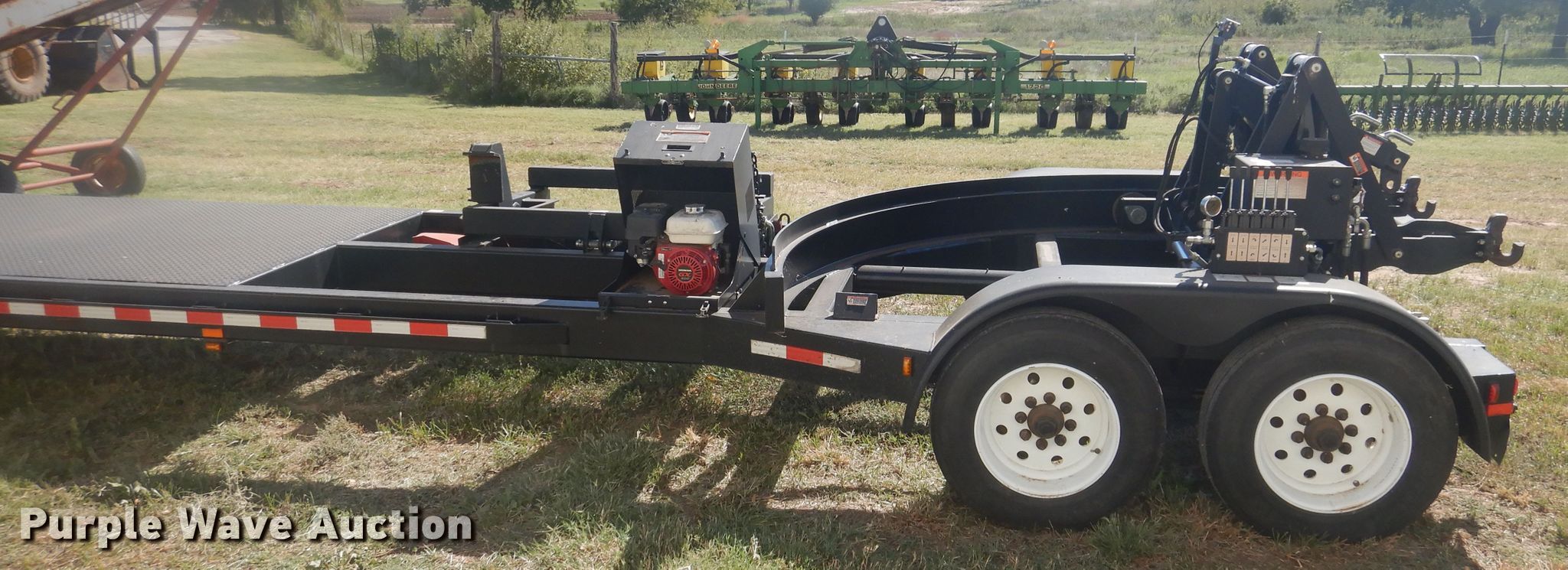 Purple Wave is selling a used Ag Equip. or Header Trailer in Texas. This item is a 2012 Bestway implement retrieval trailer with the following: 35'L overall, 28'L x 101"W deck, Self-contained hydraulics, Trailer controls, Rear camera with monitor, Case adapters for header, Honda GX360 single cylinder gas engine, Rear three point hitch, Steel construction, Single leg landing gear, Spring suspension, Electric brakes, Tandem axle, Steel wheels, 215/75R17 tires, GVWR 16,000 lbs, GAWR 8,000 lbs