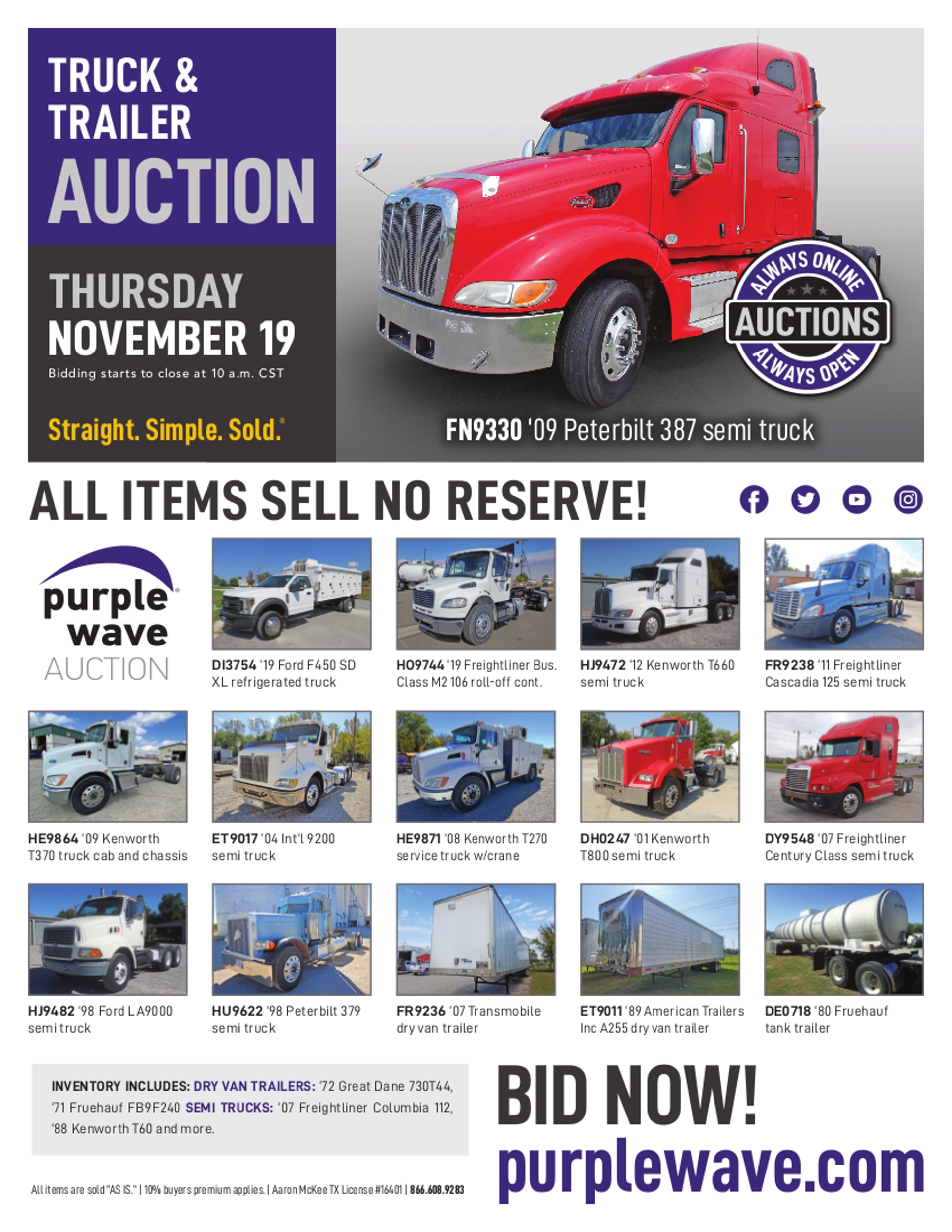 This auction is conducted by Purple Wave, Inc., whose home office is 825 Levee Drive, Manhattan, Kansas. Aaron McKee, Texas auctioneer license # 16401, operates Purple Wave, Inc. Complaints against us may be directed to the Texas Department of Licensing and Regulation, P.O. Box 12157, Austin, Texas 78711, (512) 463-6599. For additional required information, see the attached document.