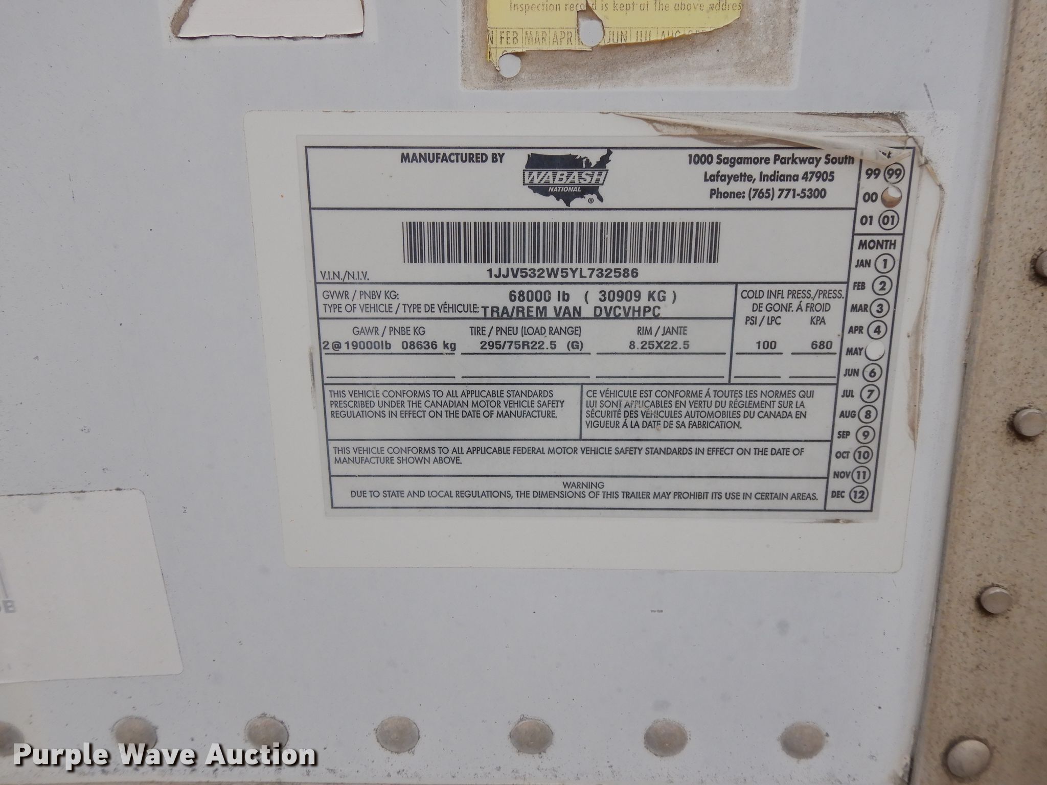 Purple Wave is selling a used Dry Van Trailer in Kansas. This item is a 2000 Wabash DVCVHPC dry van trailer with the following: 53'L x 102"W, Wood deck, Dual leg landing gear, Air suspension, Air brakes, Tandem axle, Steel wheels, 275/80R22.5 tires, GVWR 68,000 lbs, GAWR 19,000 lbs, Unit# 326