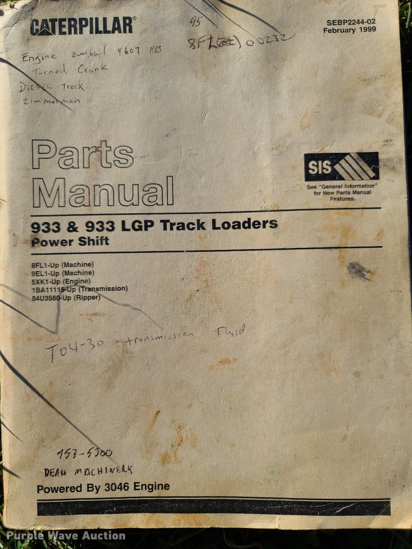 1995 Caterpillar 933 track loader. 5,001 hours on meter, Serial: 8FL00232. Engine Caterpillar 3046, Cylinders: 6, Fuel type: Diesel. Transmission Powershift, 3F - 3R. Operators station OROPS, Bucket controls: Joystick. Operational Quick coupler: Manual, Counter weights, Bucket Make: Caterpillar , Model: 110-6379X0, Width: 78", Cutting edge: Bolt-on Teeth: 8.. Tracks Width: 14", Grouser pads: Triple. 231 Jones Rd. Richland, MO 65556