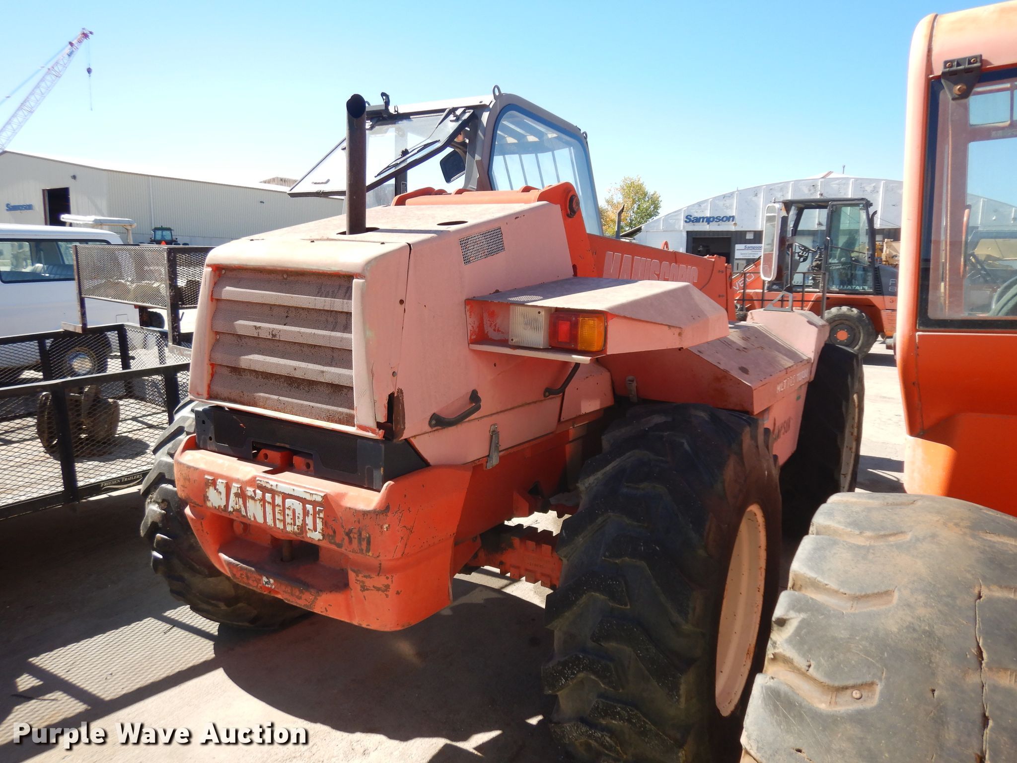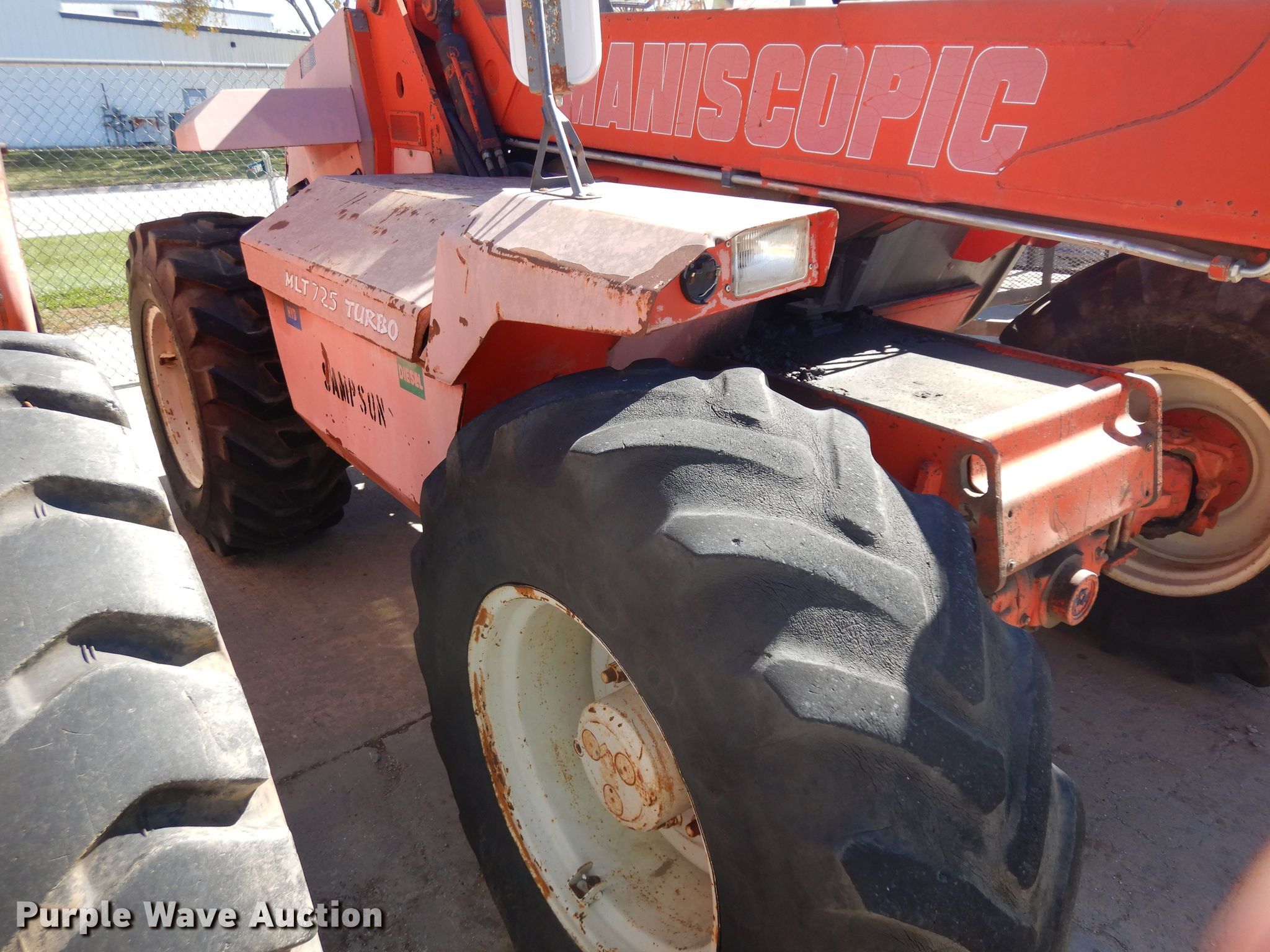 1994 Manitou MLT725 telehandler. 3,807 hours on meter, Serial: 102535. Engine Perkins, Cylinders: 4, Fuel type: Diesel. Transmission Powershift, 4F - 4R, Four wheel drive. Operators station Enclosed cab, Steering: Four wheel. Operational Boom stages: 2, Fork length: 46", Tilt carriage. Tires Size: 17.5LR24. Notes Unknown operating condition. Sampson Construction. 6020 N 60th St. Lincoln, NE 68507