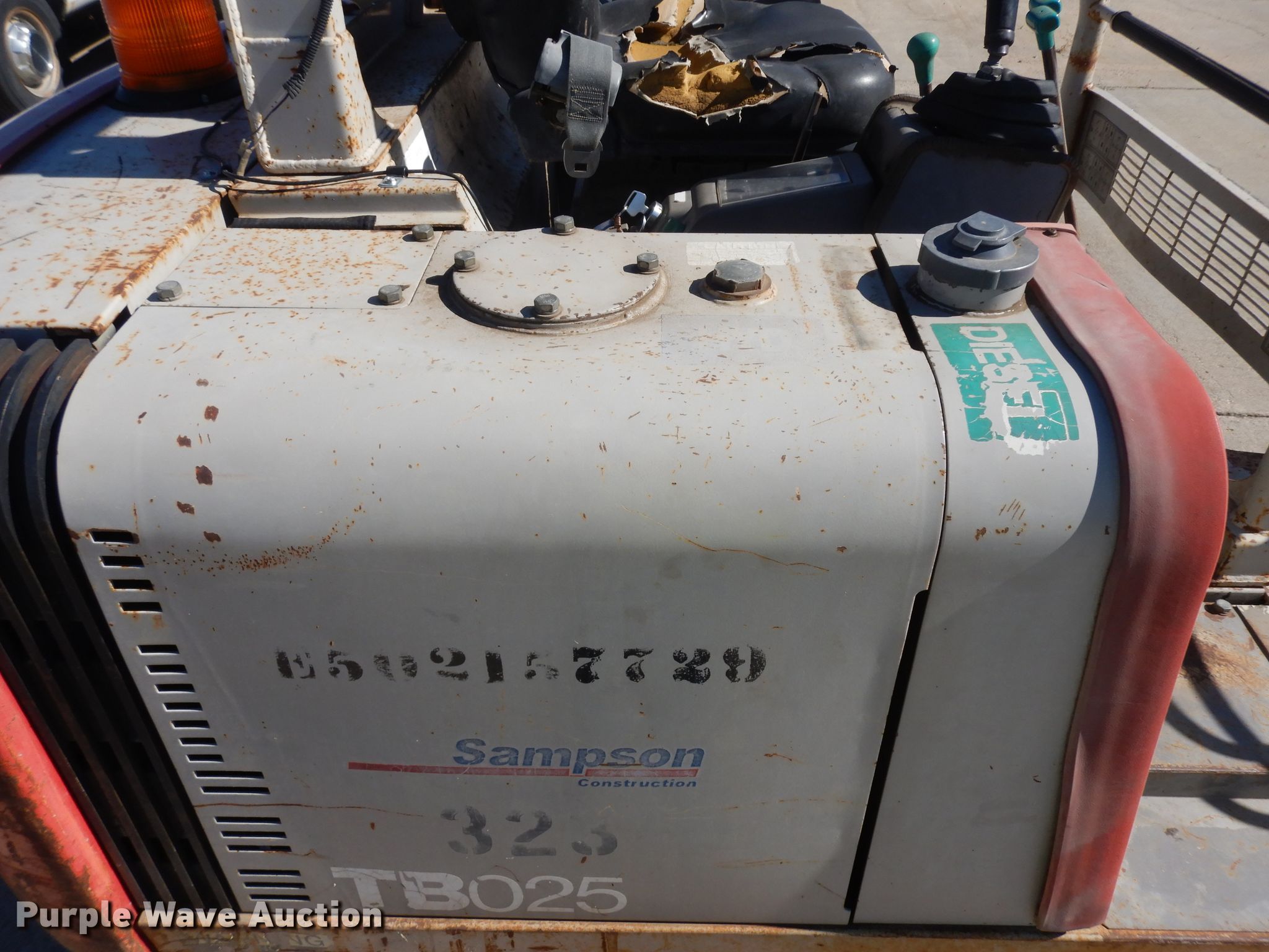 1999 Takeuchi TB025 mini excavator. 4,780 hours on meter, Serial: 1258227. Engine Yanmar , Cylinders: 3, Fuel type: Diesel. Transmission Hydrostatic. Operators station OROPS. Operational Auxiliary hydraulics Standard, Backfill blade Width: 57", Boom Swing, Stick Stick length: 56.5", Quick coupler: Mechanical, Bucket Width: 18", Cutting edge: Bolt on Teeth: 4.. Tracks Width: 12", Rubber. Sampson Construction. 6020 N 60th St. Lincoln, NE 68507