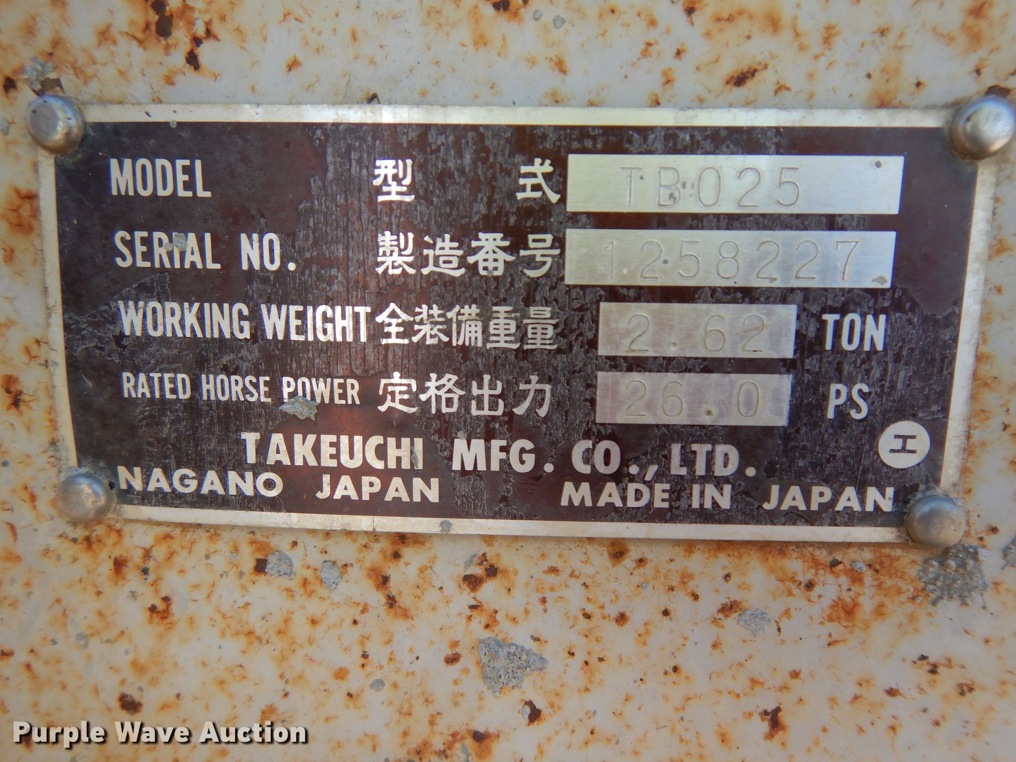 Purple Wave is selling a used Mini Excavator in Nebraska. This item is a 1999 Takeuchi TB025 mini excavator with the following: 4,780 hours on meter, Serial: 1258227