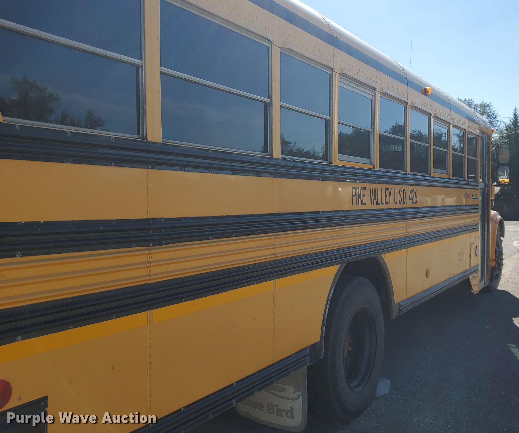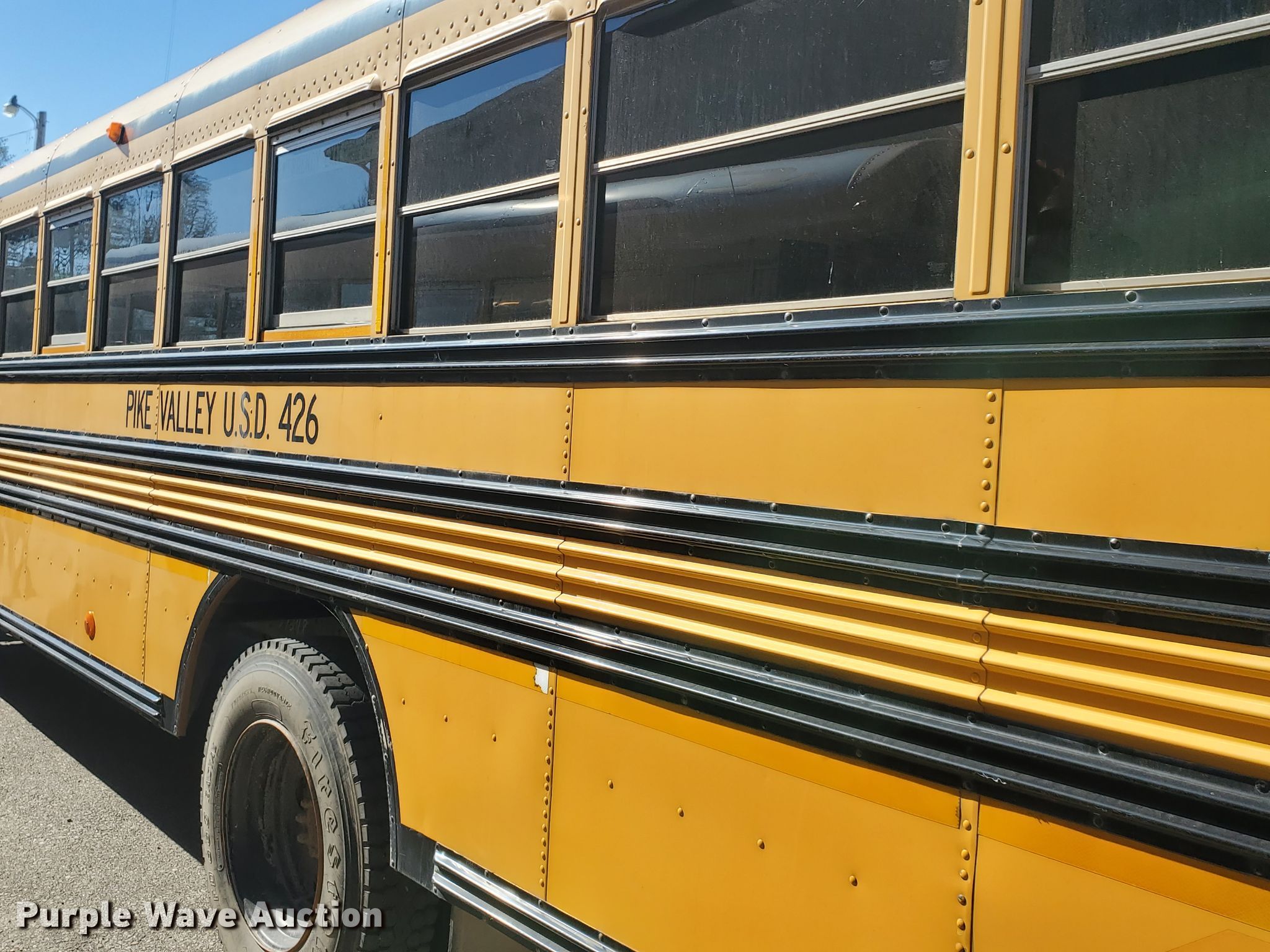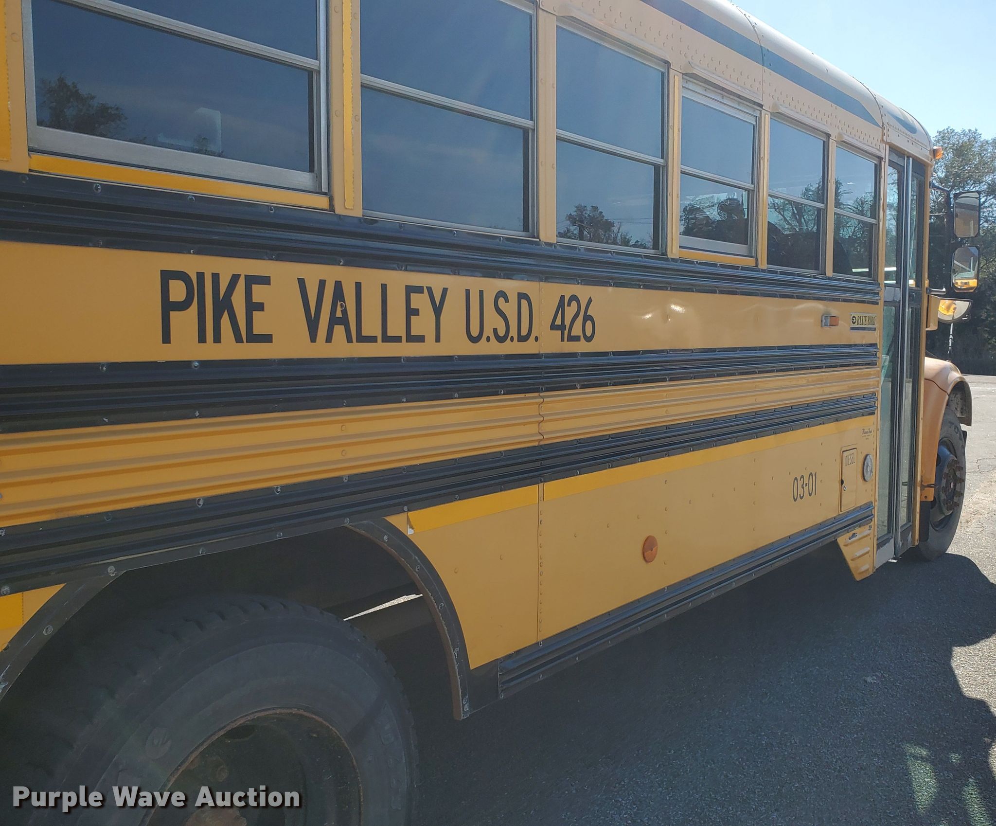 2003 International 3800 Blue Bird school bus. 219,555 miles on odometer, Engine hours: 6,968. Engine International DT466, Displacement: 7.6L, Cylinders: 6, Fuel type: Diesel. Transmission Allison, Automatic. Chassis Axles: Single, Suspension: Spring, Brakes: Hydraulic. Interior Heat, Auxiliary controls, Passengers: 53. Tires Size: 10R22.5. Kansas Title. 1HVBBAAM63H578128. USD 426 Pike Valley. 100 School St. Scandia, KS 66966