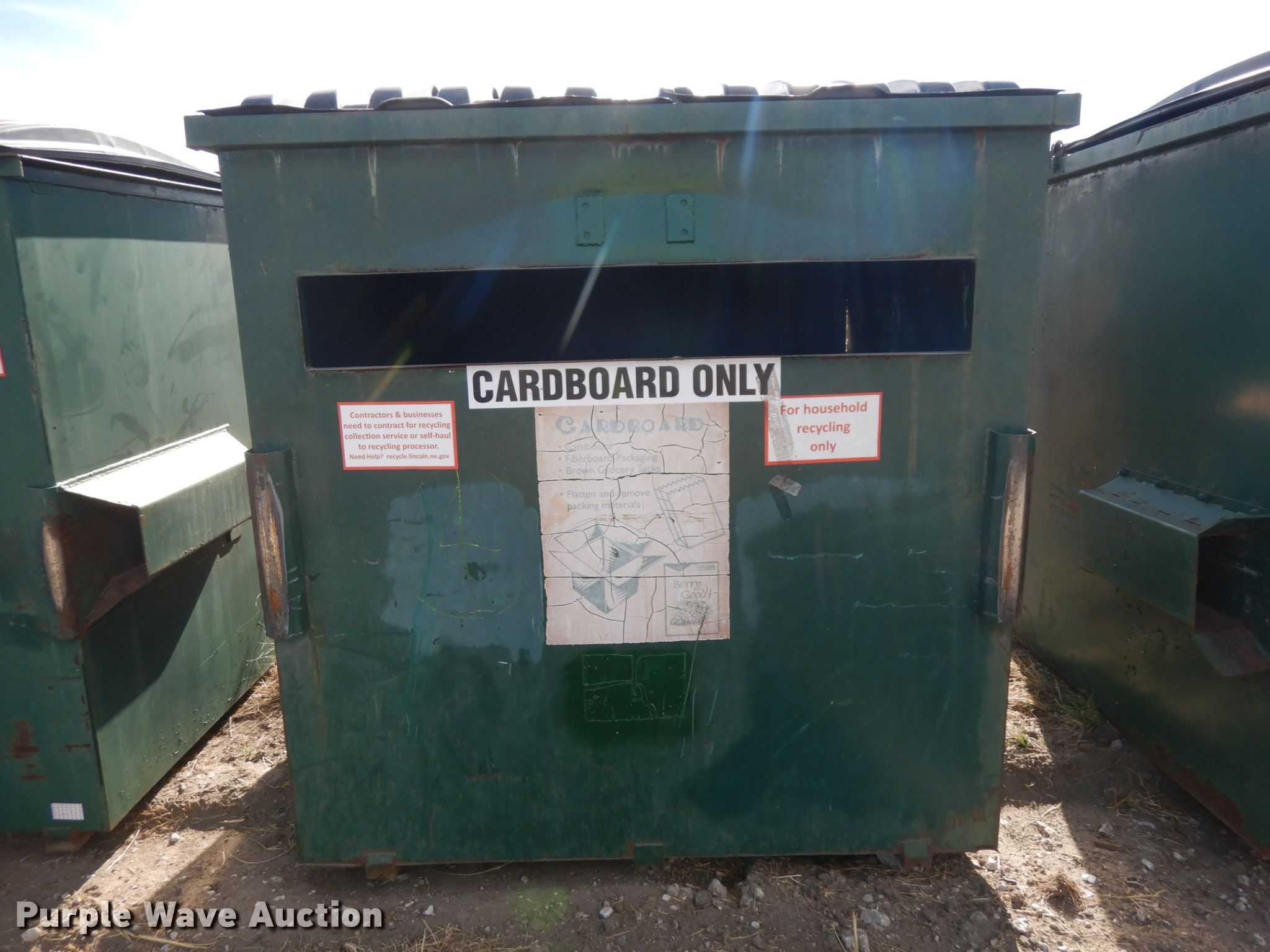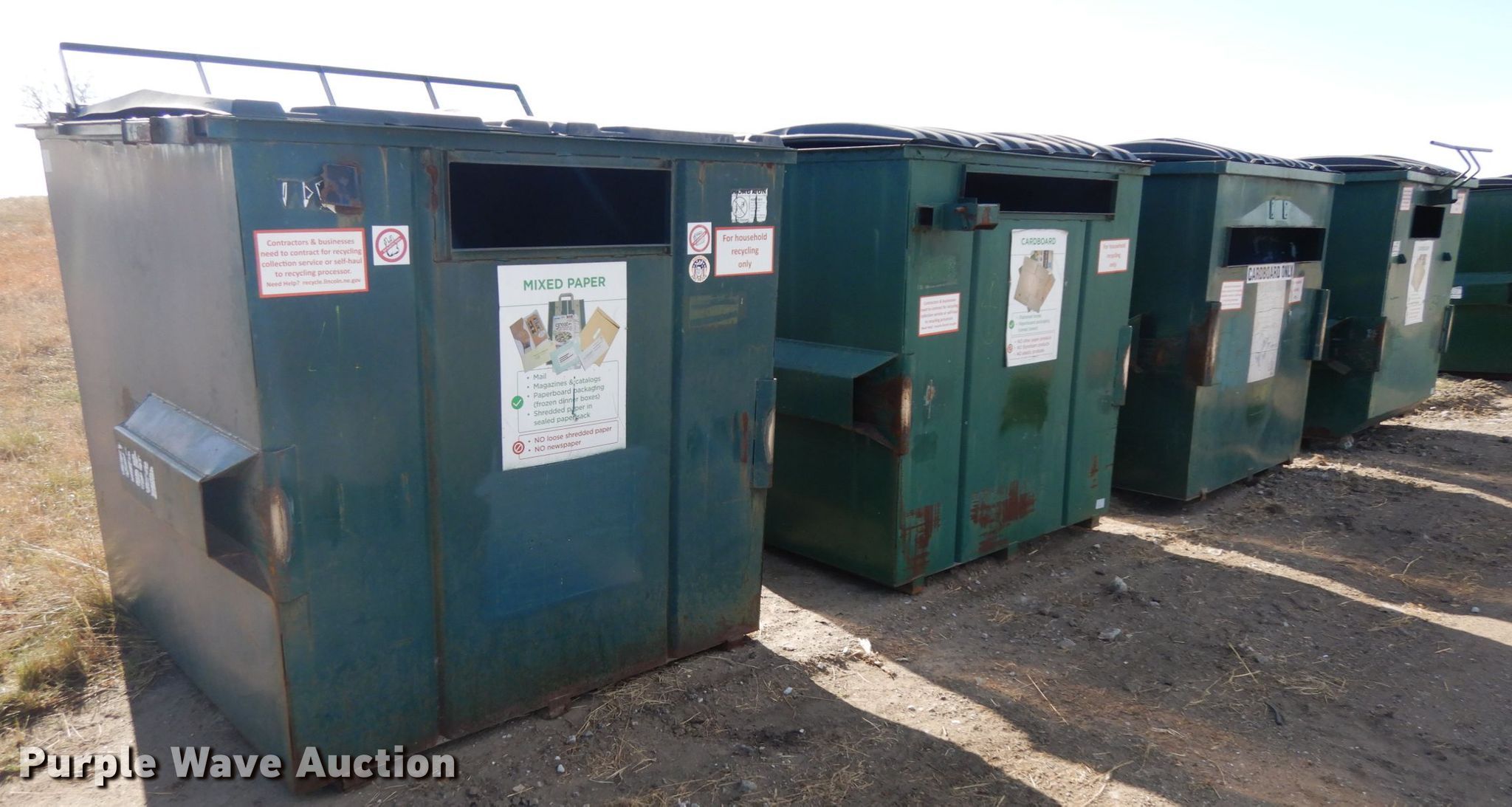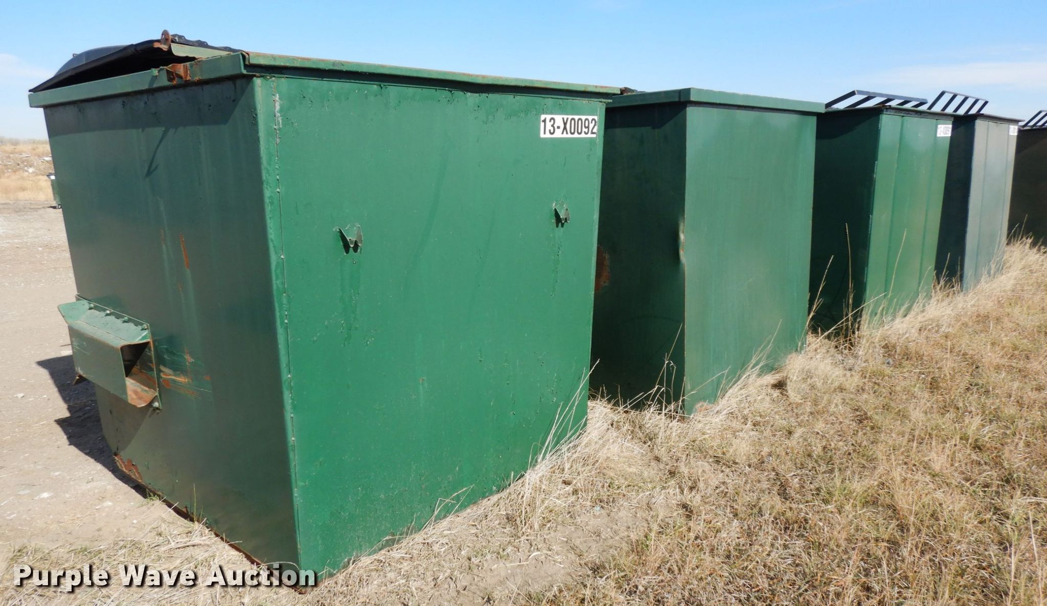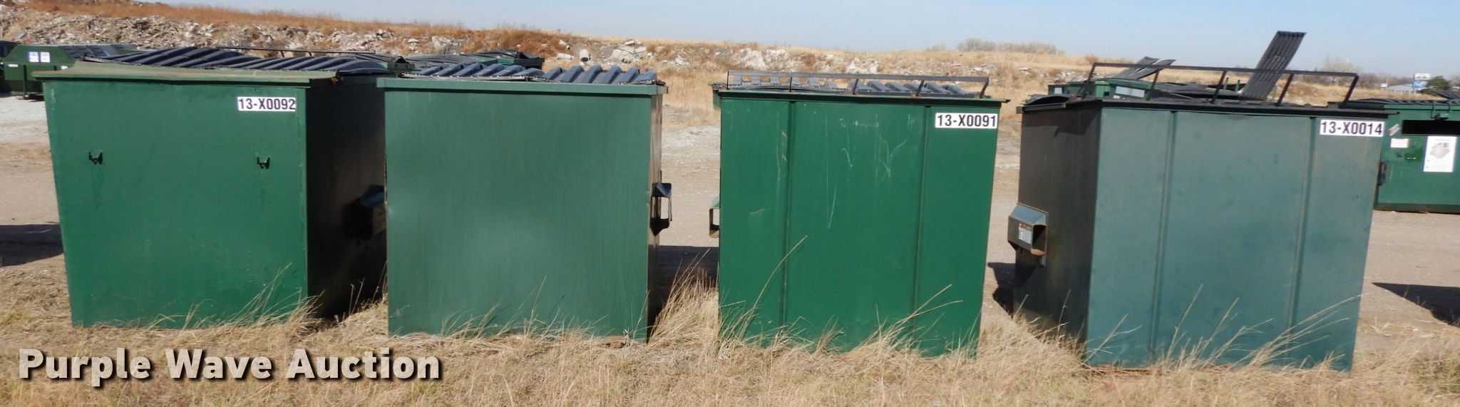Purple Wave is selling a used Refuse or Compaction Equip. in Nebraska. This item is a (4) dumpsters with the following: Approx. 70"W x 74"D x 67"H, Eight yd. capacities, EIN 13-X0092, 13-37770, 13-X0091, 13-X0014, Unit# 4