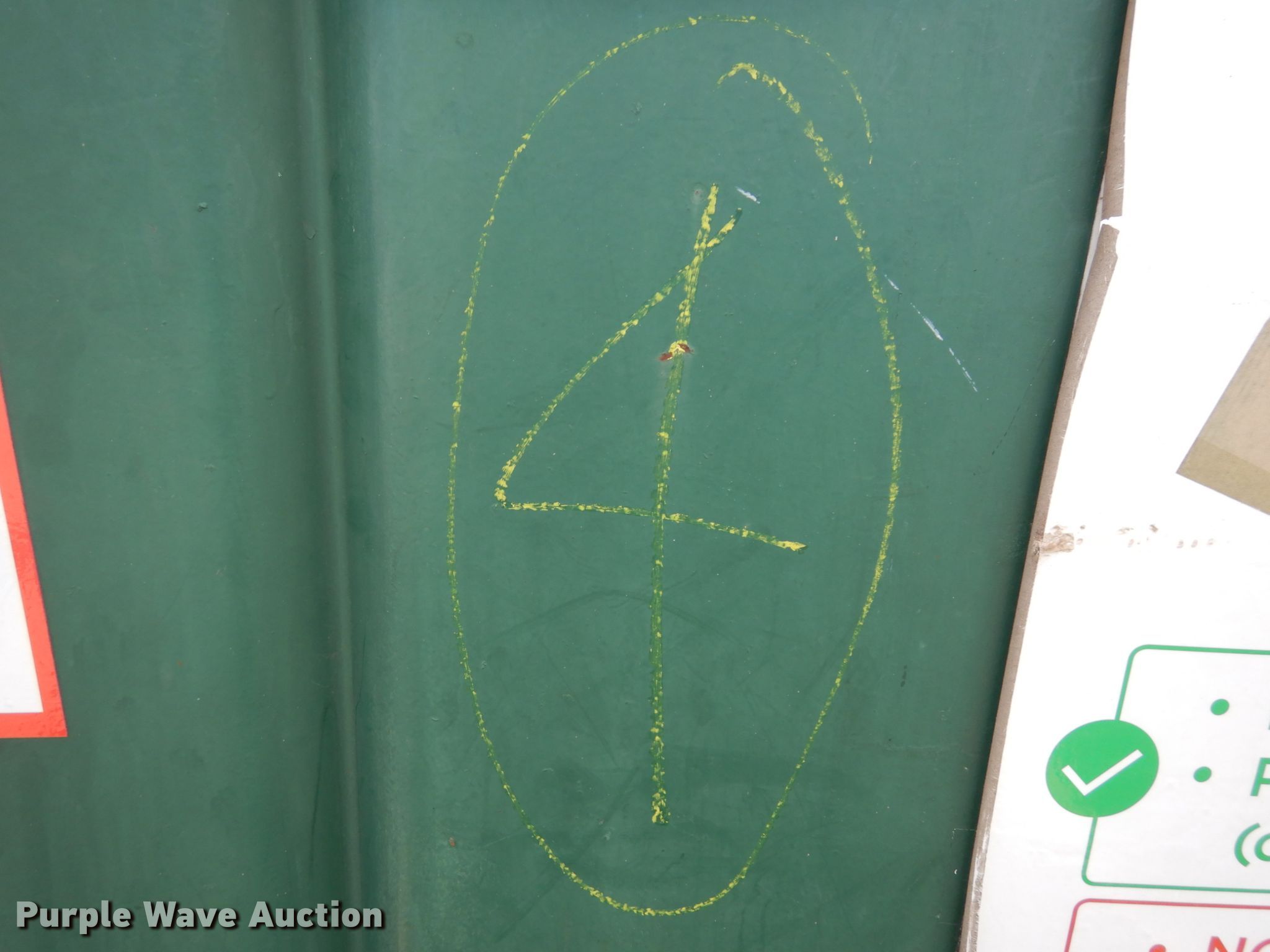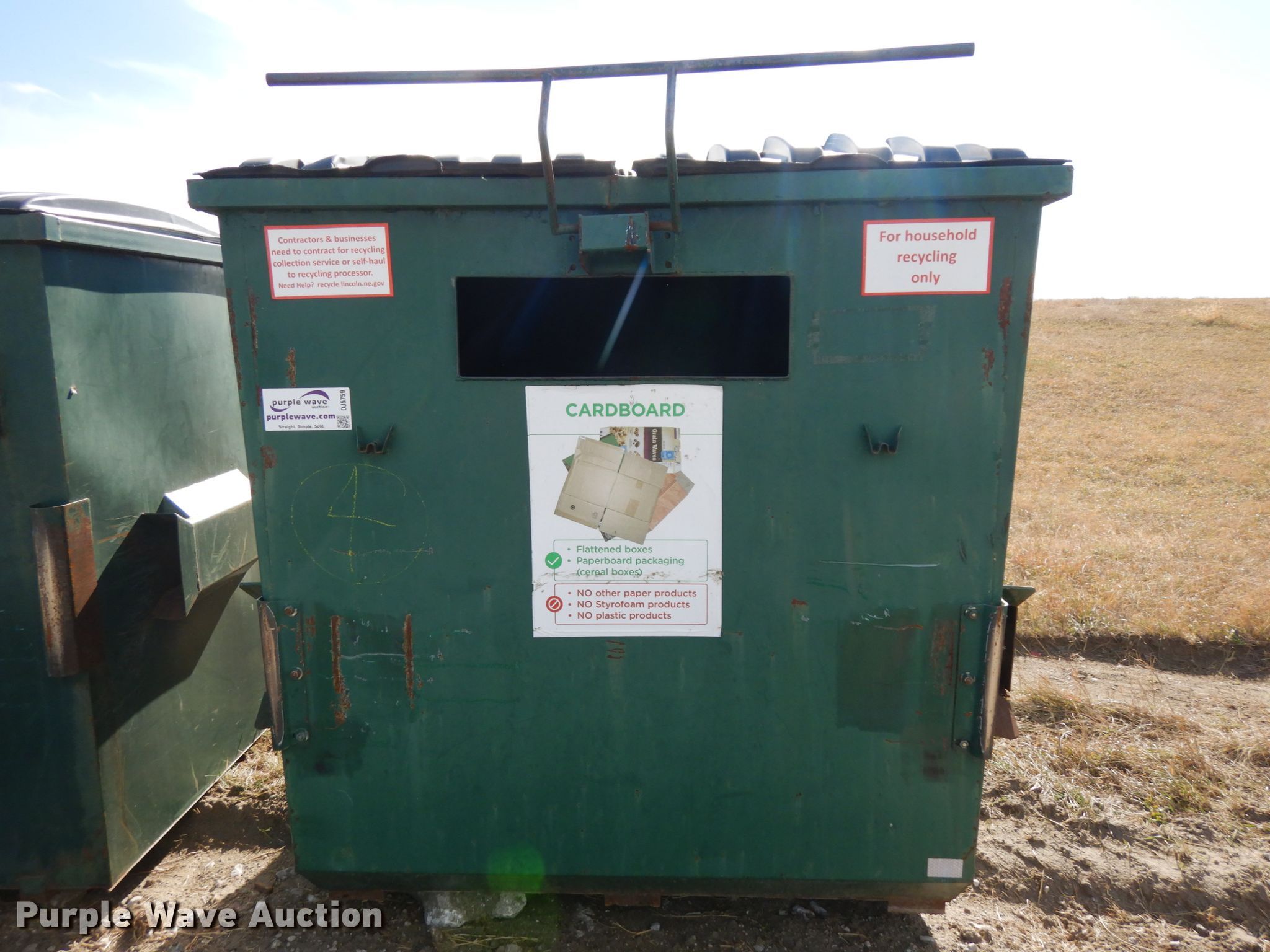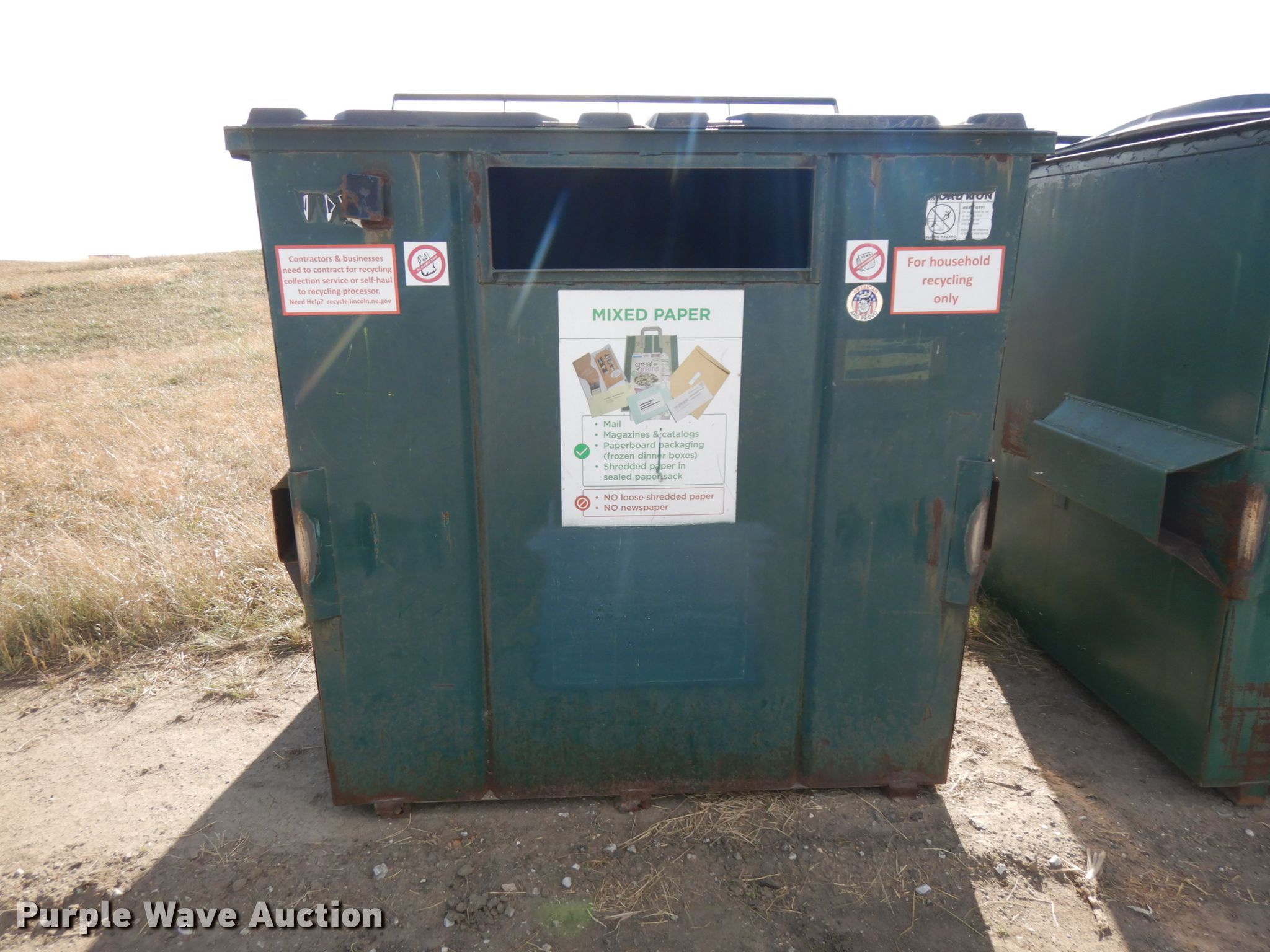 Purple Wave is selling a used Refuse or Compaction Equip. in Nebraska. This item is a (4) dumpsters with the following: Approx. 70"W x 74"D x 67"H, Eight yd. capacities, EIN 13-X0092, 13-37770, 13-X0091, 13-X0014, Unit# 4