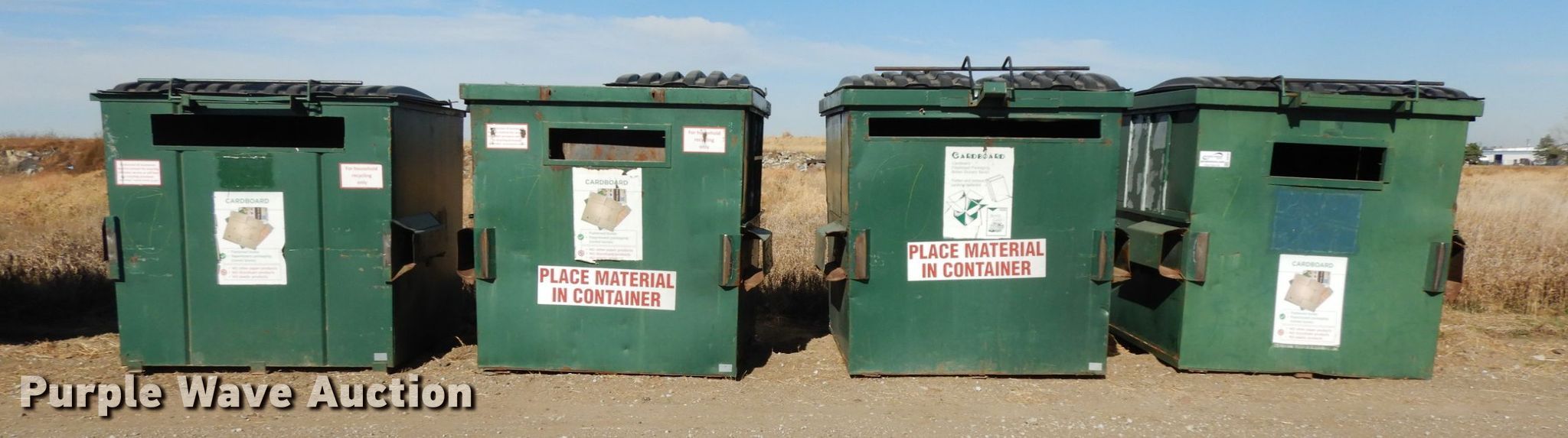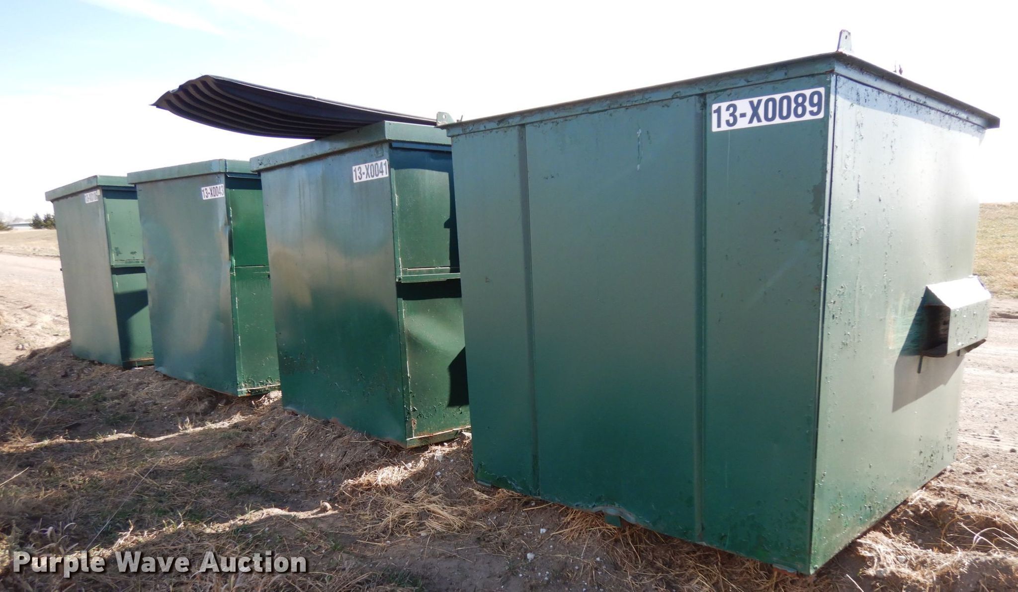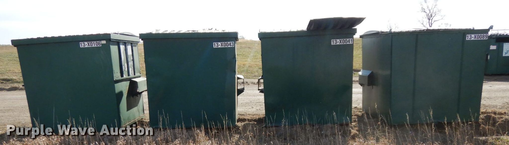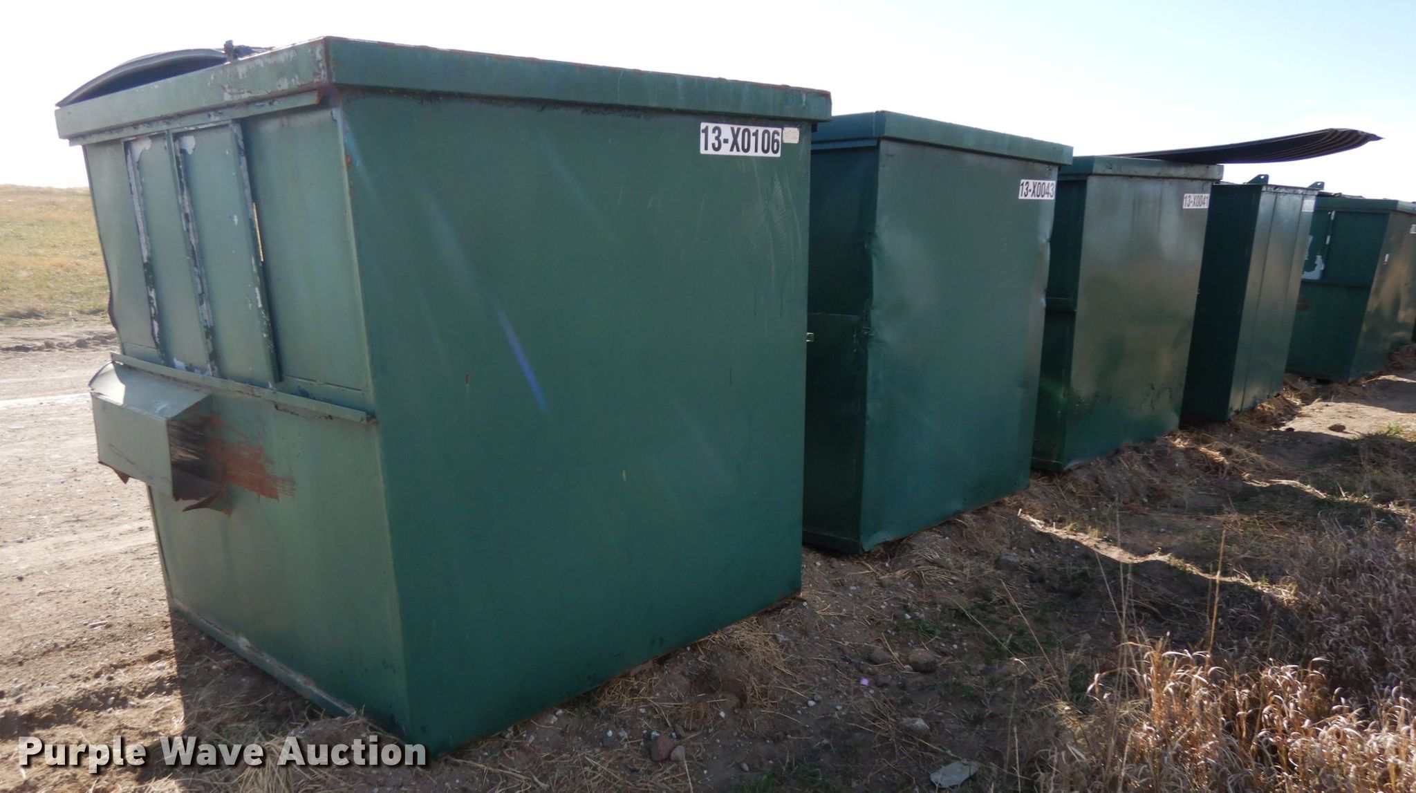 Purple Wave is selling a used Refuse or Compaction Equip. in Nebraska. This item is a (4) dumpsters with the following: Approx. 69"W x 73"D x 75"H, Eight yd. capacities, EIN 13-X0106, 13-X0043, 13-X0041, 13-X0089, Unit# 7