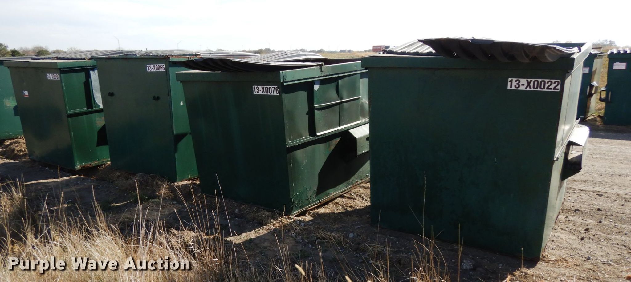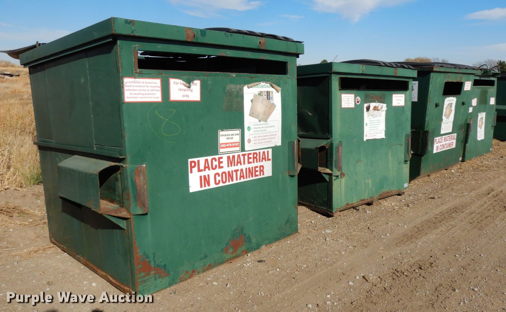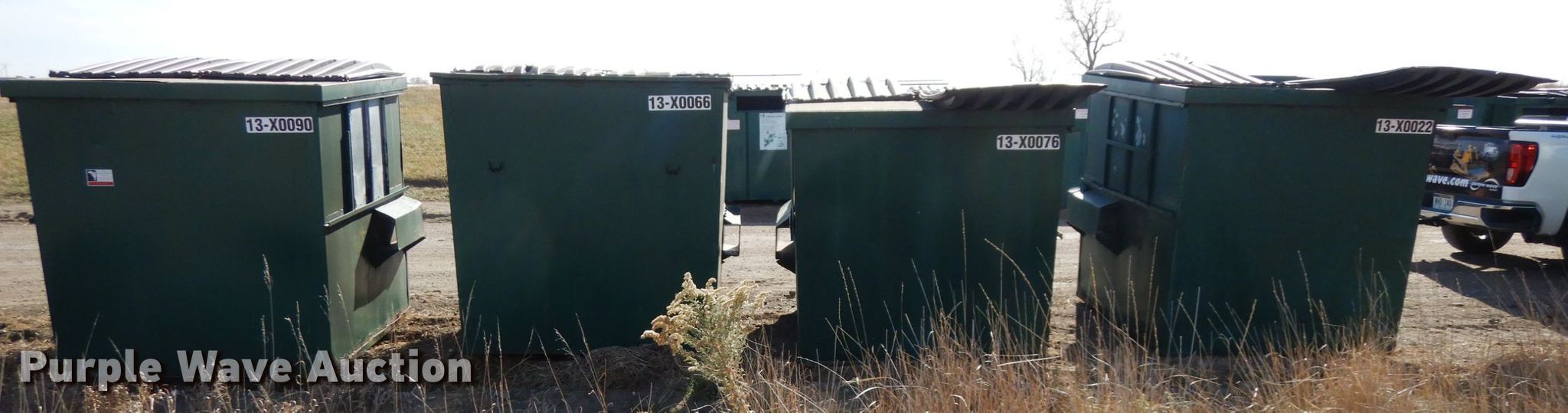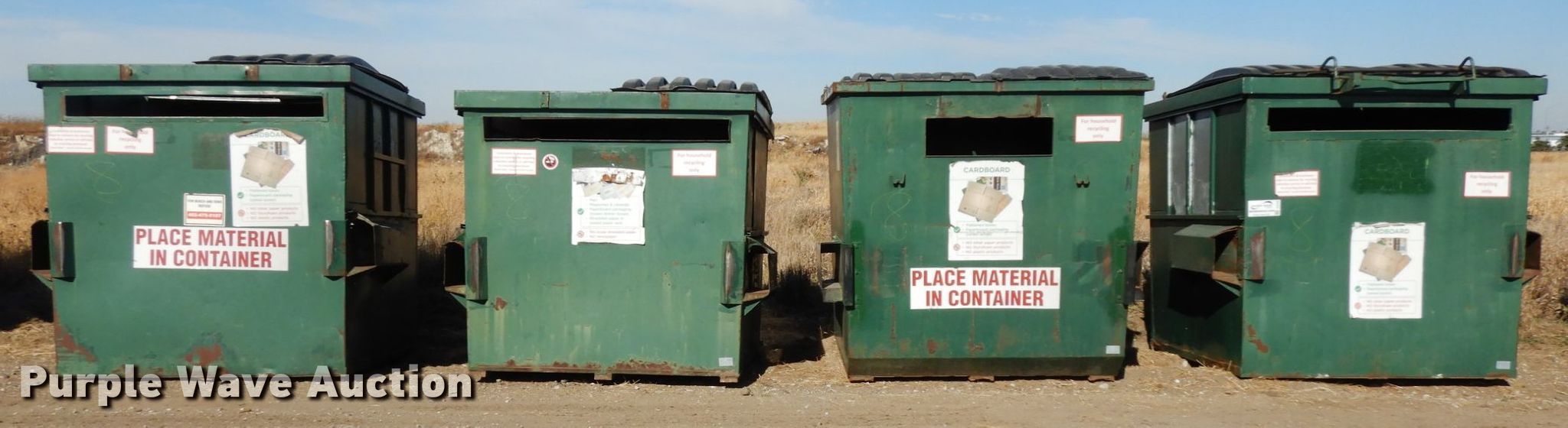 Purple Wave is selling a used Refuse or Compaction Equip. in Nebraska. This item is a (4) dumpsters with the following: Approx. 69"W x 74"D x 75"H, Eight yd. capacities, Apache FL8FD dumpster, EIN 13-X0090, 13-X0066, 13-X0076, 13-X0022, Unit# 8